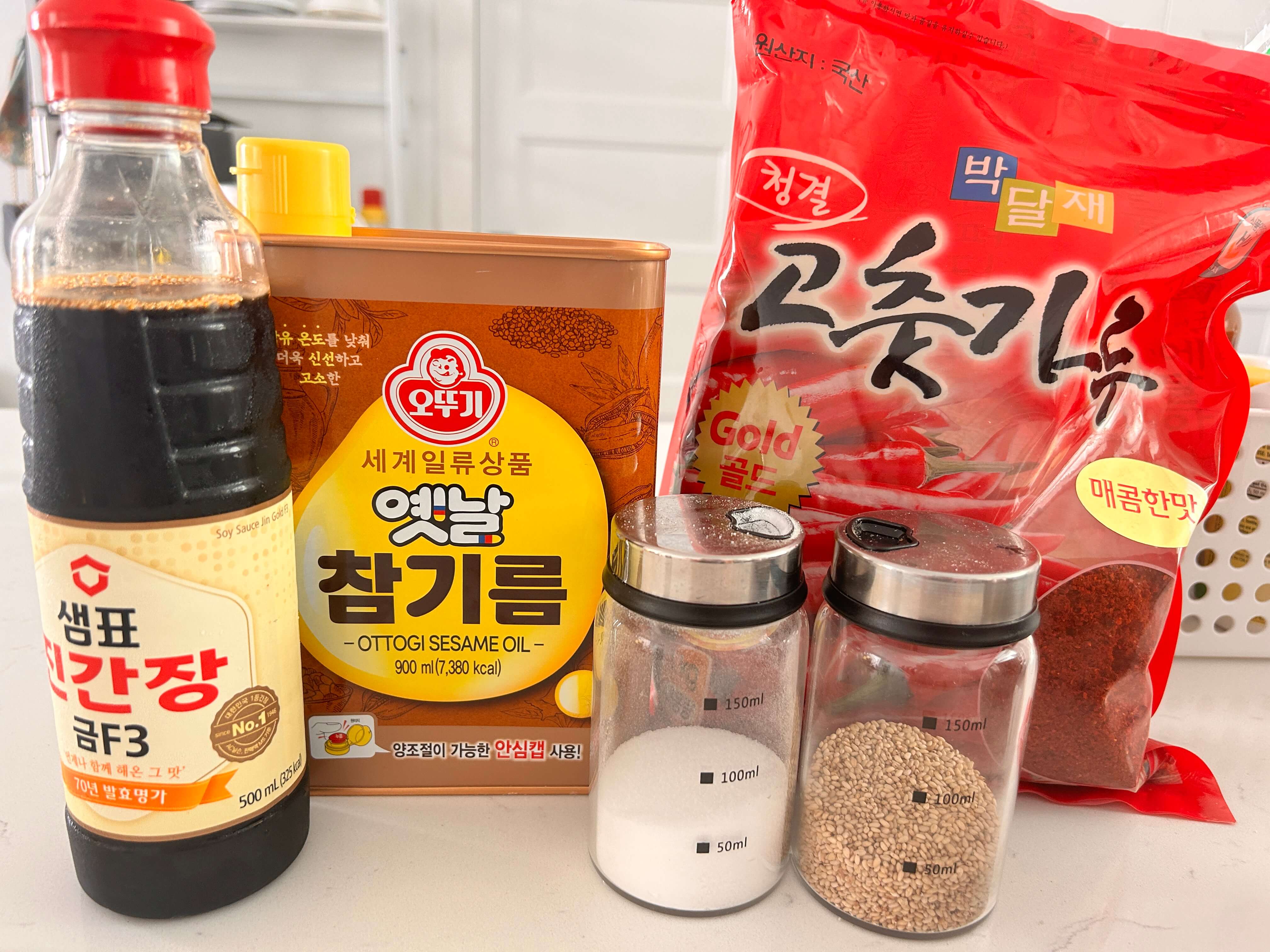 5. 고춧가루, 간장, 다진 마늘, 참기름, 소금, 깨를 준비해 줍니다.