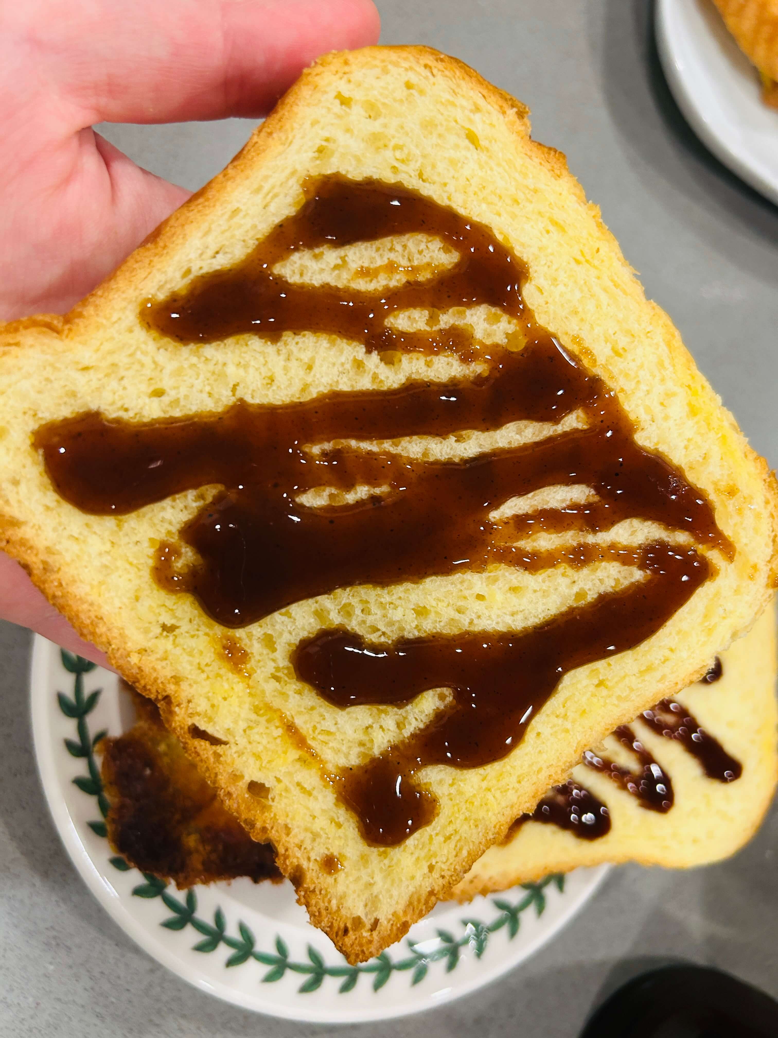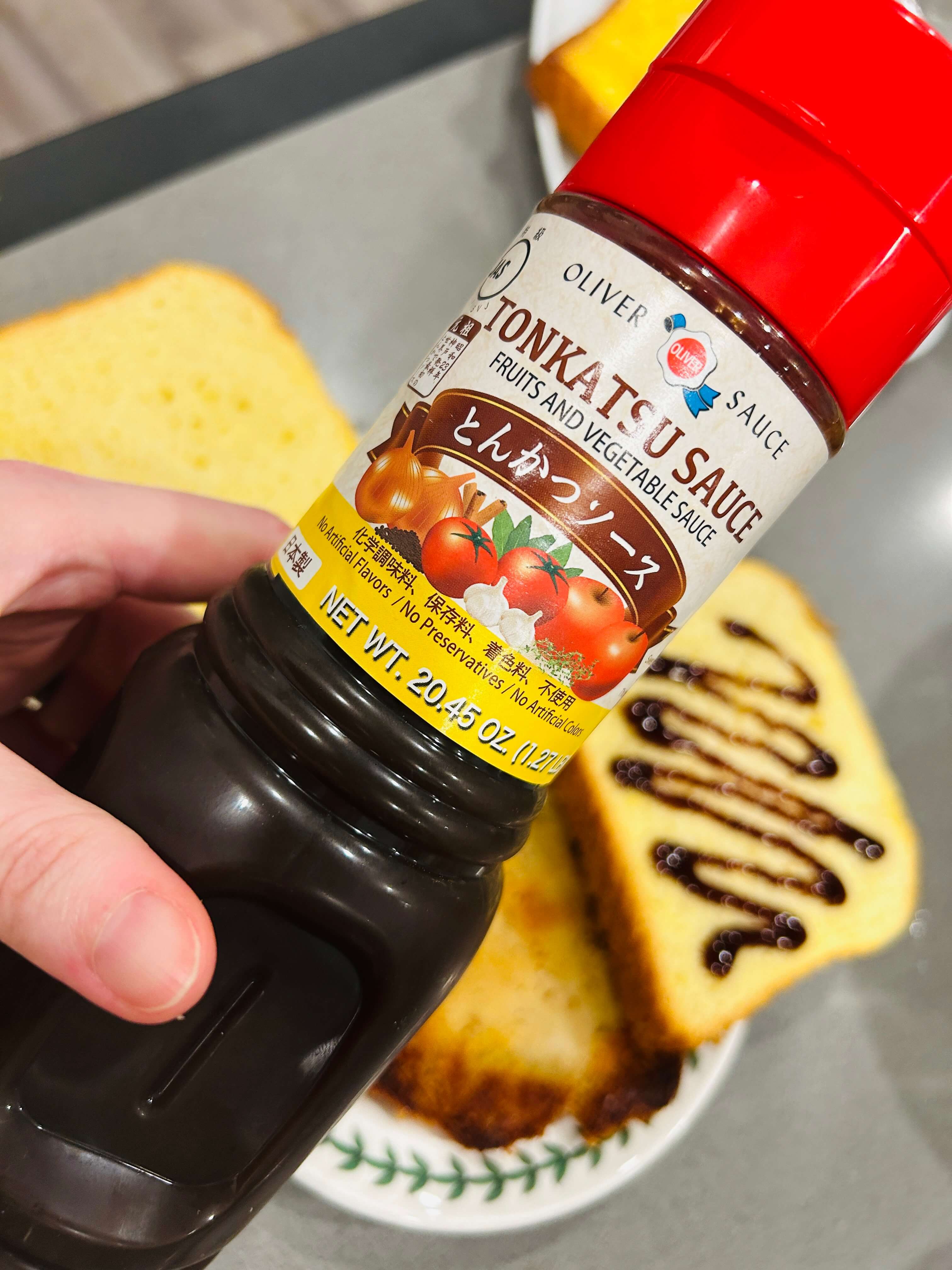 3. 식빵 안쪽에 돈까스 소스를 뿌려줍니다.
