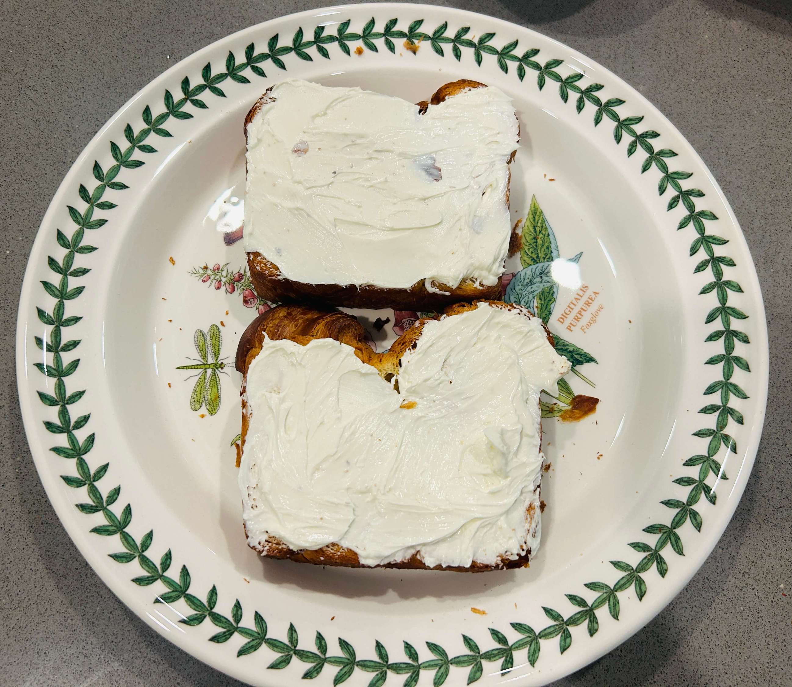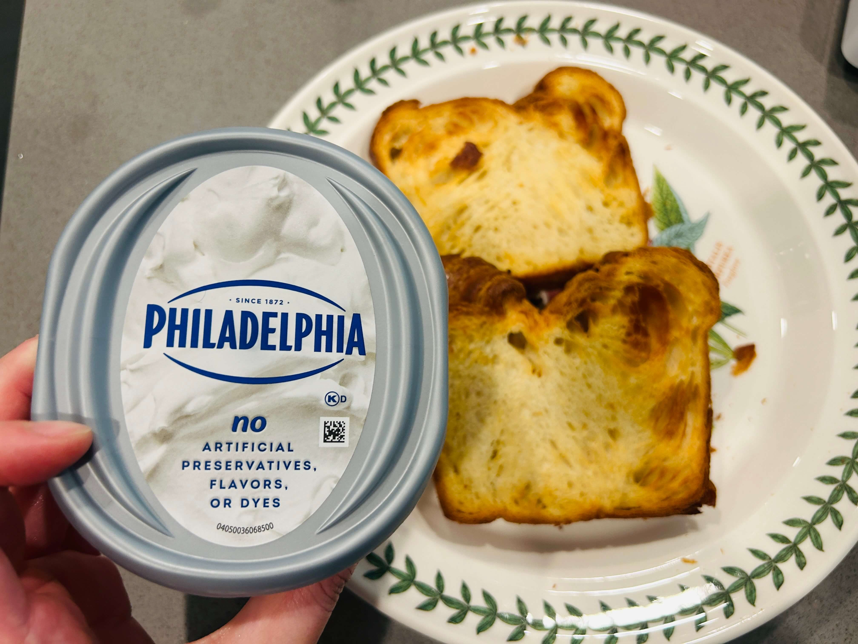 8. 구운 식빵에 크림치즈를 듬뿍 발라줍니다.