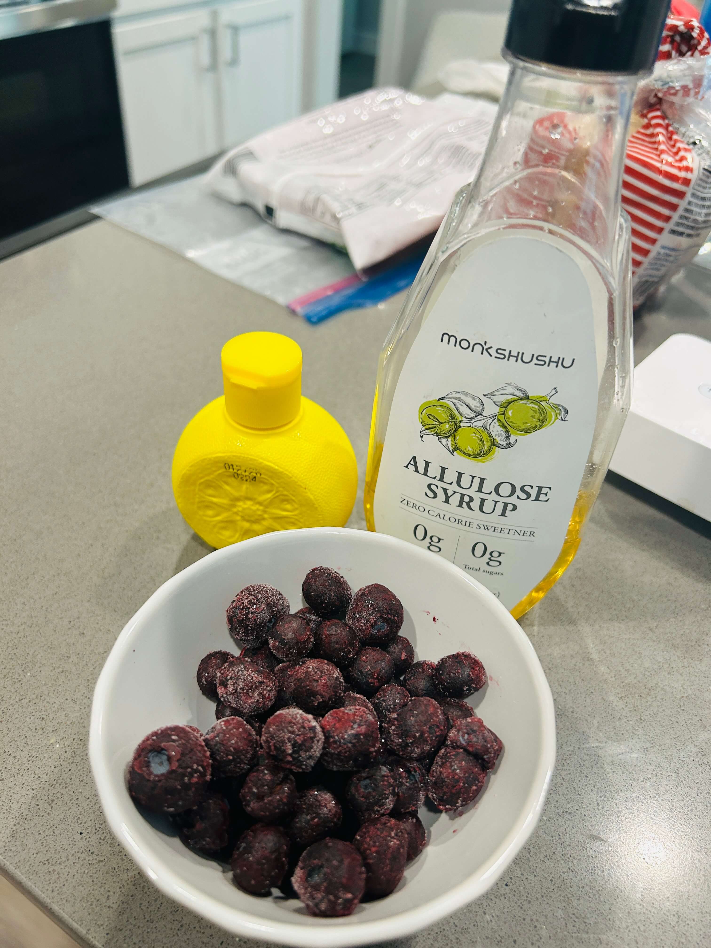 2. 블루베리잼을 만들기 위해 냉동블루베리, 알룰로스(설탕), 레몬즙을 준비해 줍니다.