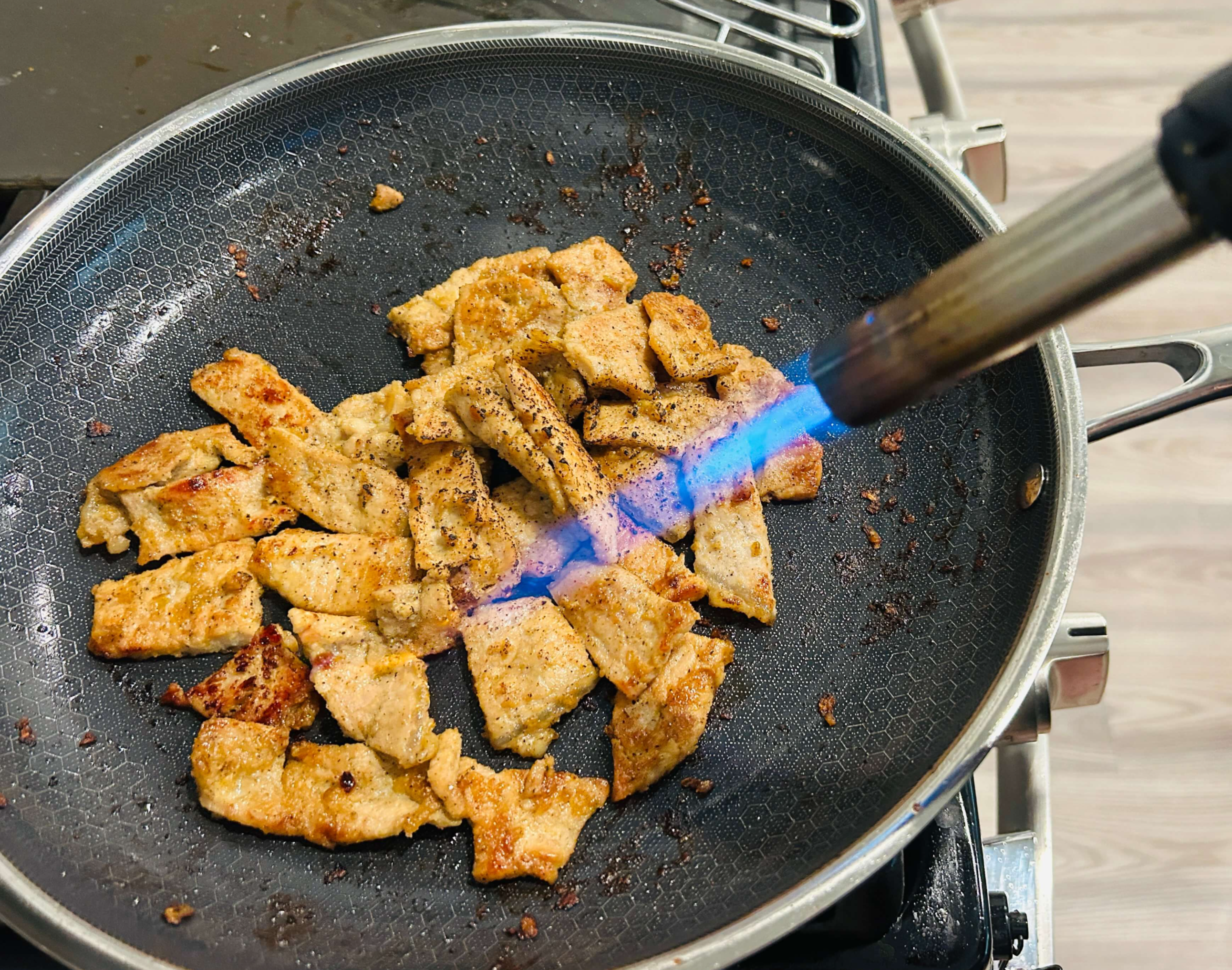 8. 구워진 고기에 토치로 불향을 입혀 줍니다.
