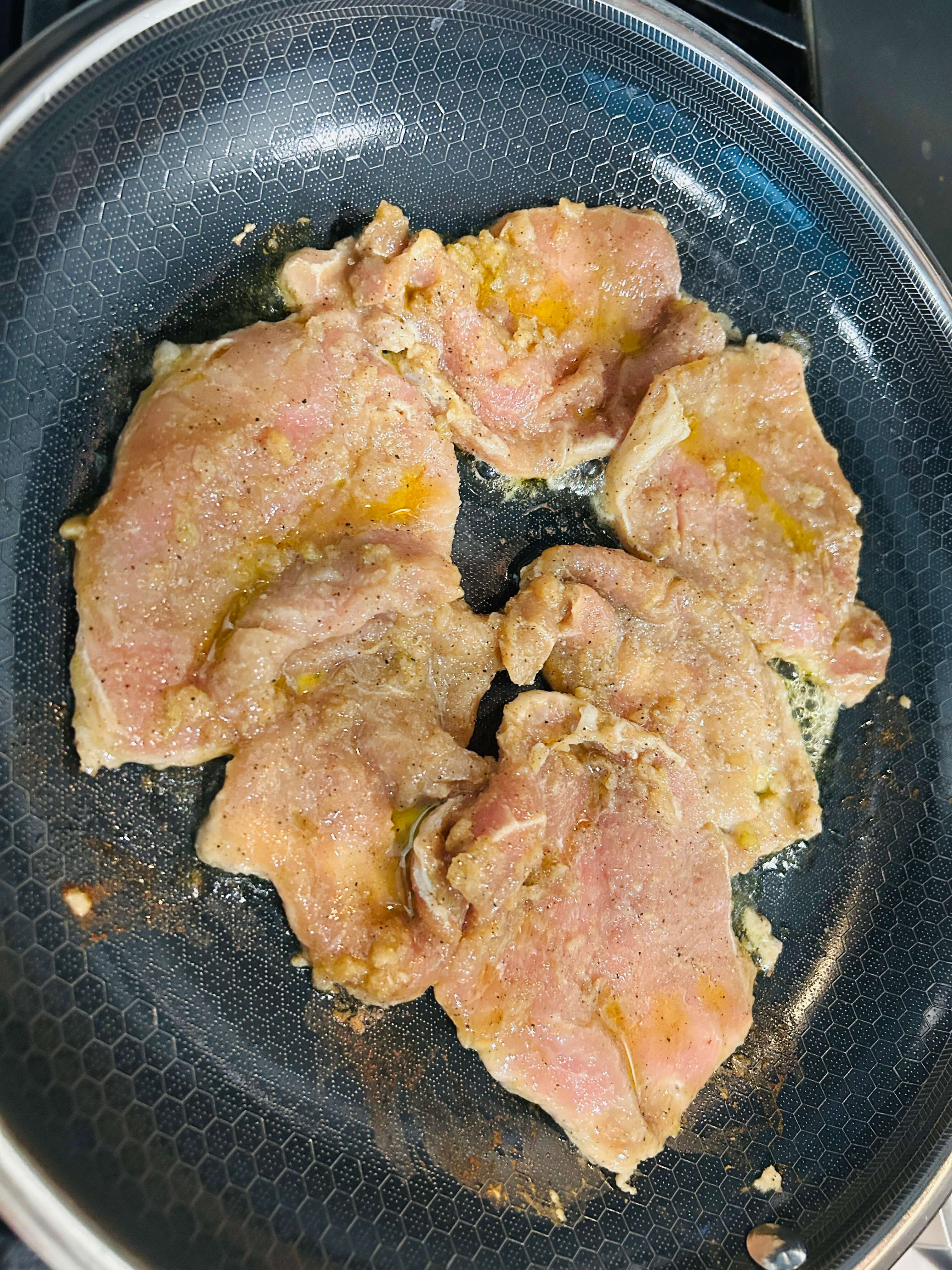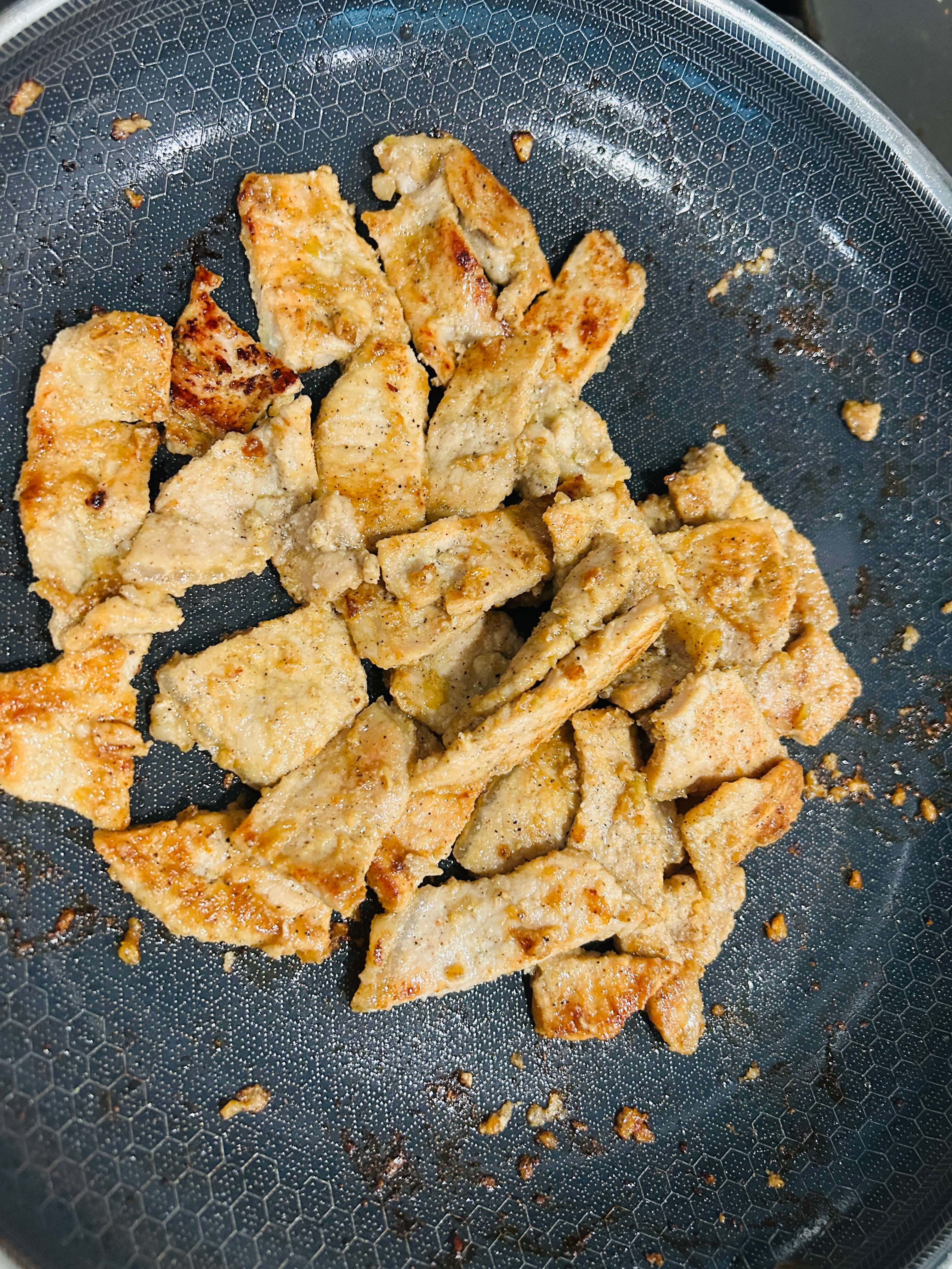 7. 팬에 양념된 고기를 올려 앞뒤로 양념이 타지 않게 잘 구워줍니다.