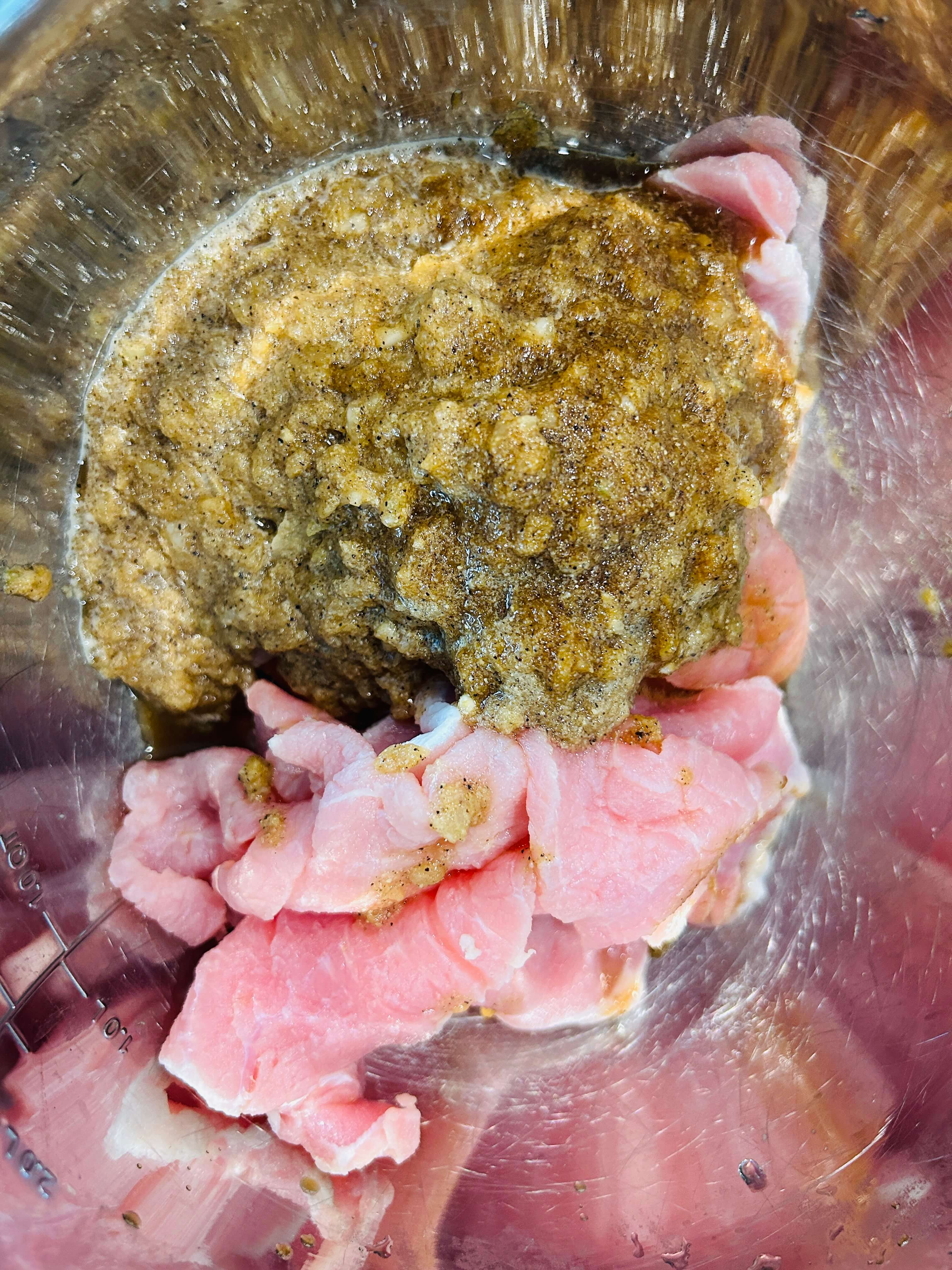 6. 준비된 고기에 양념을 넣고 잘 버무려 줍니다.