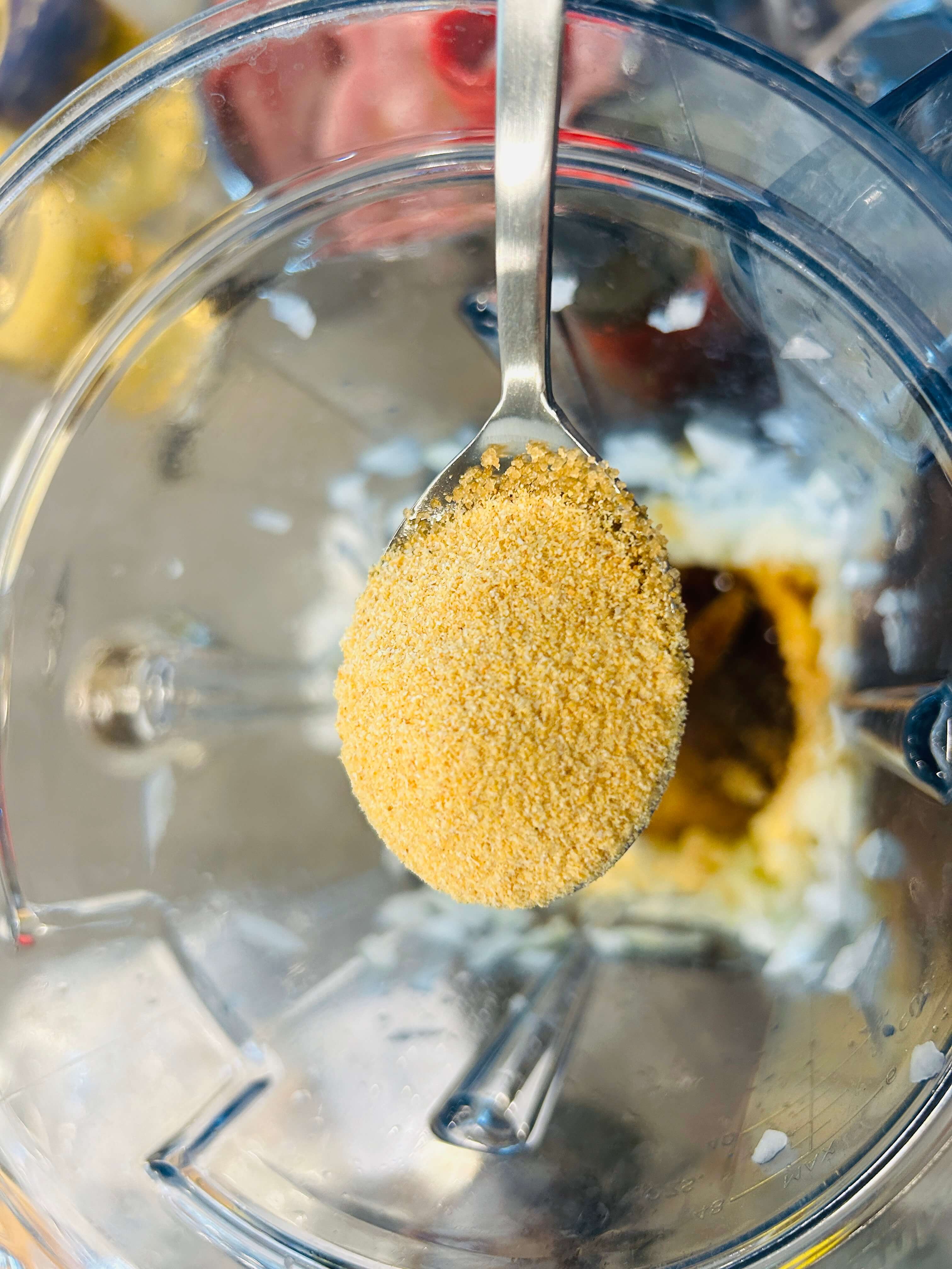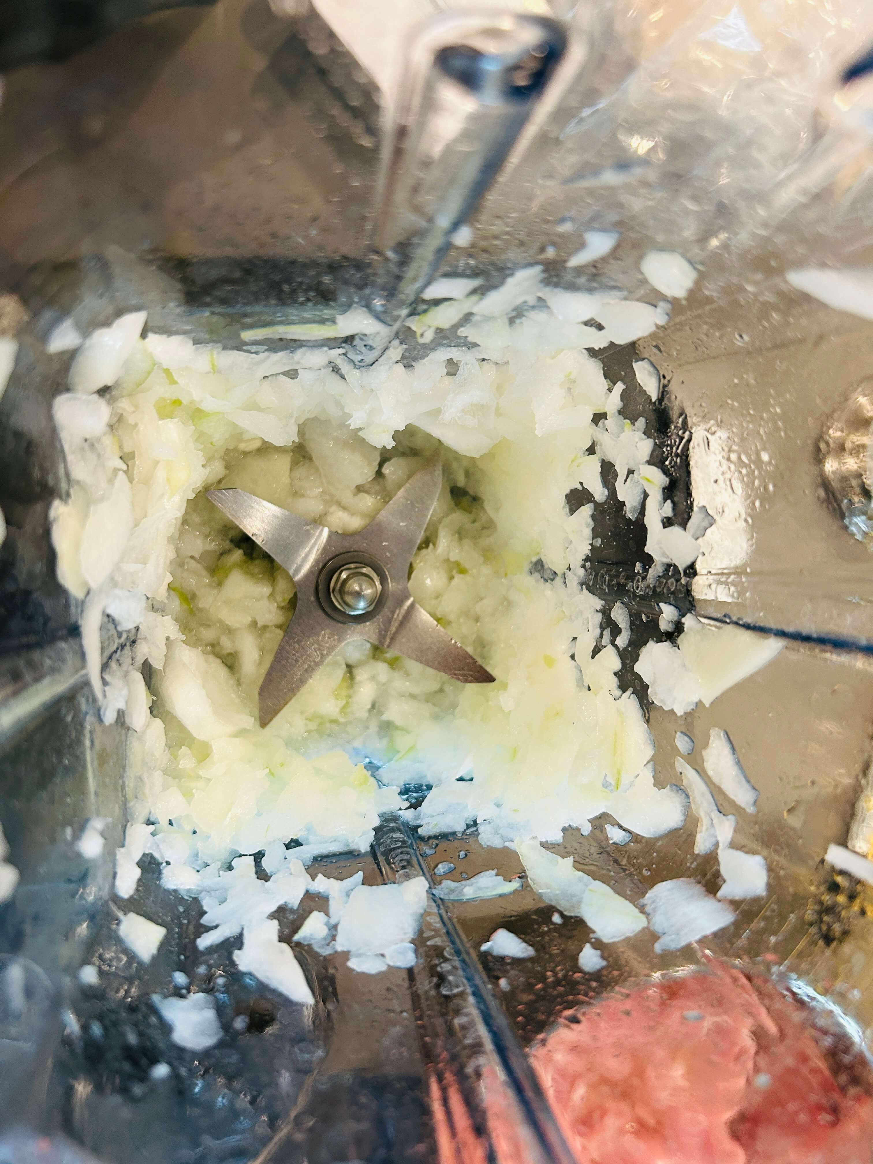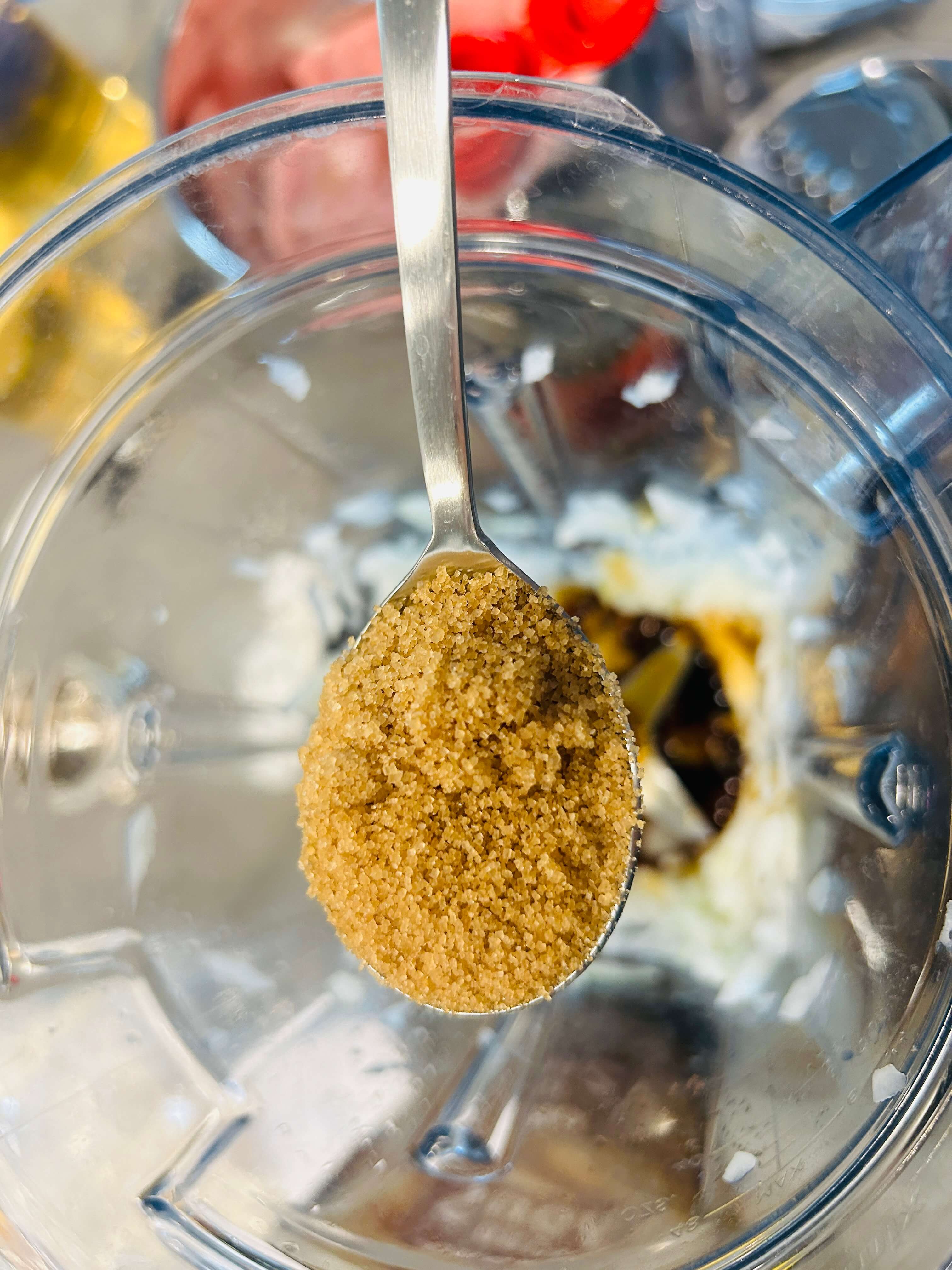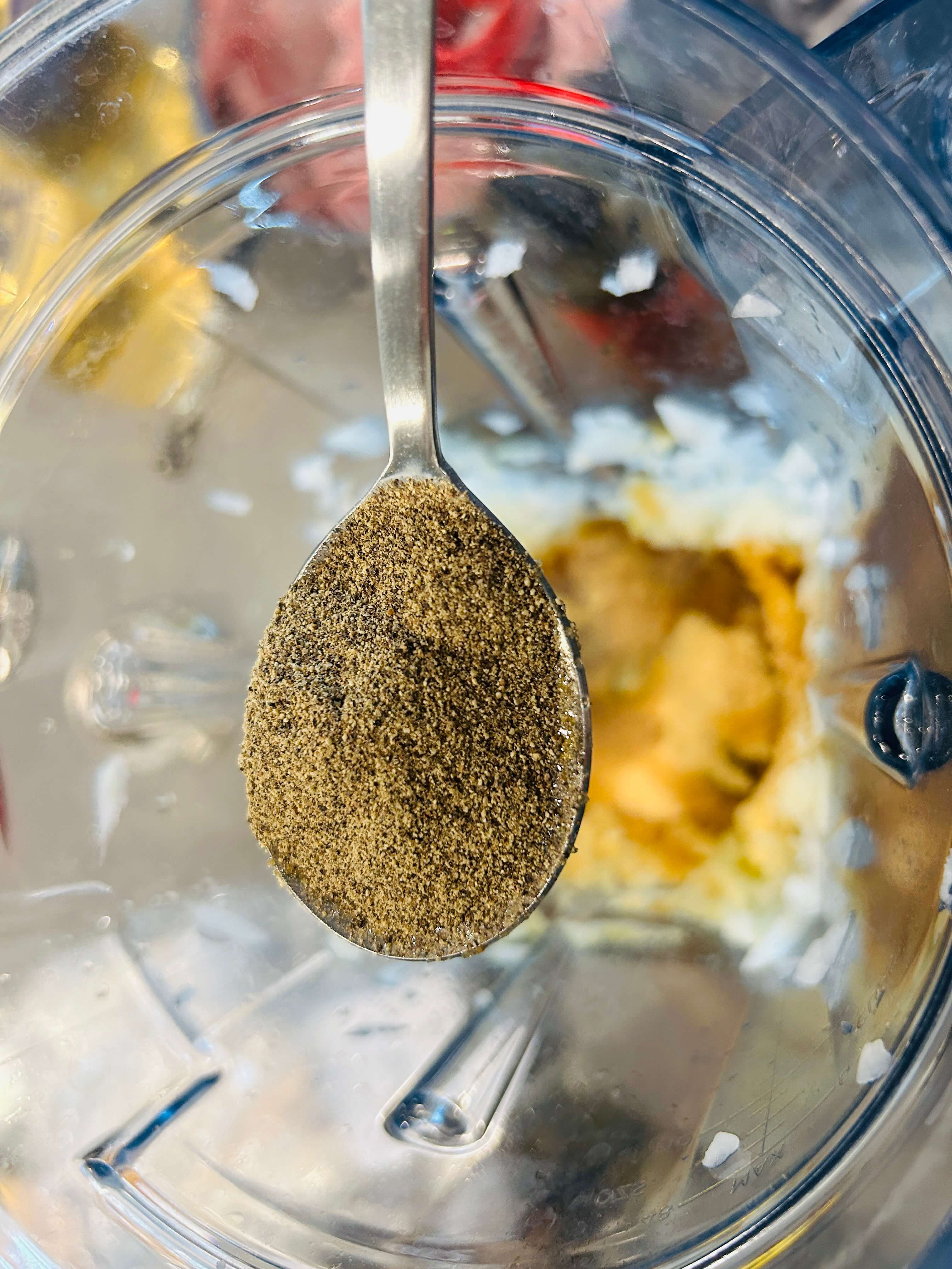 5. 간장 3 숟갈, 설탕 1 숟갈, 알룰로스 1숟갈, 마늘가루 2 숟갈, 후추 1 숟갈을 넣고 모두 갈아줍니다.