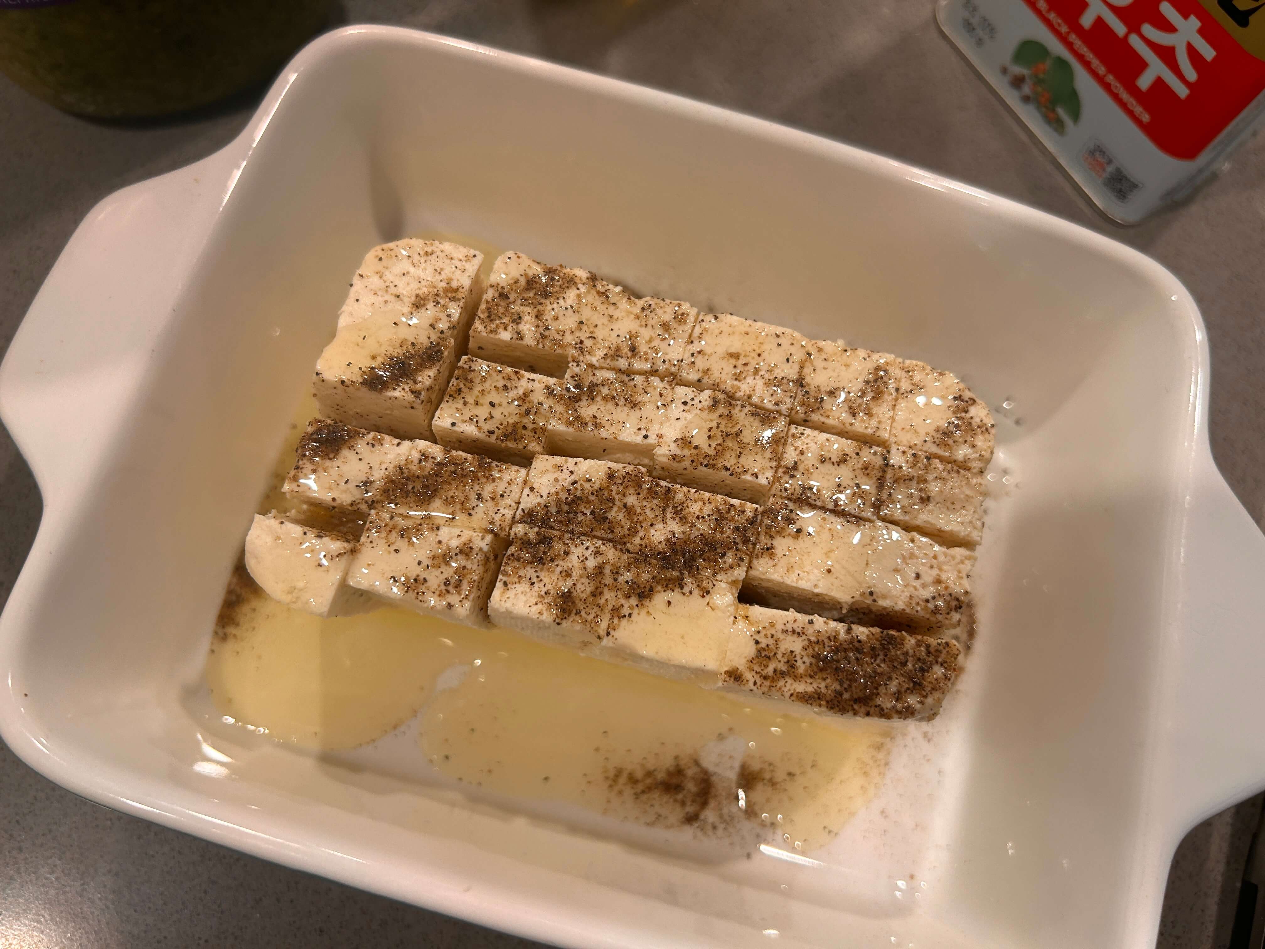 1. 두부를 오븐용그릇에 올려 밑부분을 남기고 이렇게 칼집을 내줍니다.