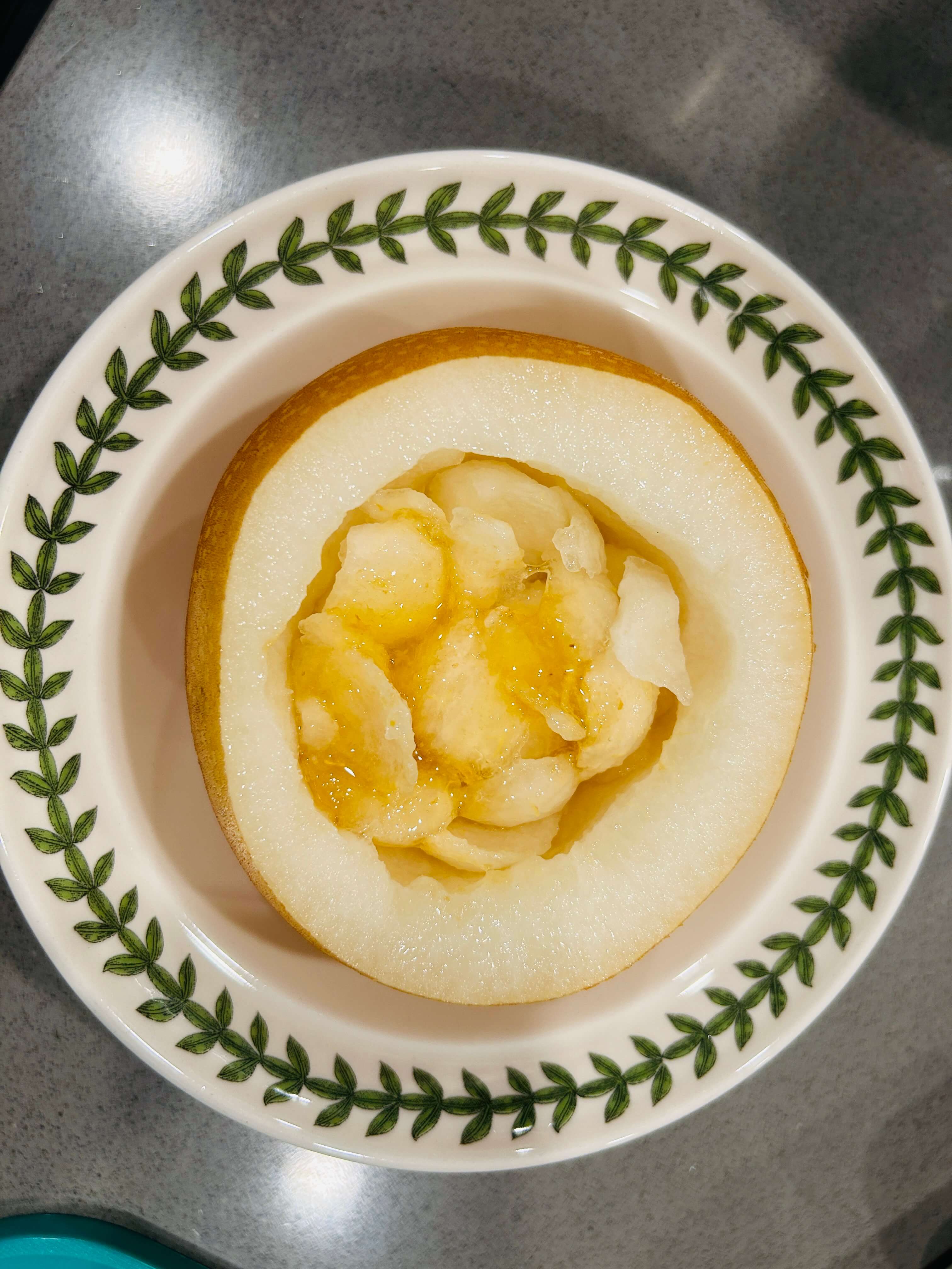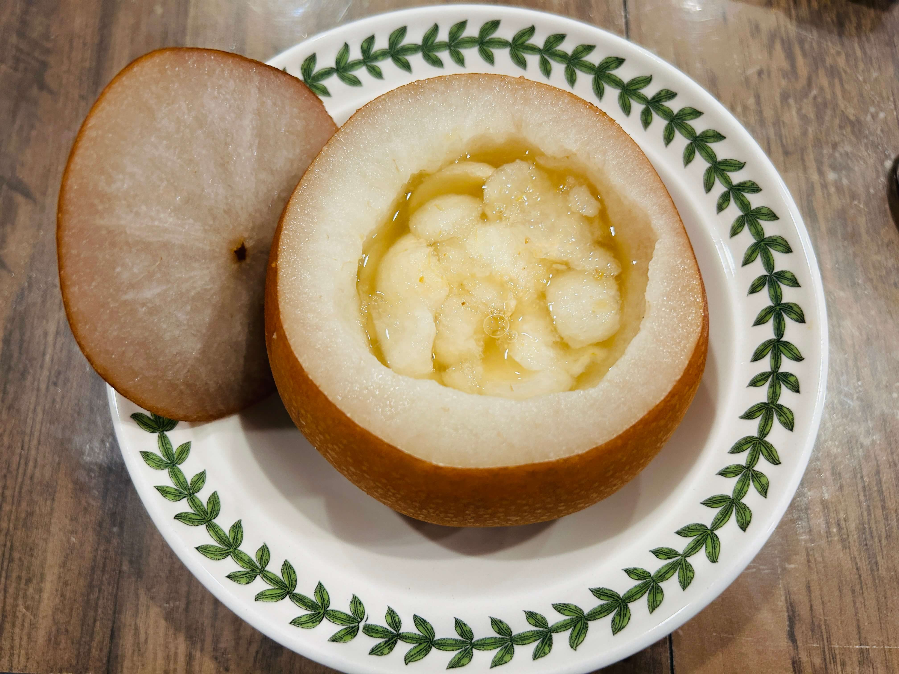 감기기운이 있을 때 배 한 개 이렇게 먹어주시면 든든하고 좋습니다. 배숙은 몸을 따뜻하게 해 주고 수분을 보충시켜 면역력을 향상해 줍니다. 기침에도 탁월하기 때문에 감기 걸리신 분들에게도 추천드립니다.