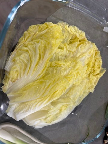 3. 전자레인지 용기에 배추를 넣고 돌려 살짝 쪄 줍니다.