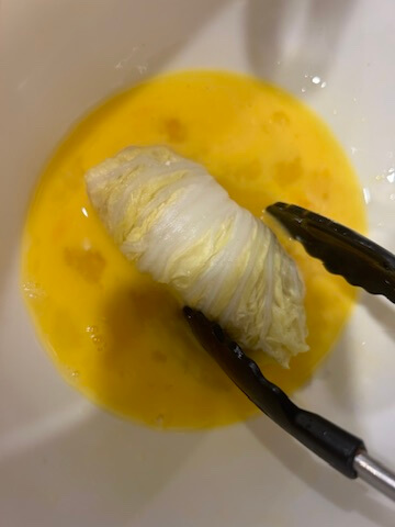 6. 배추말이를 달걀물에 살짝 입혀 줍니다.