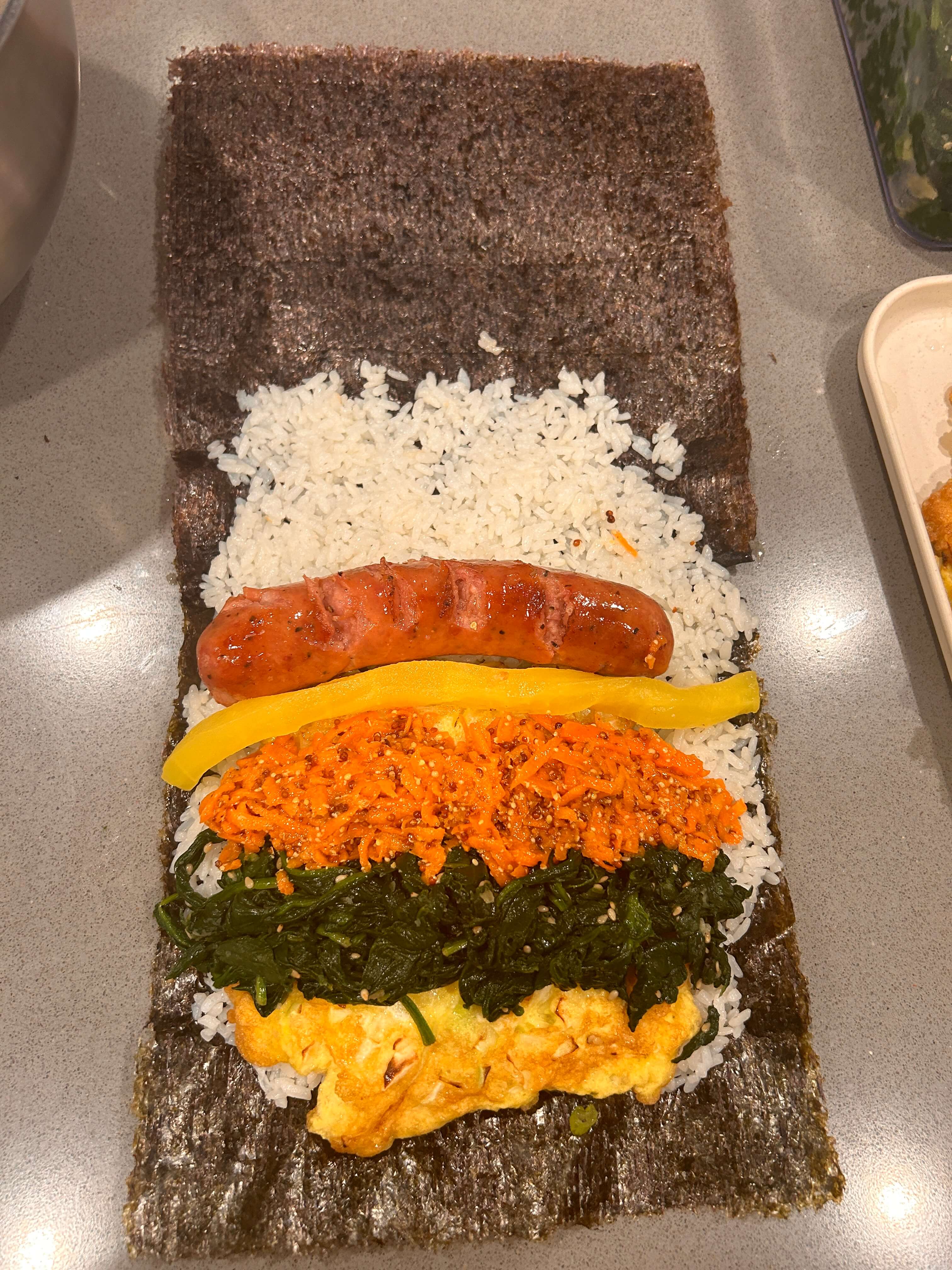 17. 밥 빼고 이렇게 양배추계란, 시금치, 당근라페, 소시지, 단무지로 만도 김밥을 만들어줍니다.