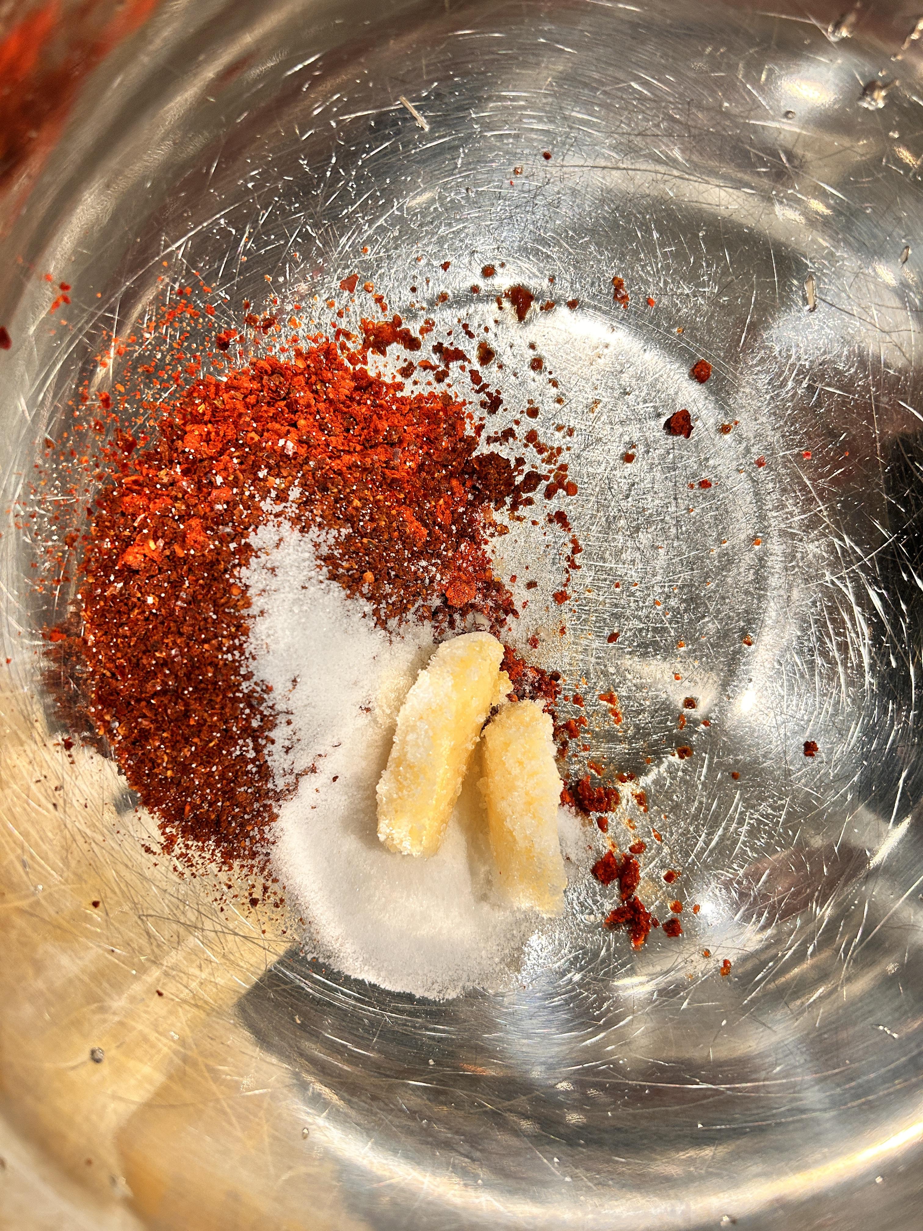5. 고춧가루 6 숟갈, 설탕 2 숟갈, 다진 마늘 2 숟갈을 넣어줍니다.