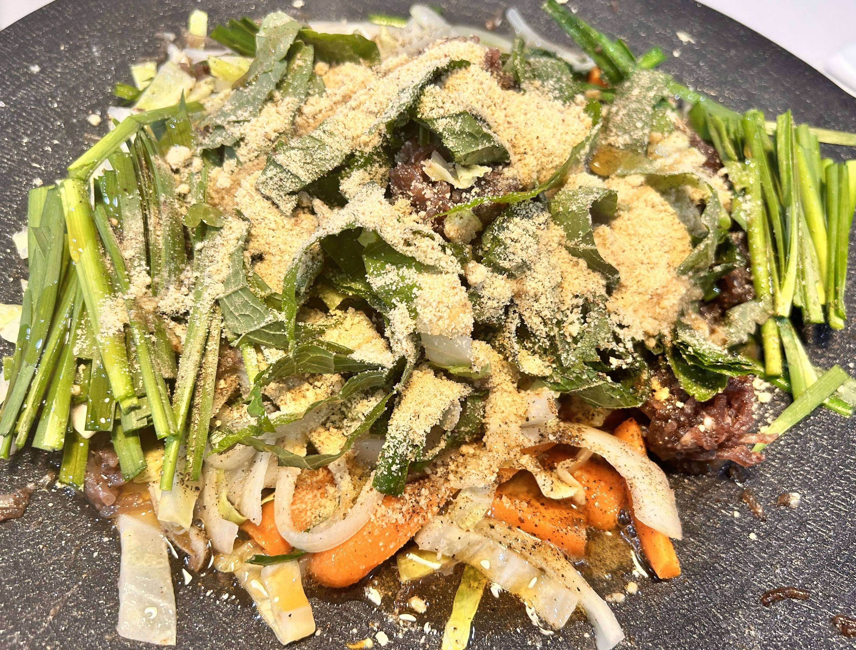 10. 야채 숨이 죽을 때, 부추와 깻잎을 넣어줍니다.