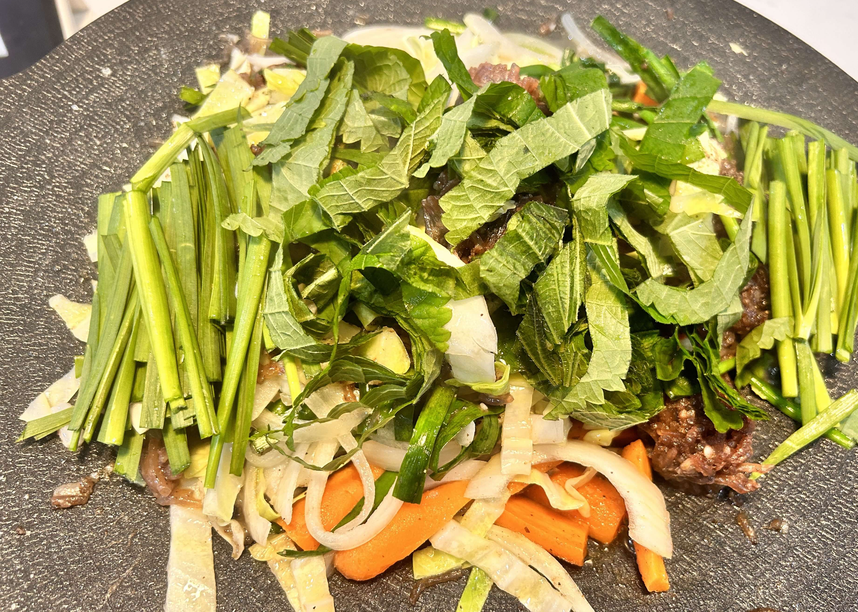 10. 야채 숨이 죽을 때, 부추와 깻잎을 넣어줍니다.