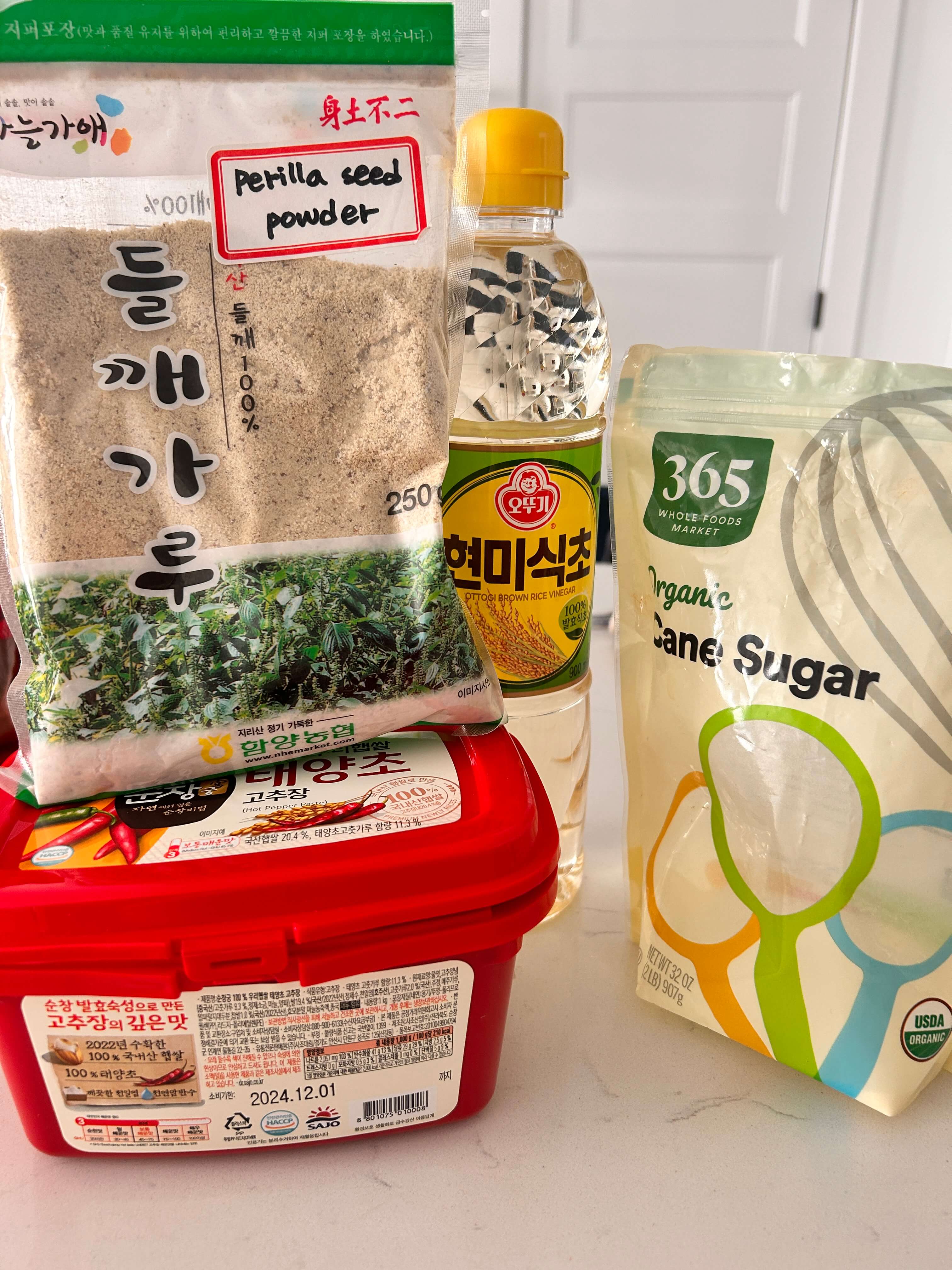 4. 고추장, 설탕, 식초, 고추장, 들깨가루를 준비해 줍니다.