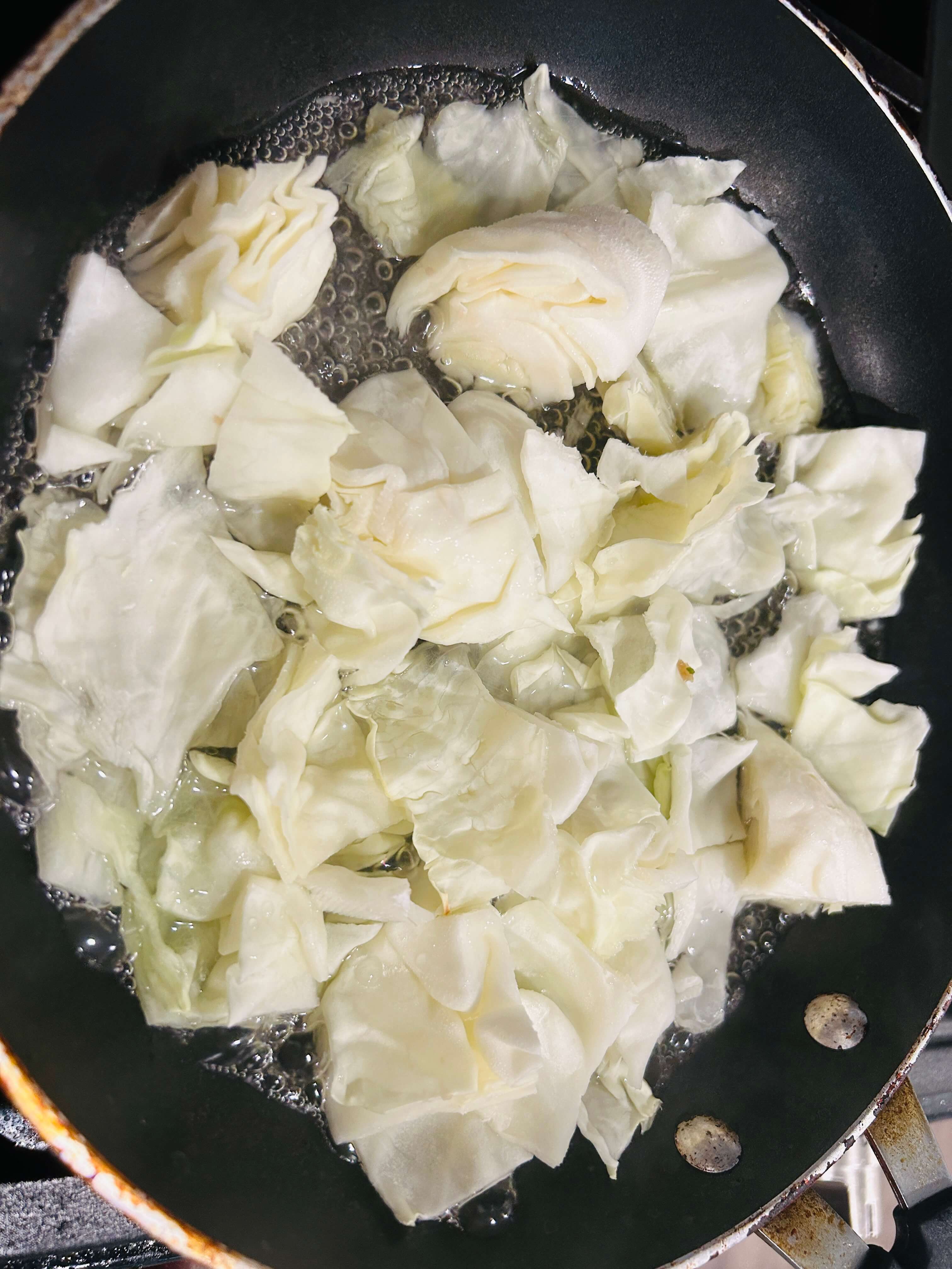 1. 프라이팬에 양배추와 물을 살짝 넣어 익혀줍니다.