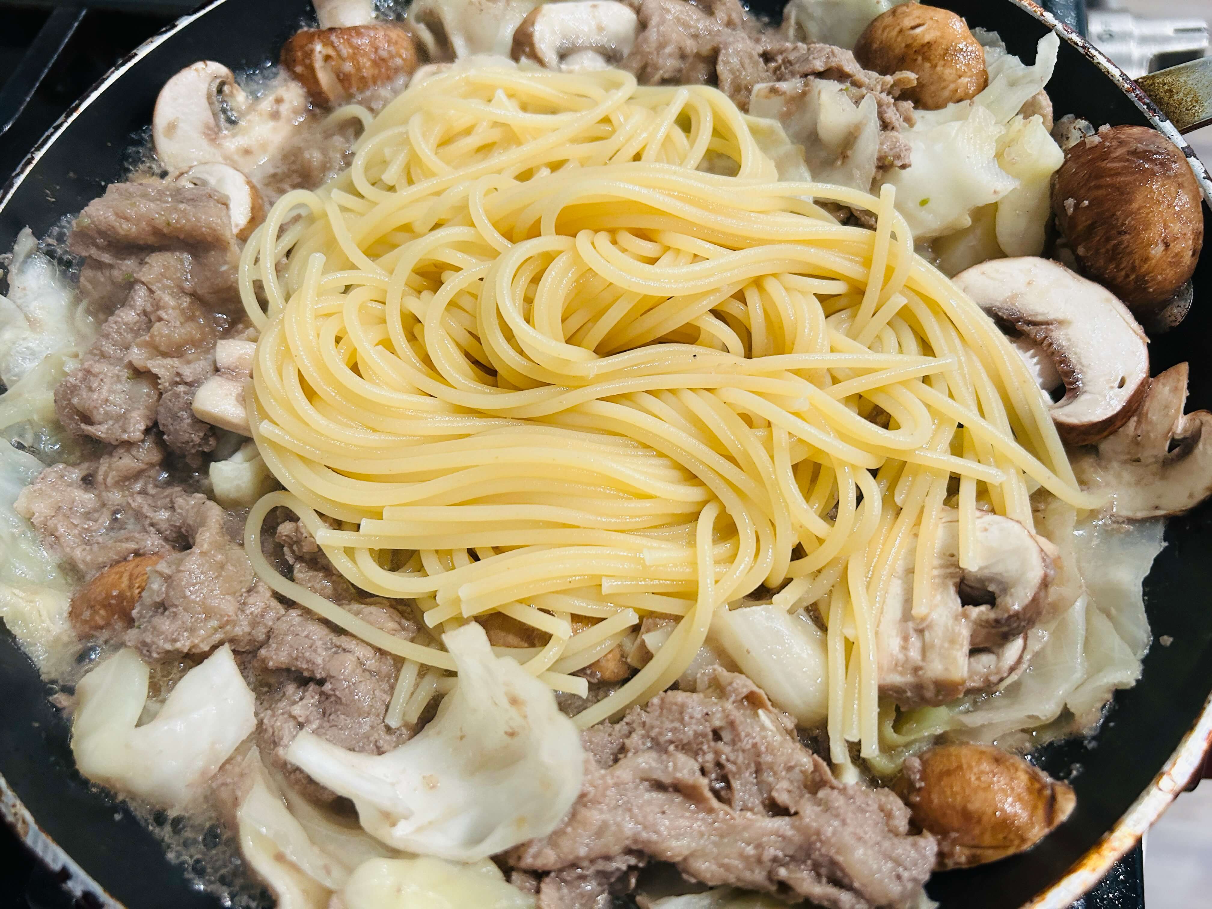 2. 양배추 숨이 죽을 때쯤 불고기를 넣어 같이 익혀줍니다.