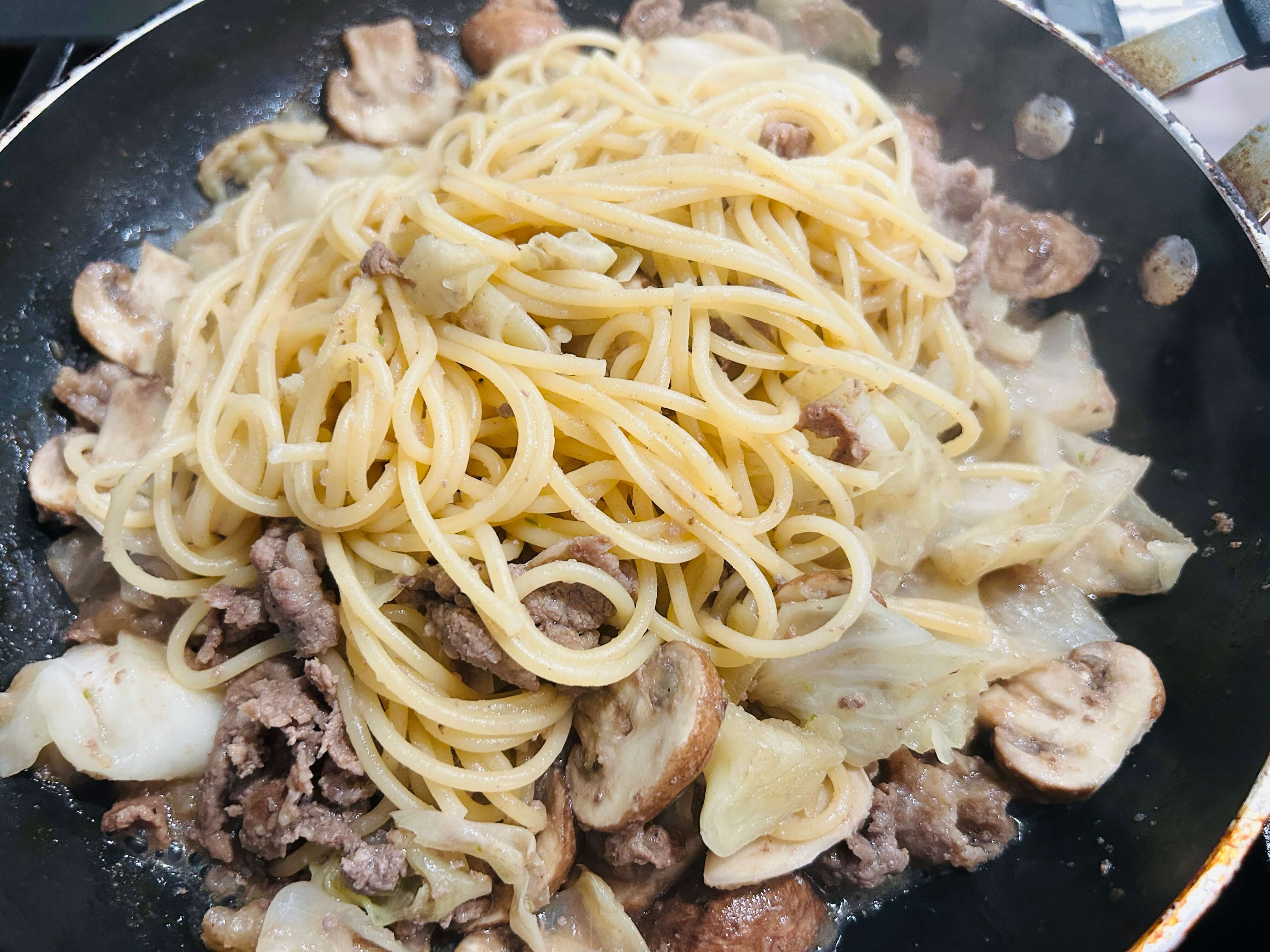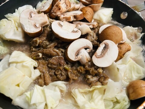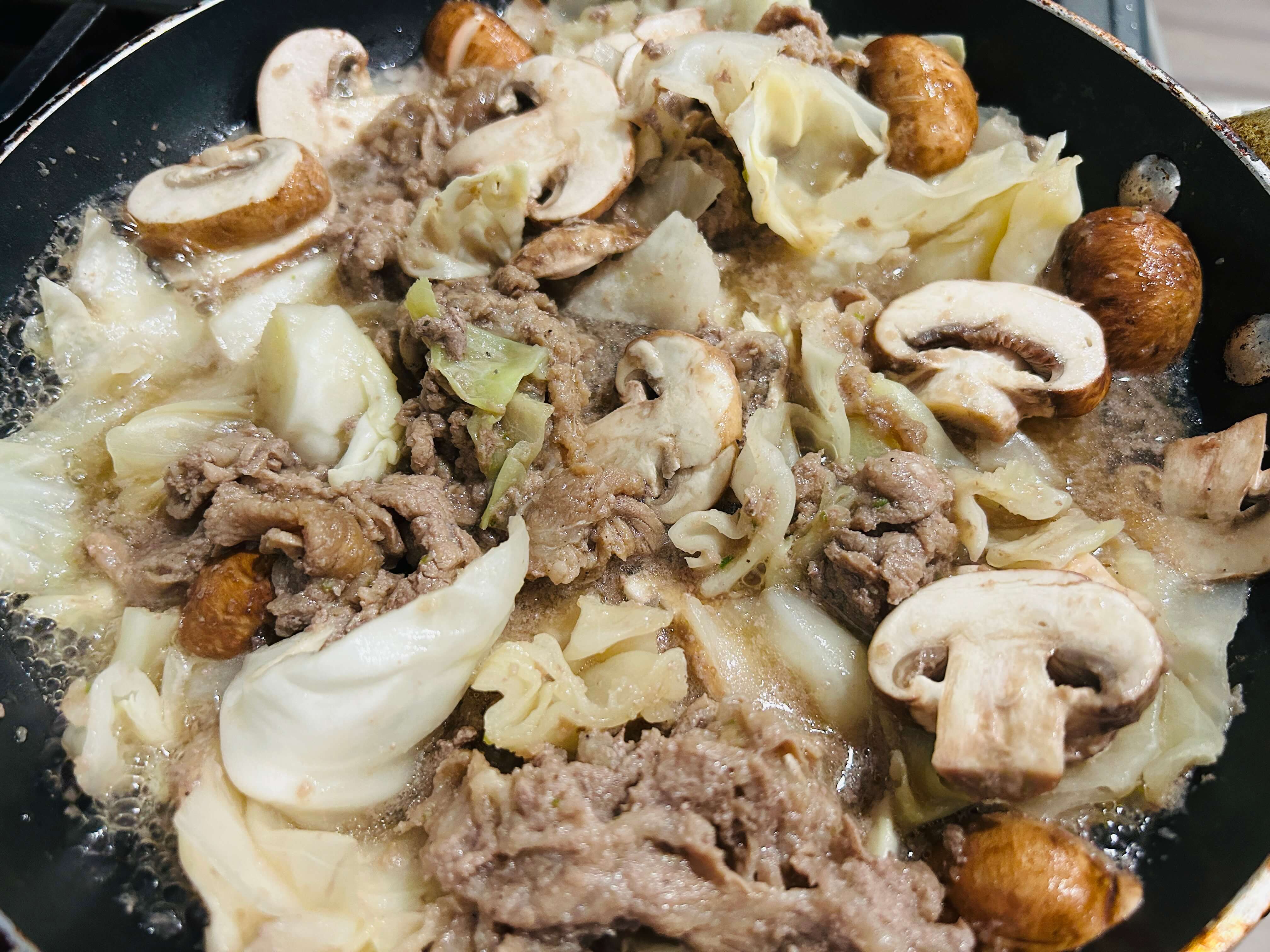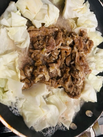 2. 양배추 숨이 죽을 때쯤 불고기를 넣어 같이 익혀줍니다.