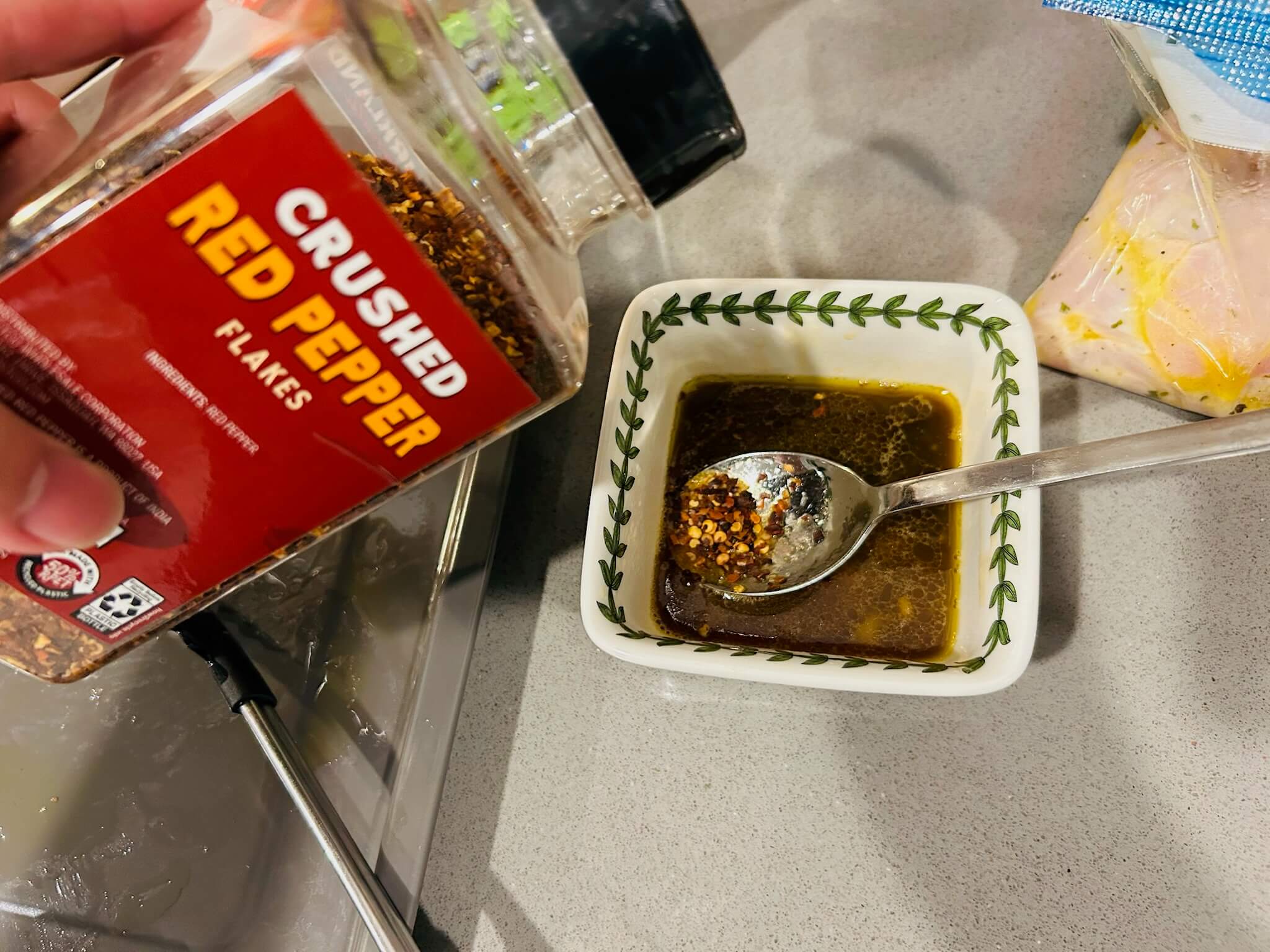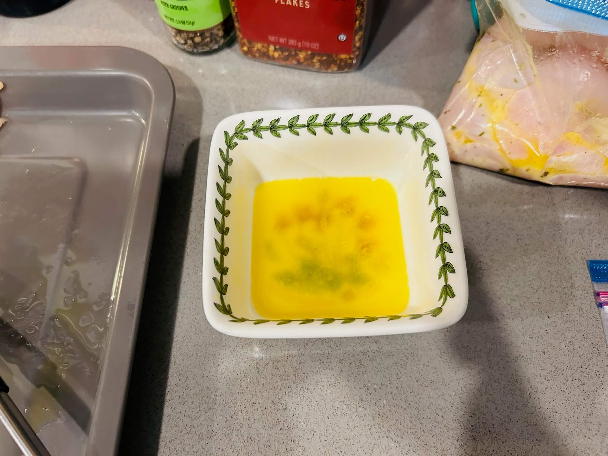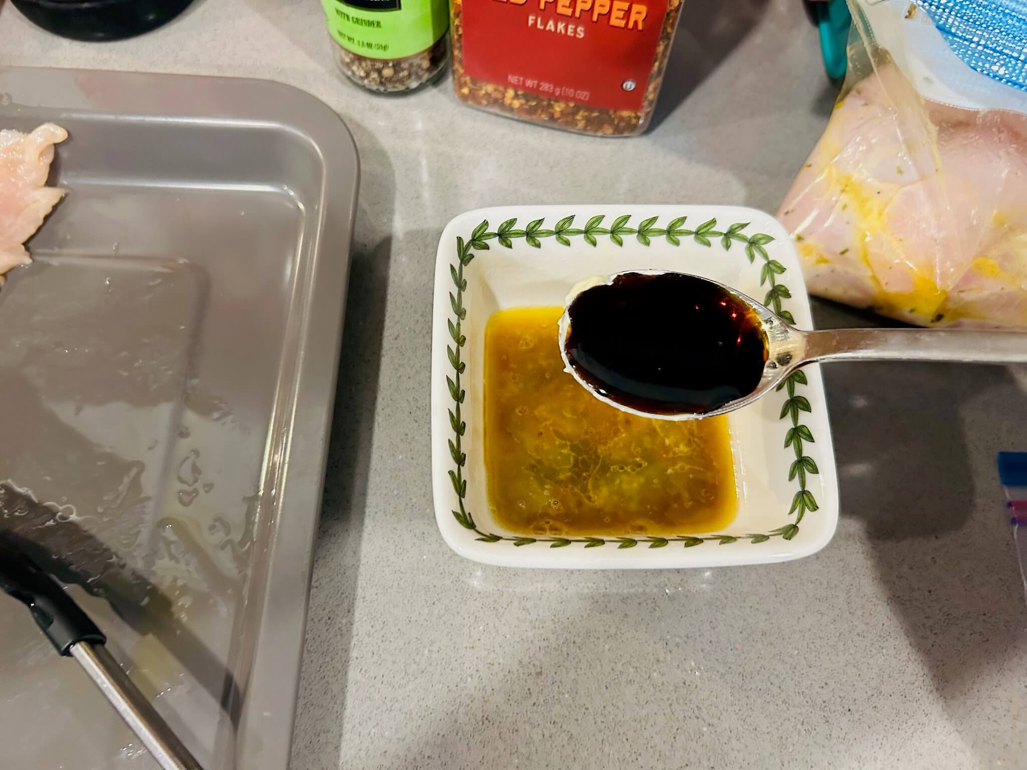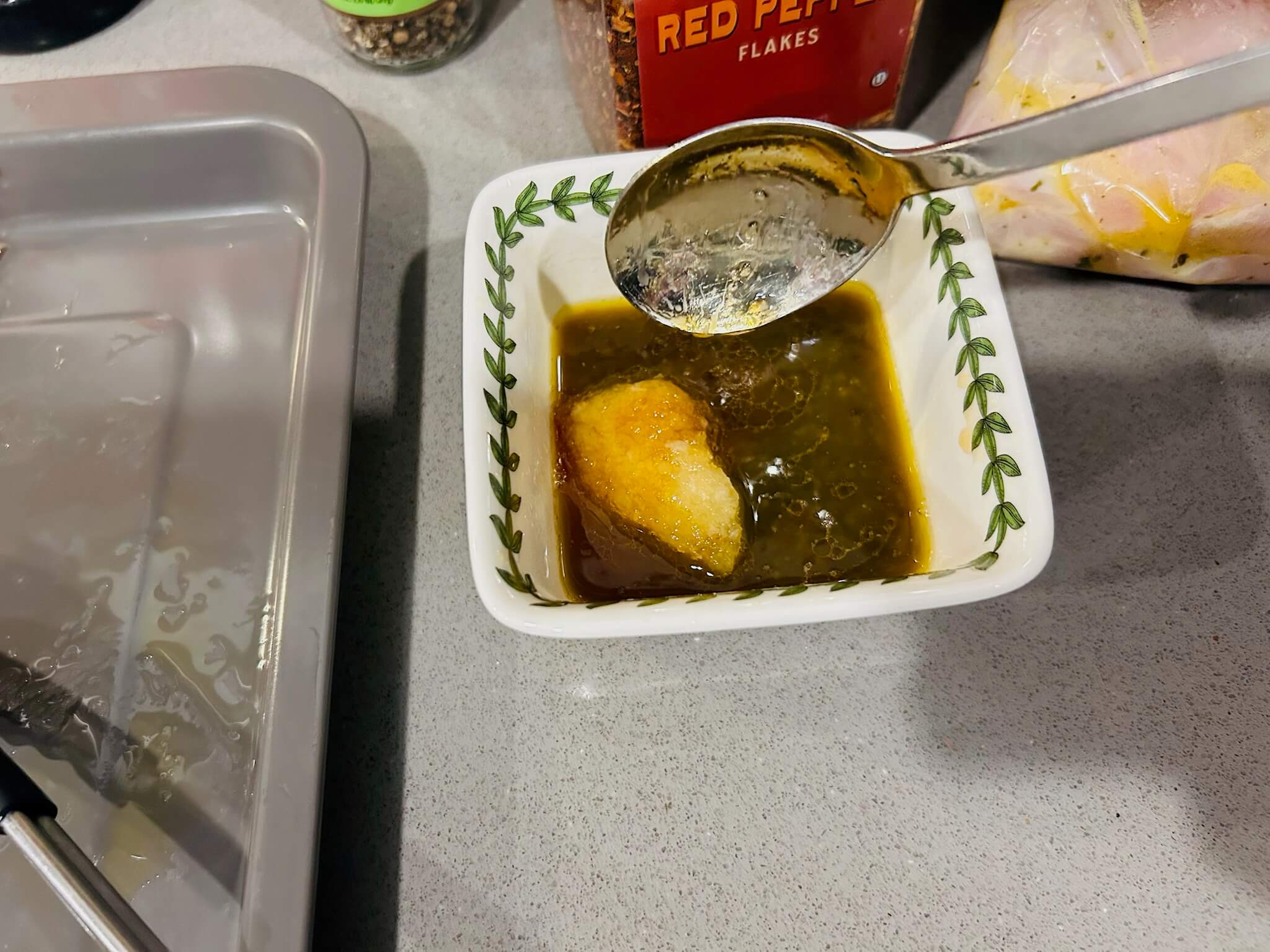 6. 녹인 버터에 간장 1 숟갈, 꿀 1 숟갈, 다진마늘 1숟갈, 페페론치노 1숟갈, 후추 톡톡 뿌려 잘 섞어줍니다.