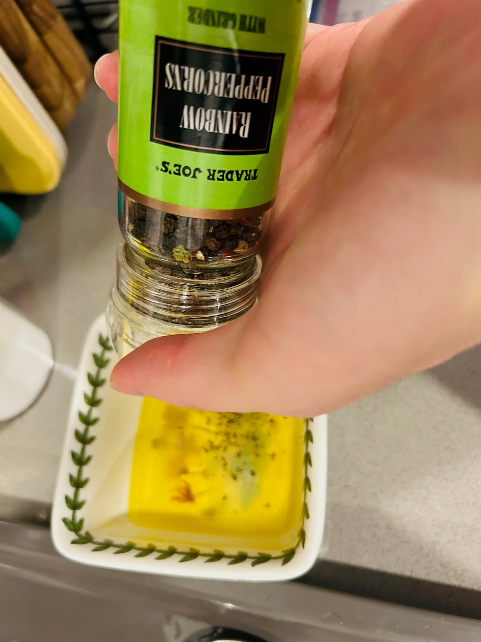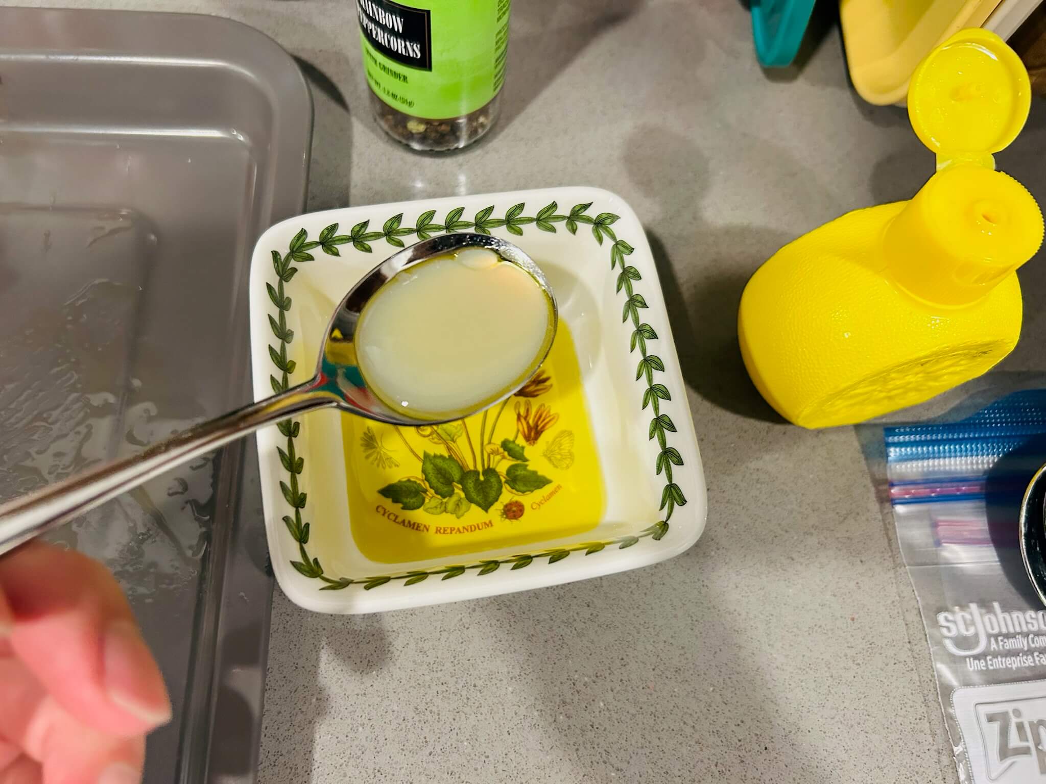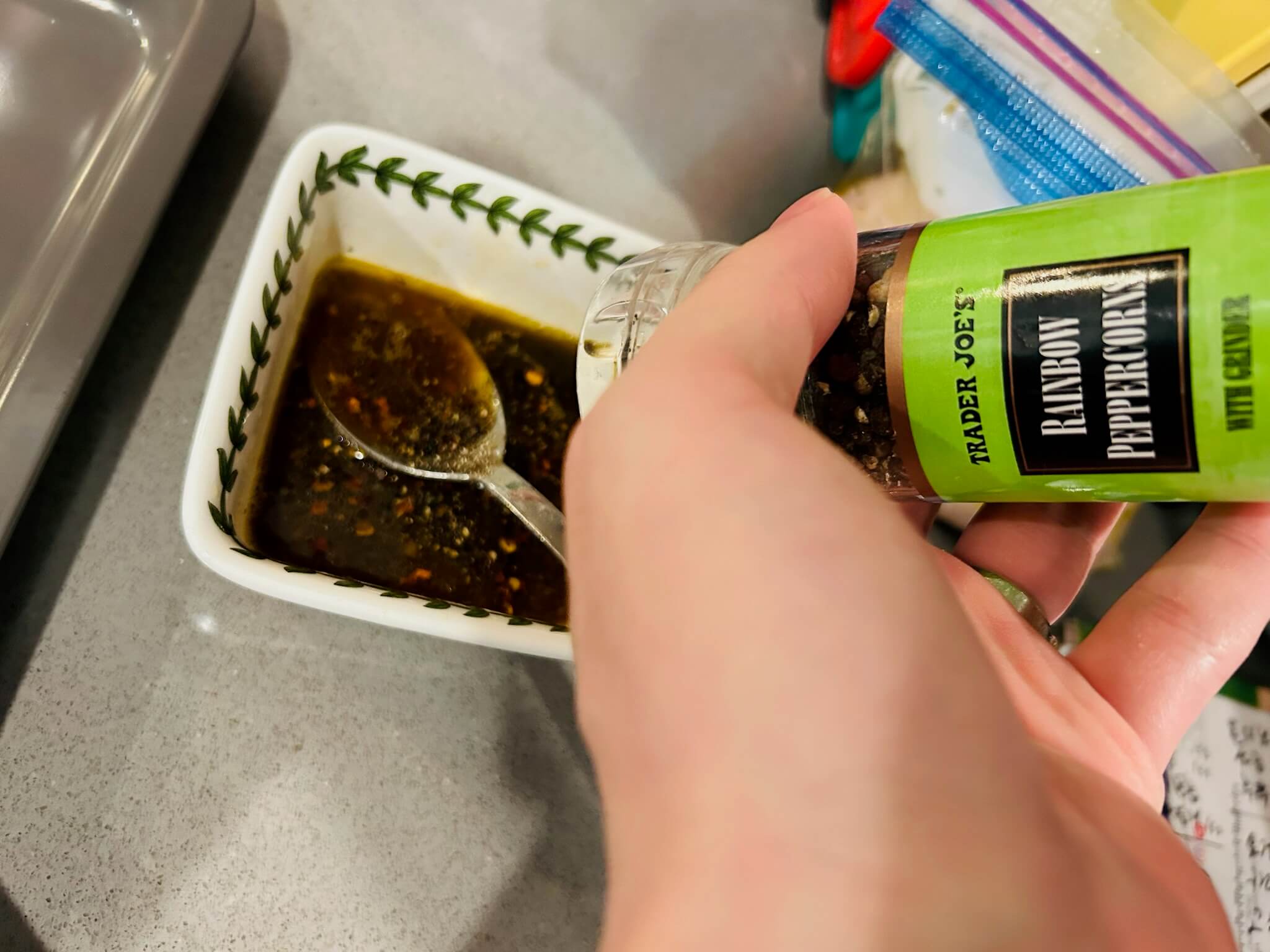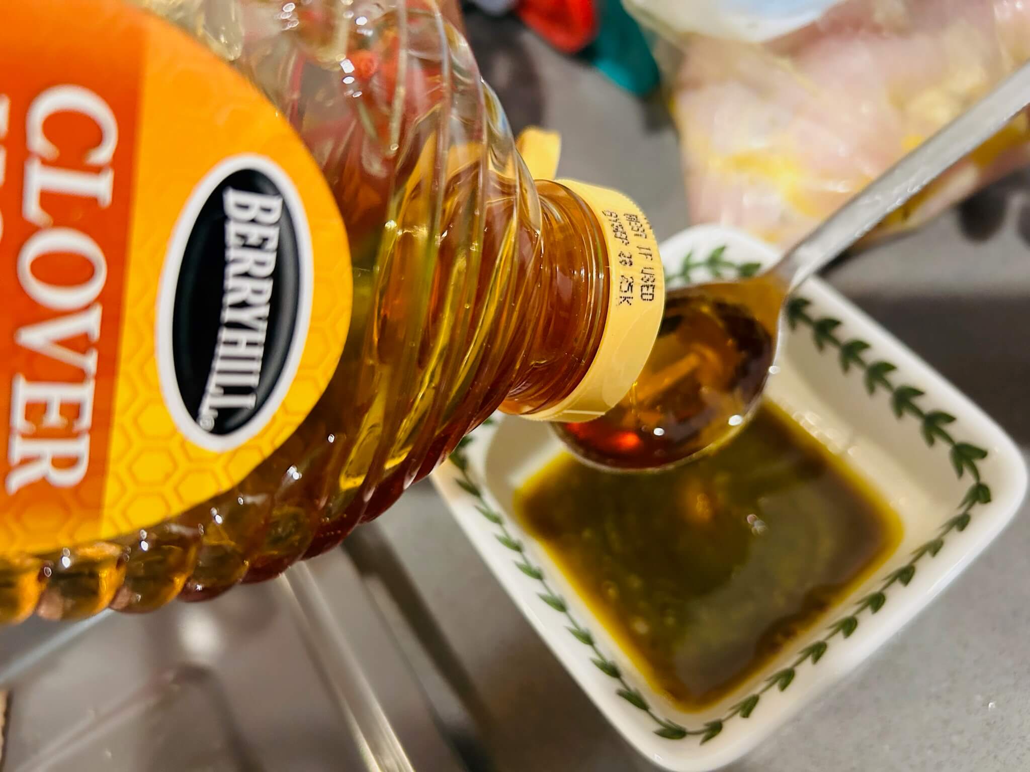 6. 녹인 버터에 간장 1 숟갈, 꿀 1 숟갈, 다진마늘 1숟갈, 페페론치노 1숟갈, 후추 톡톡 뿌려 잘 섞어줍니다.