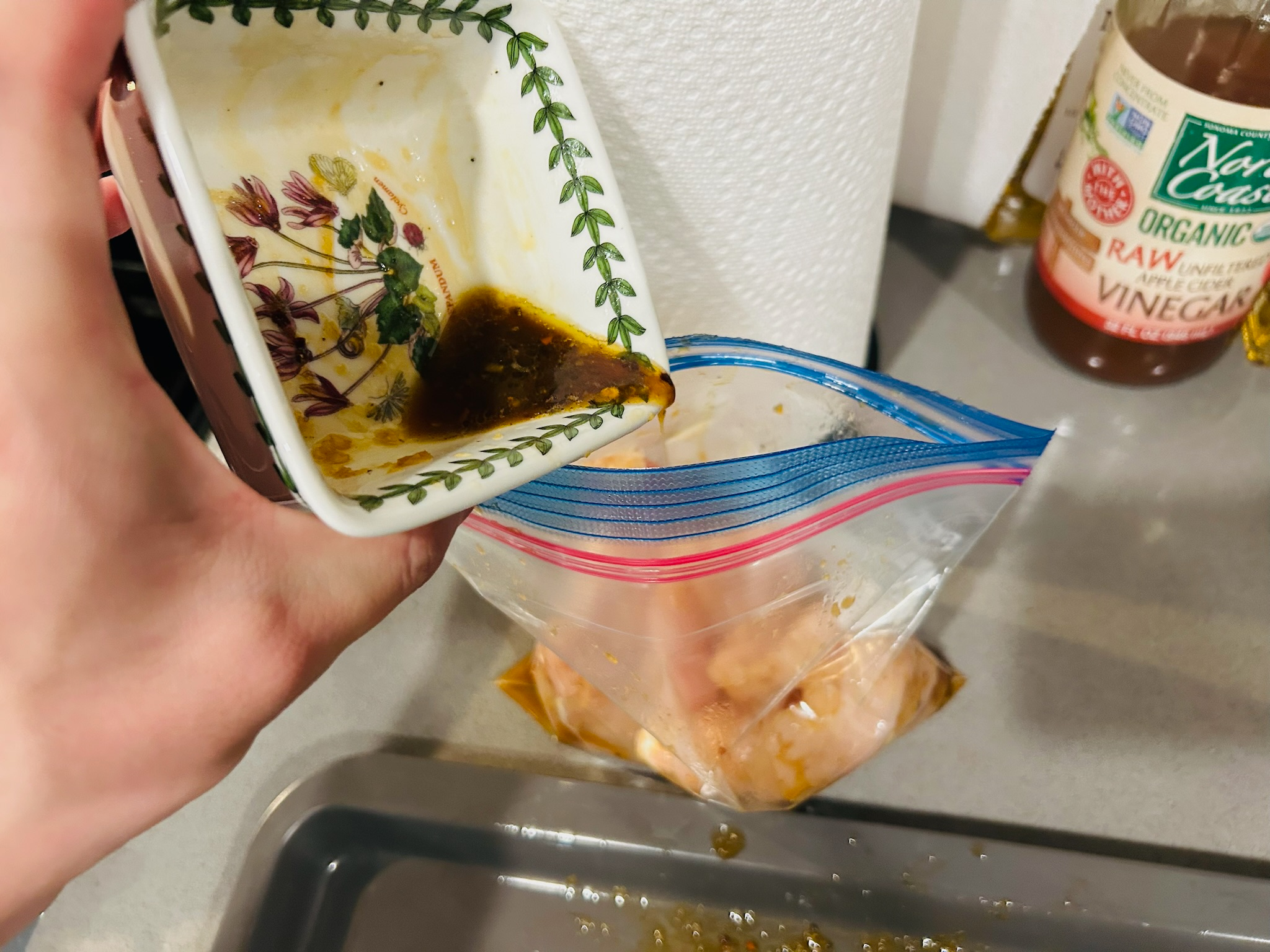 8. 봉지 혹은 밀폐용기에 허니갈릭 양념을 한 닭가슴살을 넣고 재워줍니다.