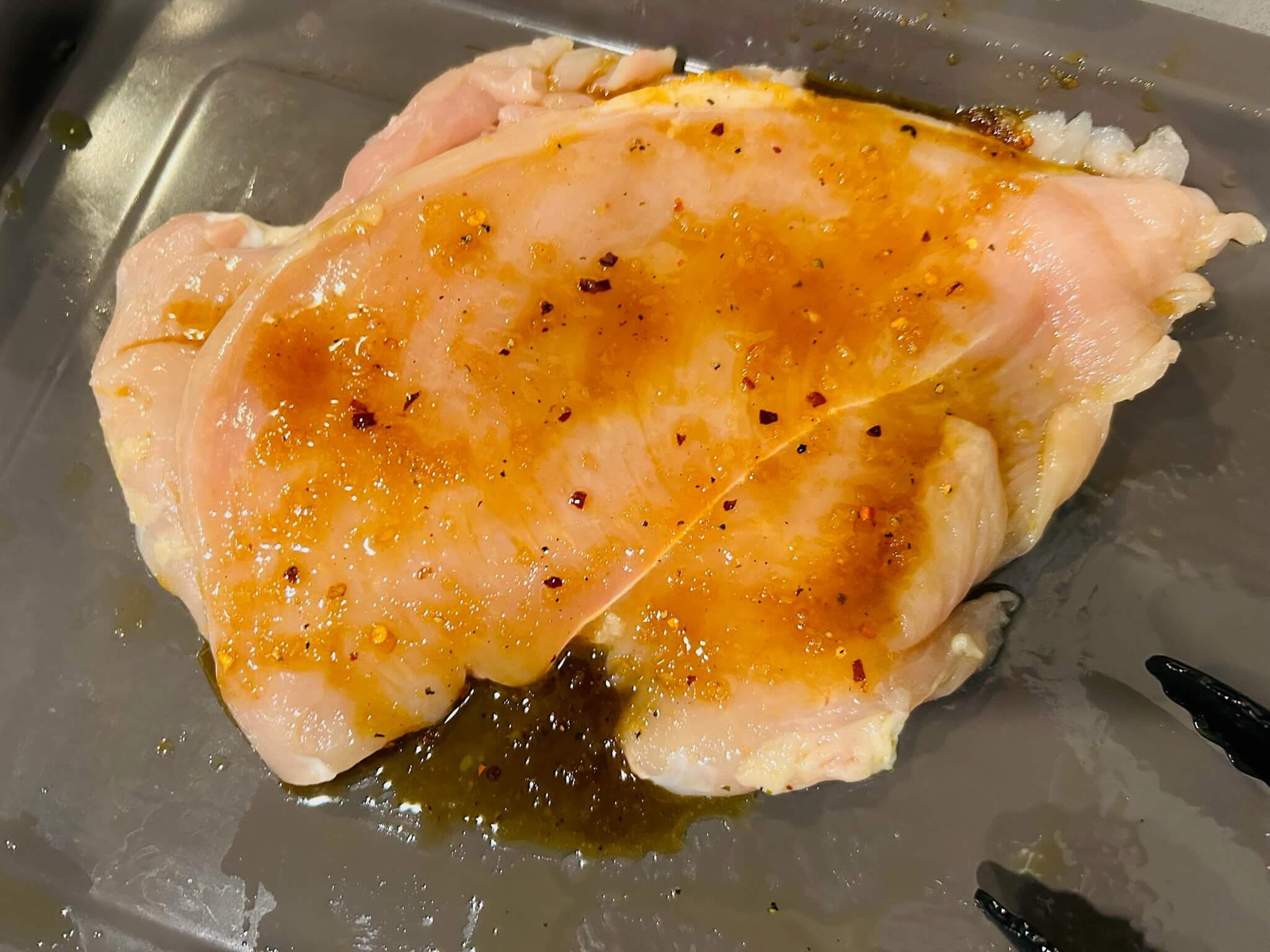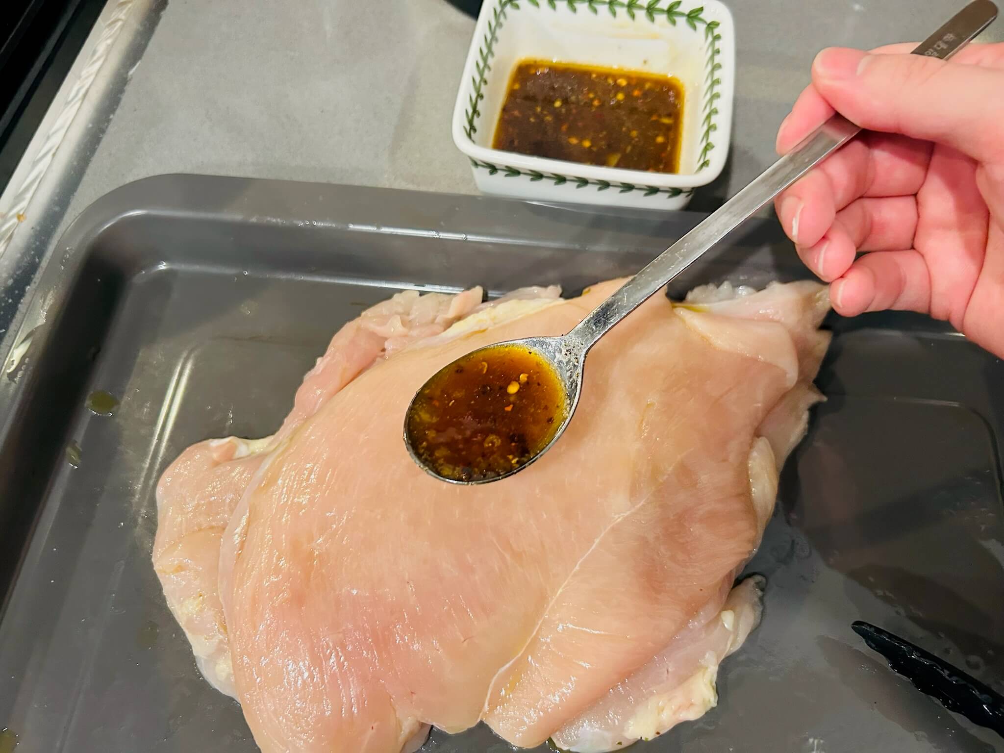 7. 올리브유를 두른 닭가슴살에 양념을 잘 발라줍니다.