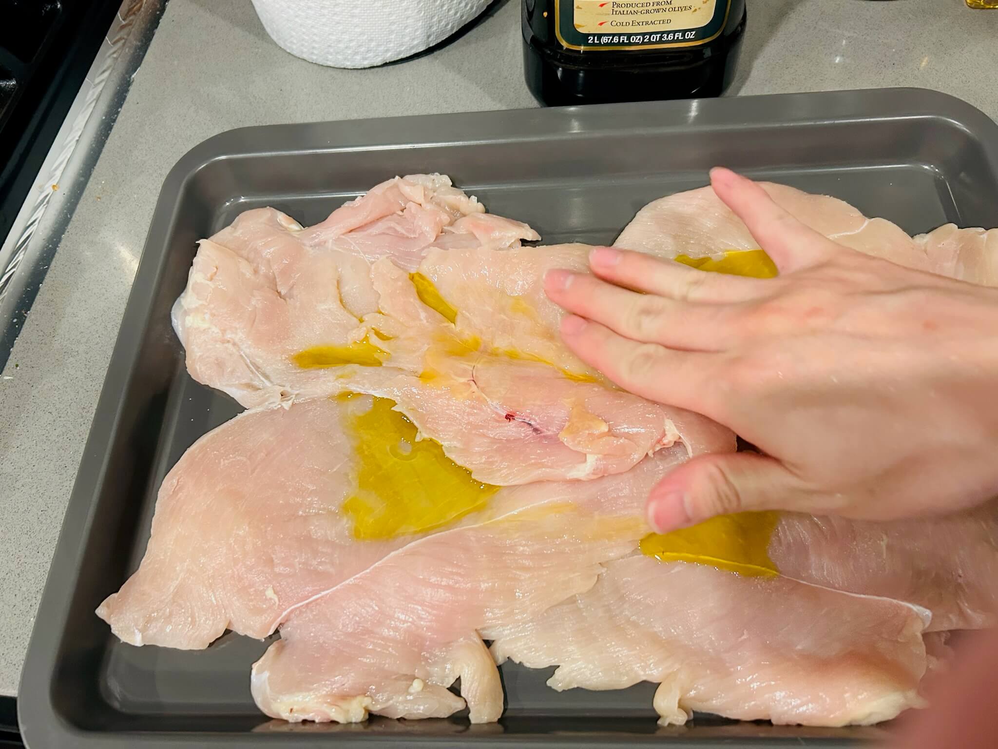 2. 닭가슴살을 올리브유를 뿌려 골고루 토닥여줍니다.