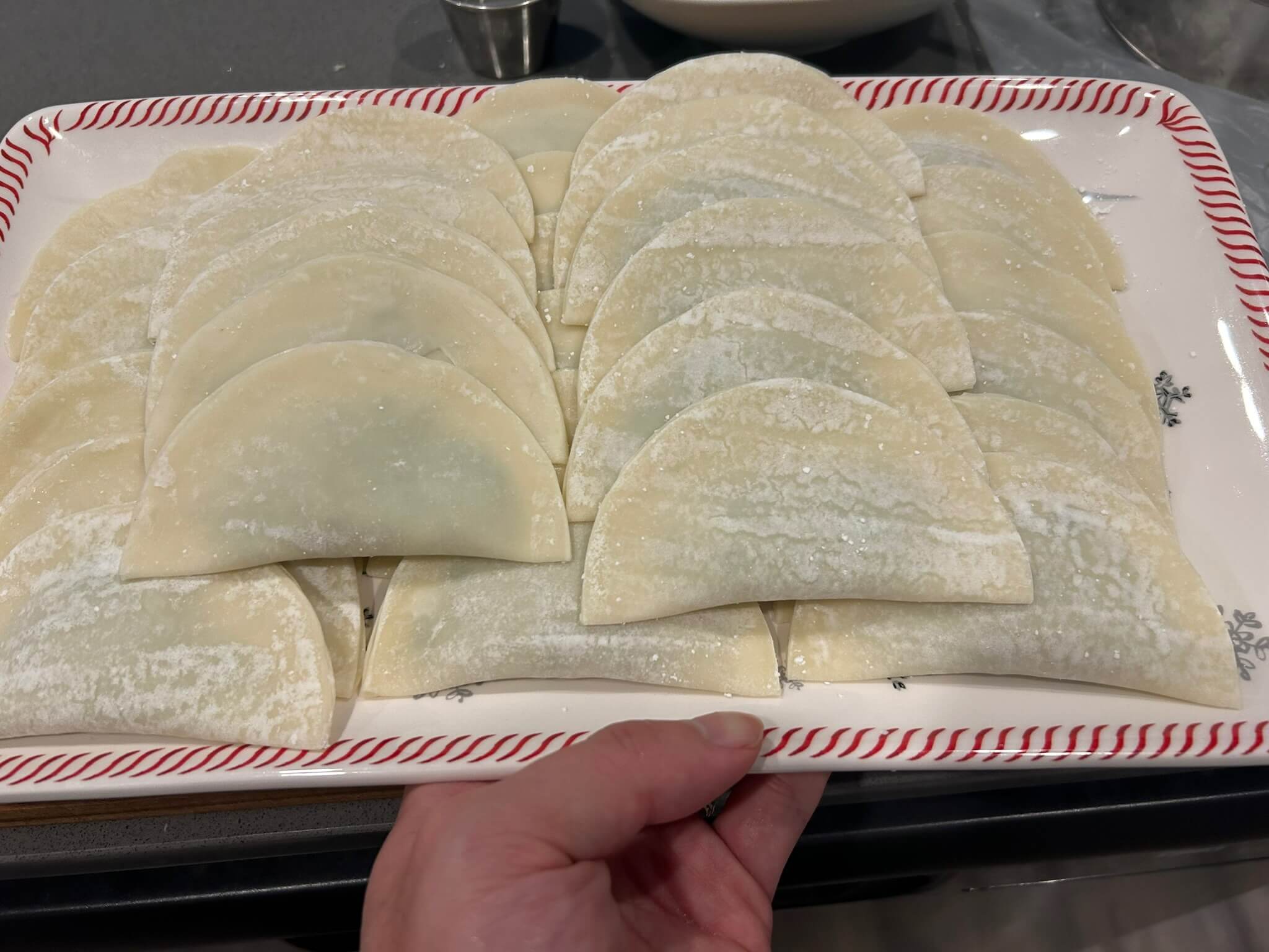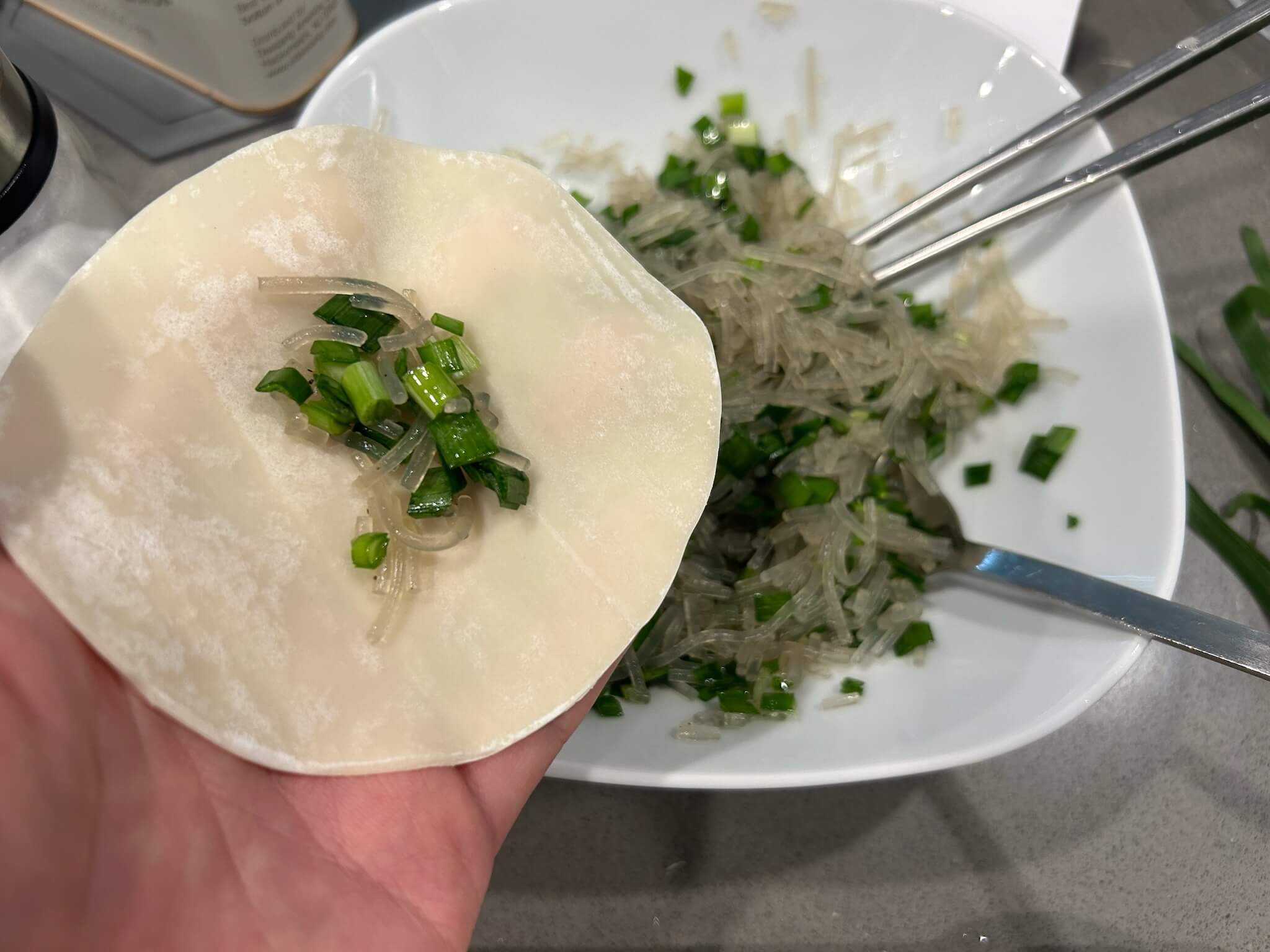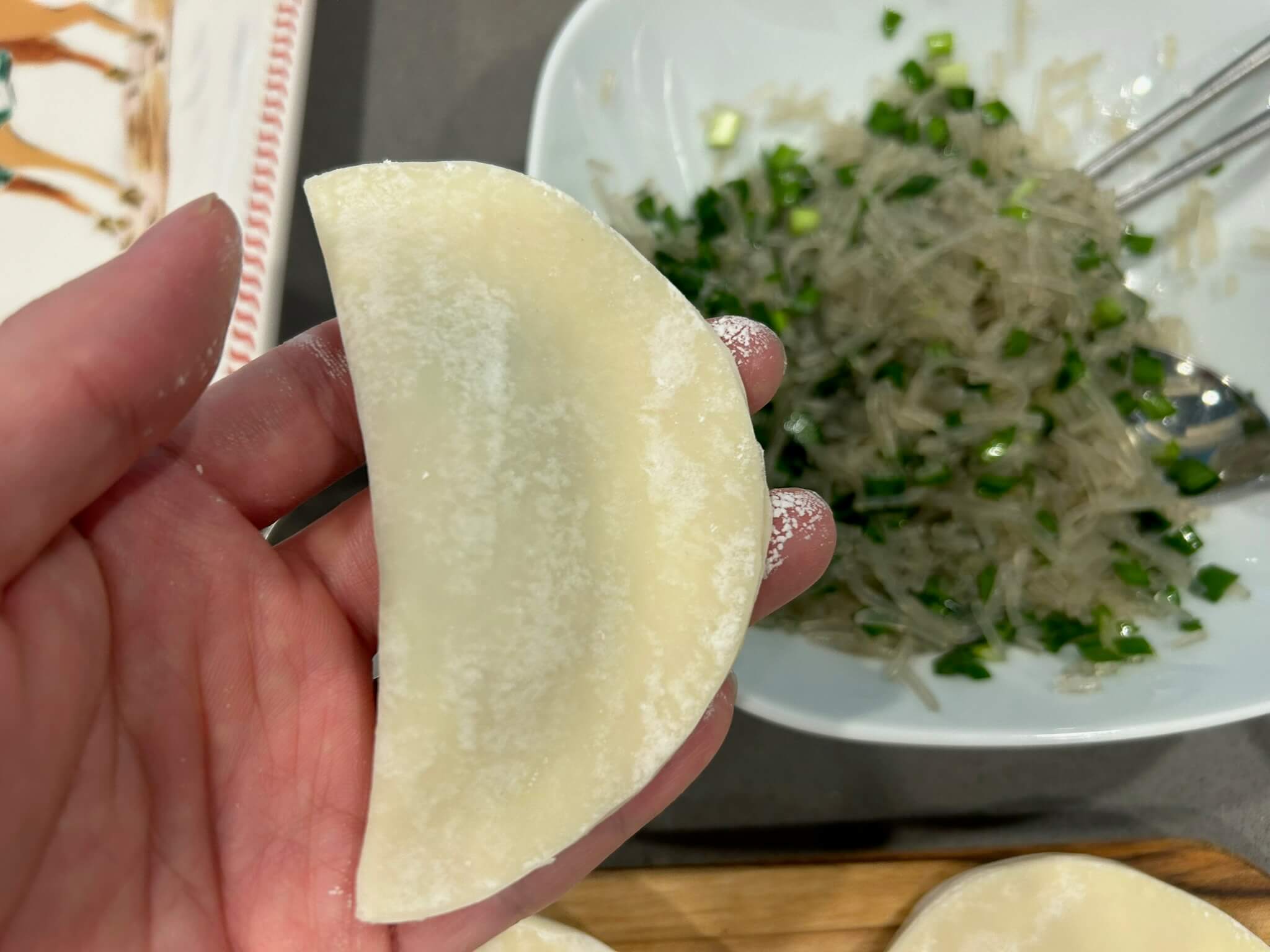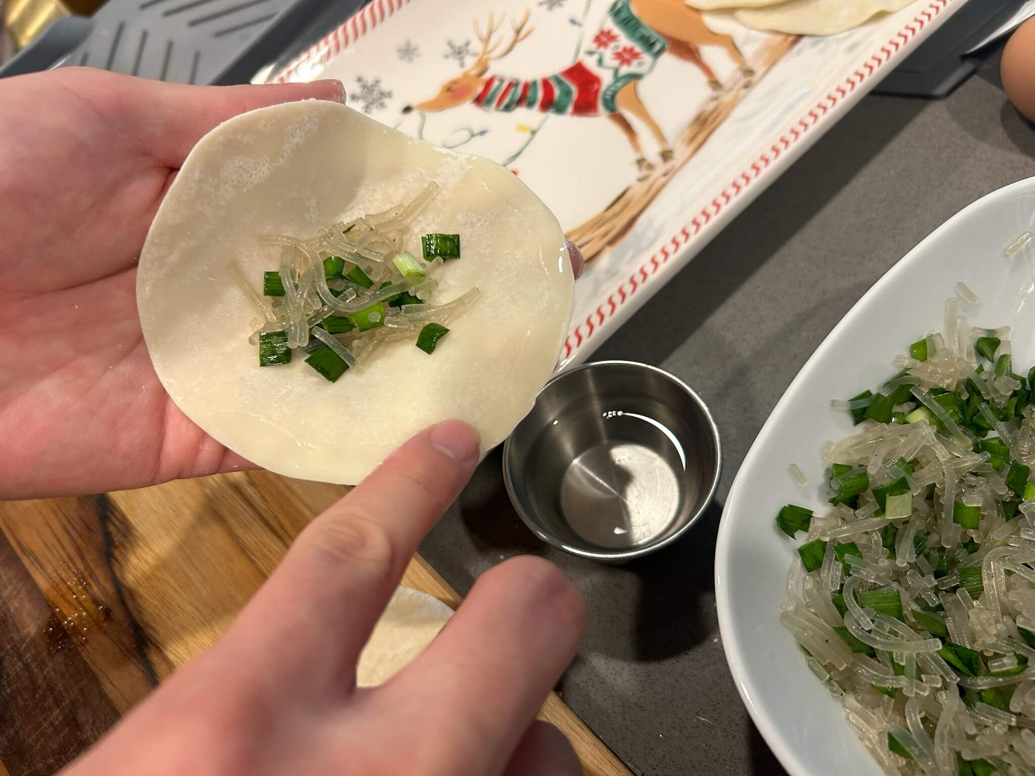 8. 만두피에 만두소를 손가락한마디정도 넣어 만두를 빚어줍니다.