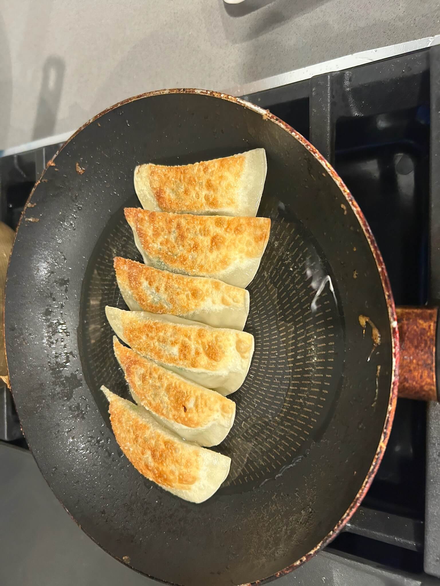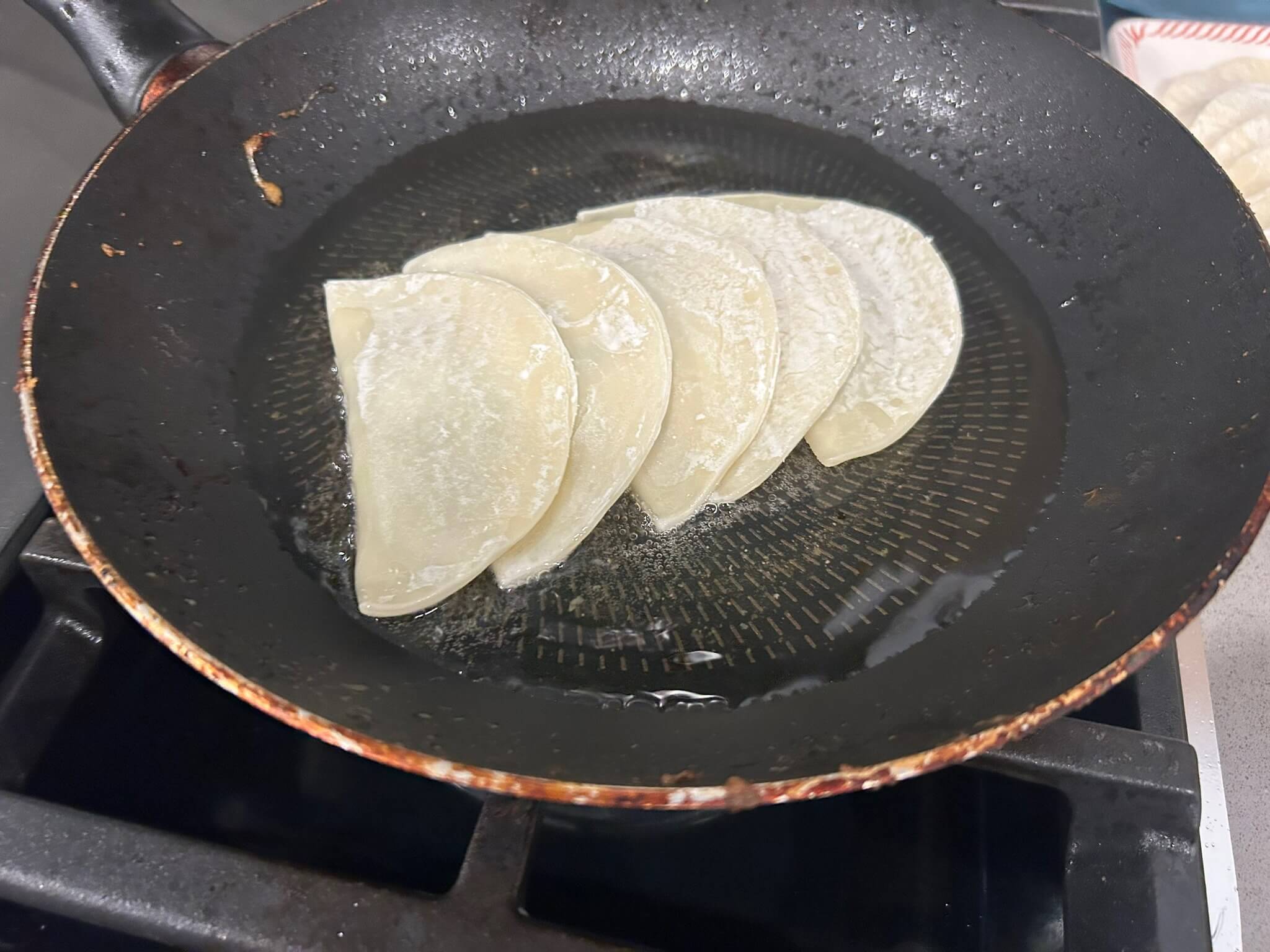 9. 프라이팬에 기름을 두르고 납작 만두를 앞뒤로 노릇하게 구워줍니다.
