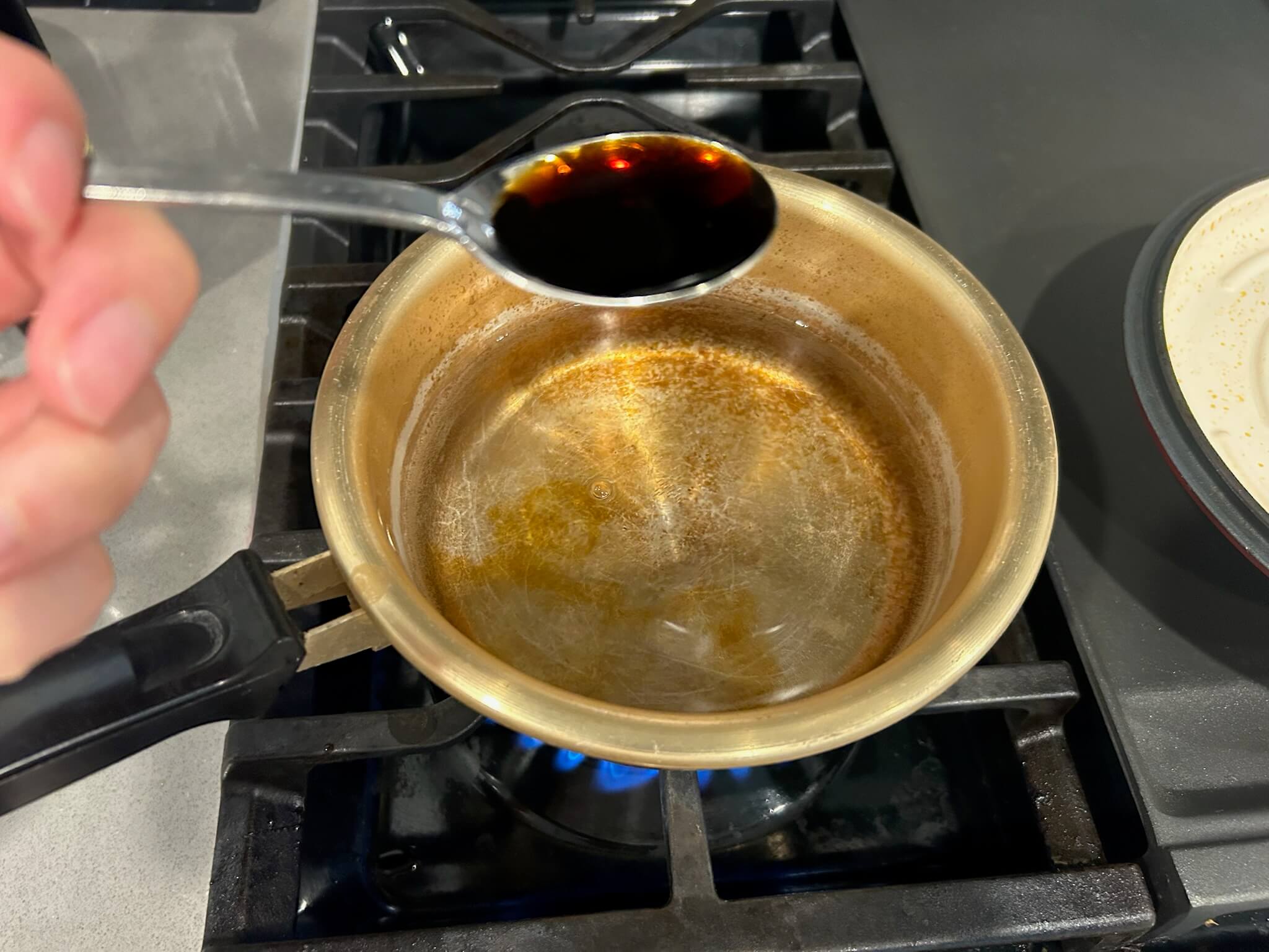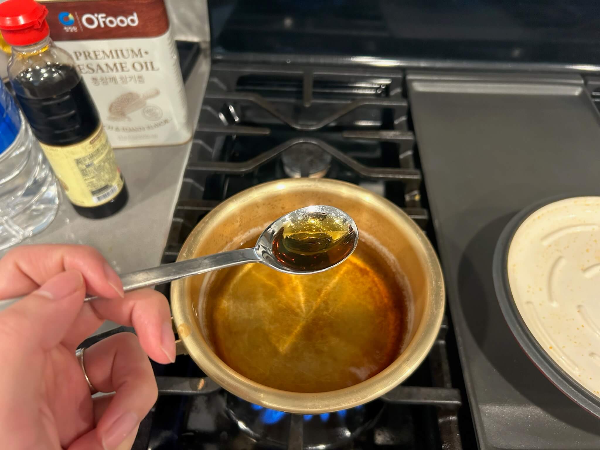 2. 냄비에 물을 넣고 간장 1 숟갈, 참기름 1 숟갈을 넣어줍니다.