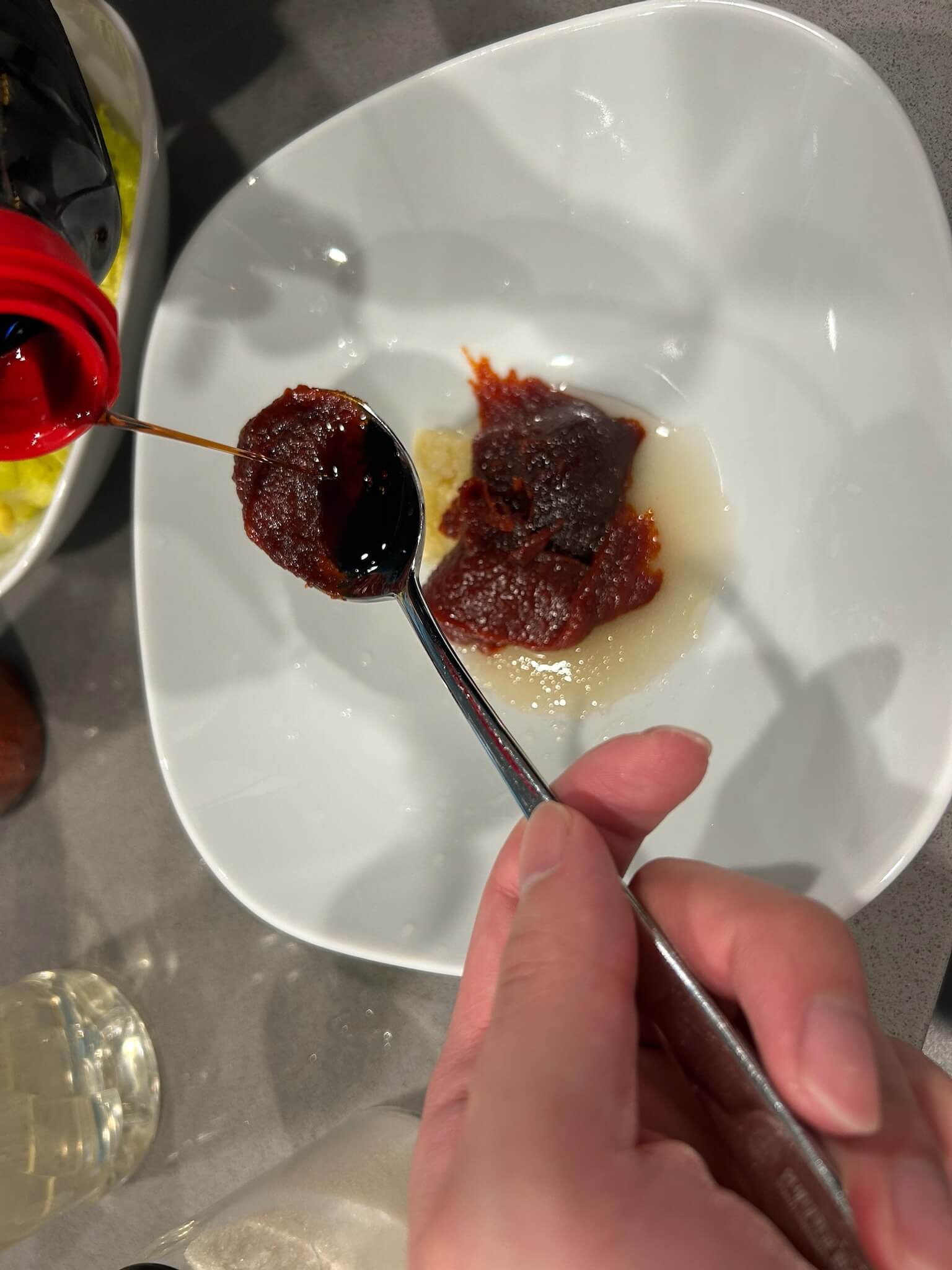 6. 소스로 다진 마늘 1/2, 설탕 1, 고추장 1.5, 고춧가루 1, 식초 1 숟갈을 넣어 잘 섞어 만들어 줍니다.