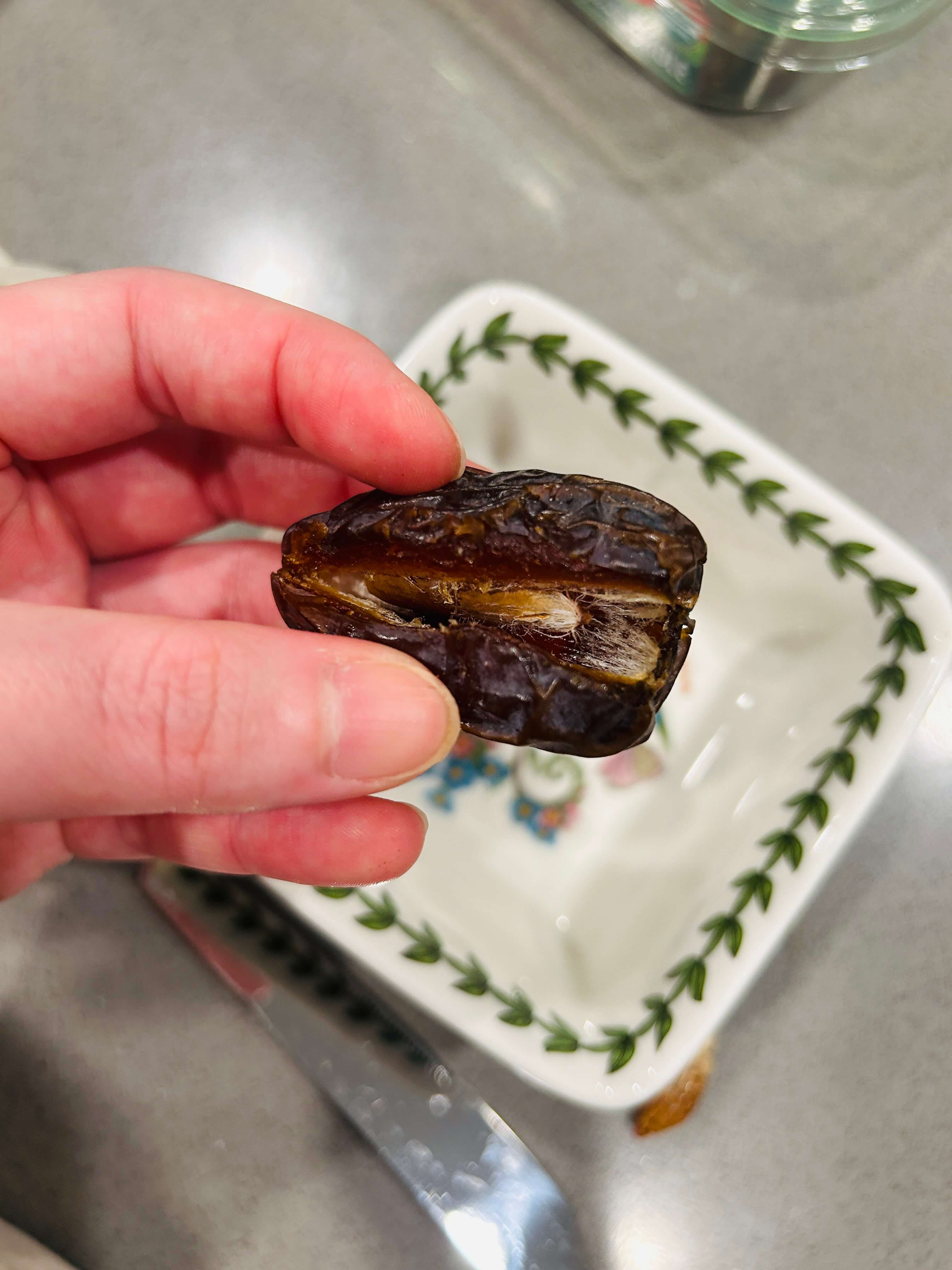 2. 대추야자를 반으로 자르면 안에 씨가 있는데 씨는 제거해 줍니다.