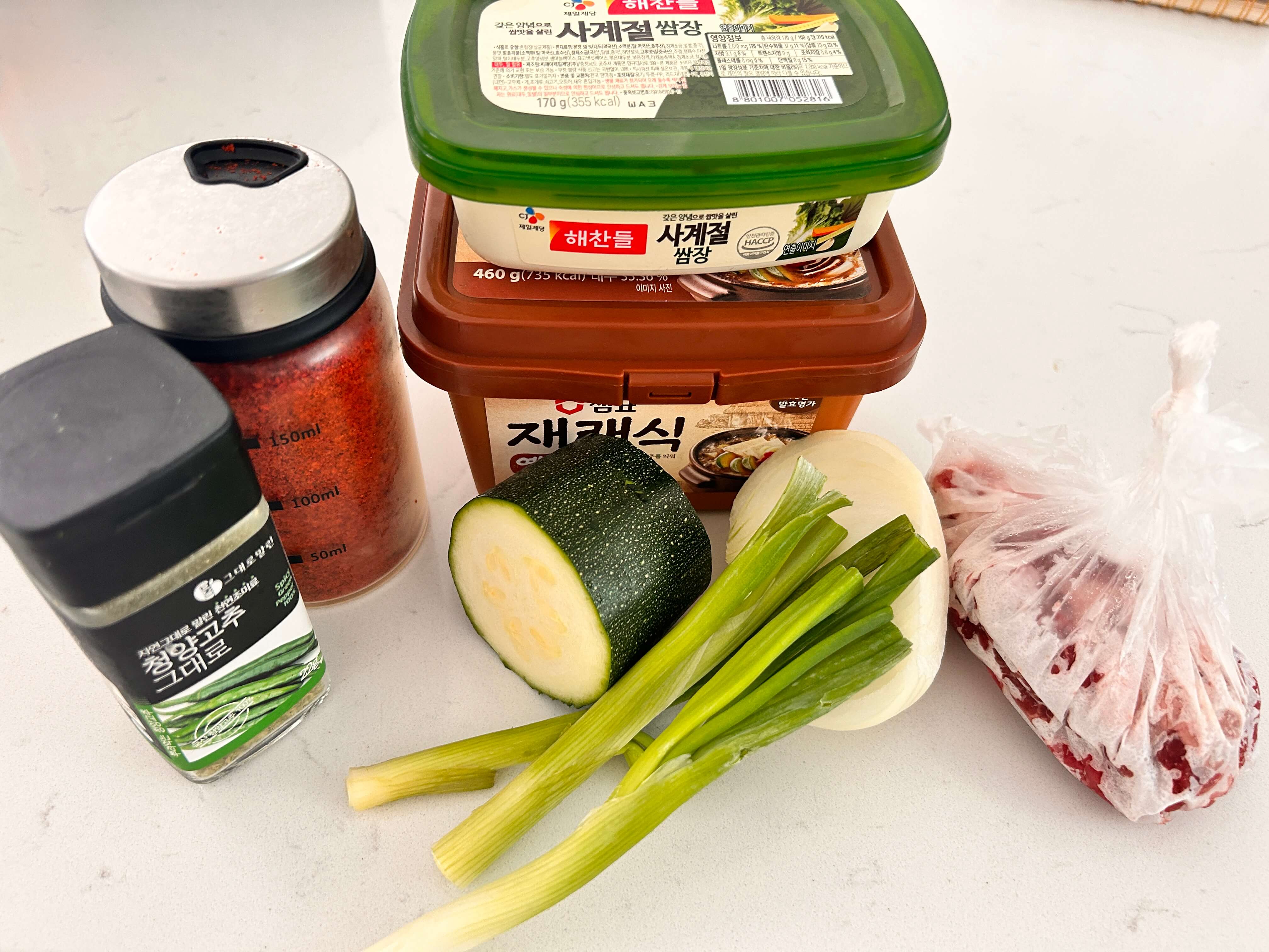 1. 차돌박이, 호박, 대파, 양파, 쌈장, 된장, 청양고춧가루, 고춧가루를 준비해 줍니다.