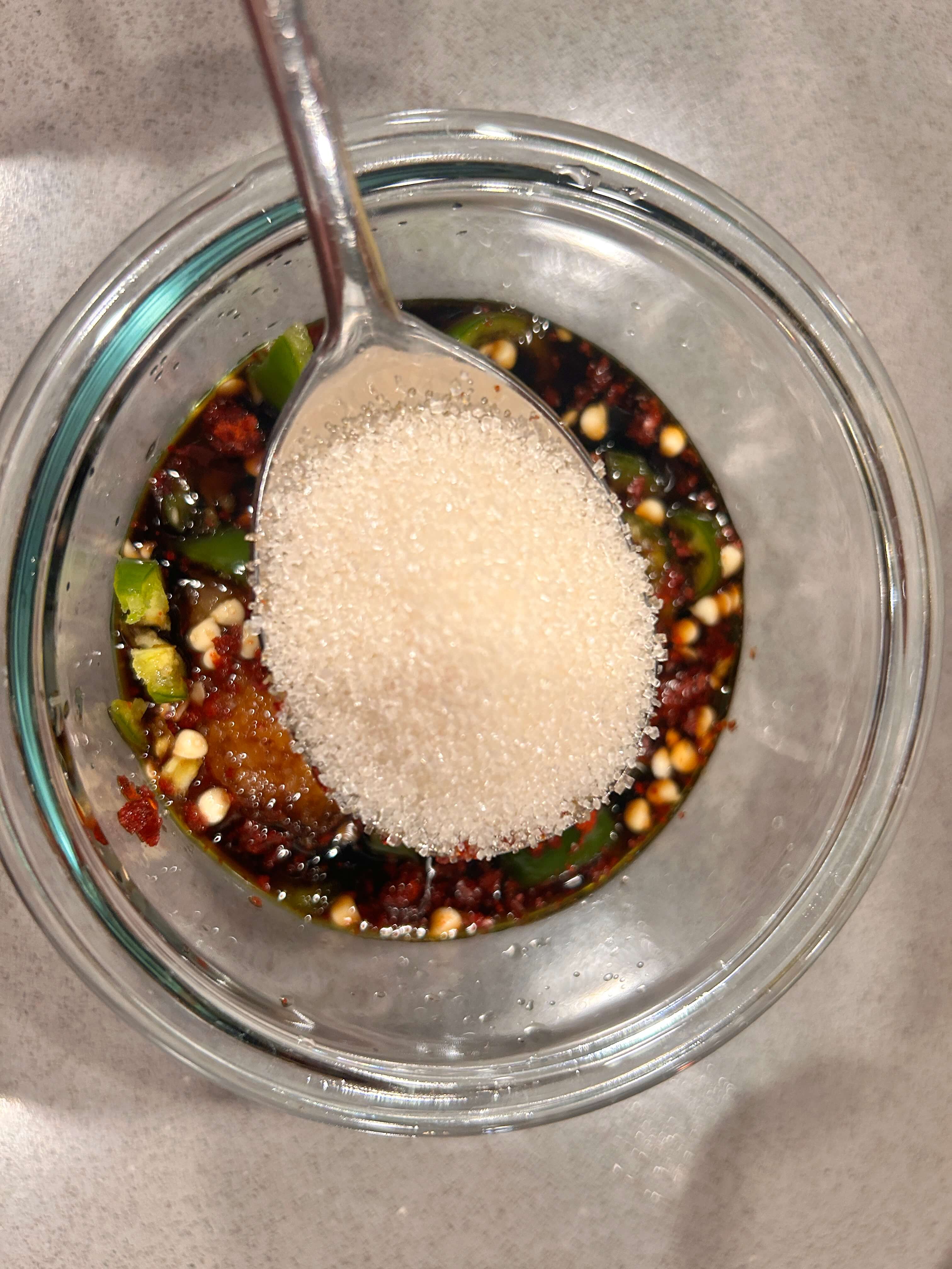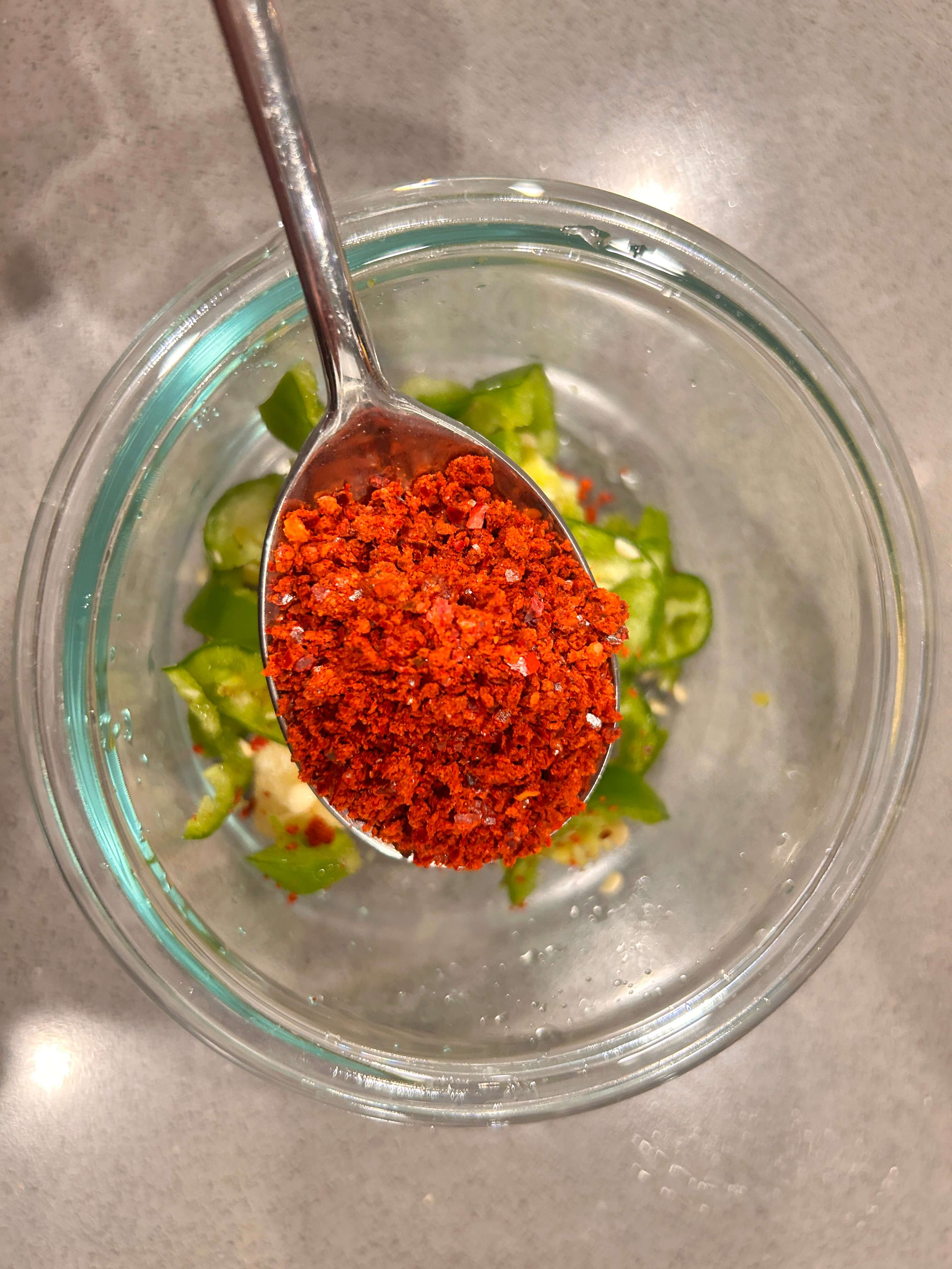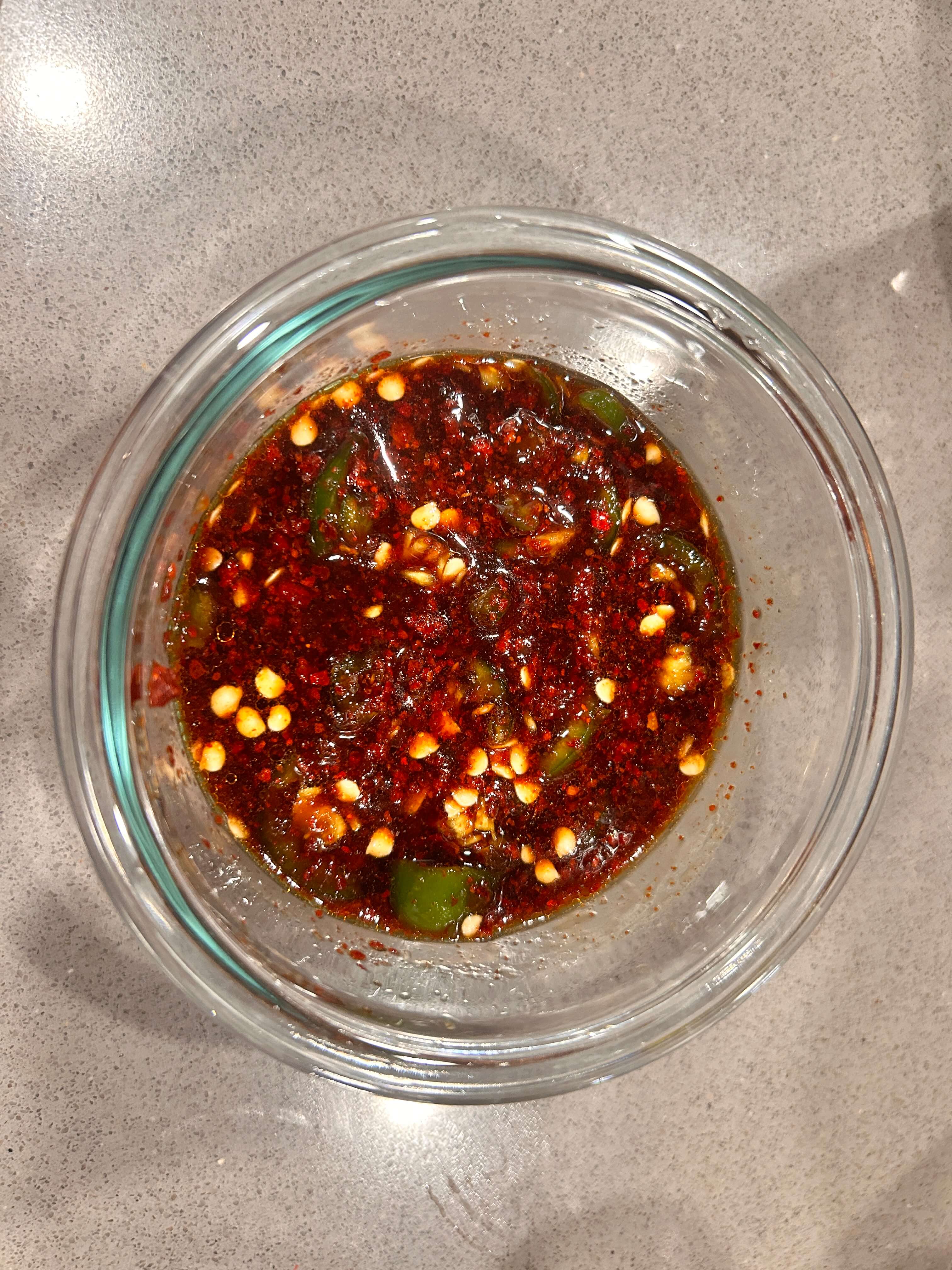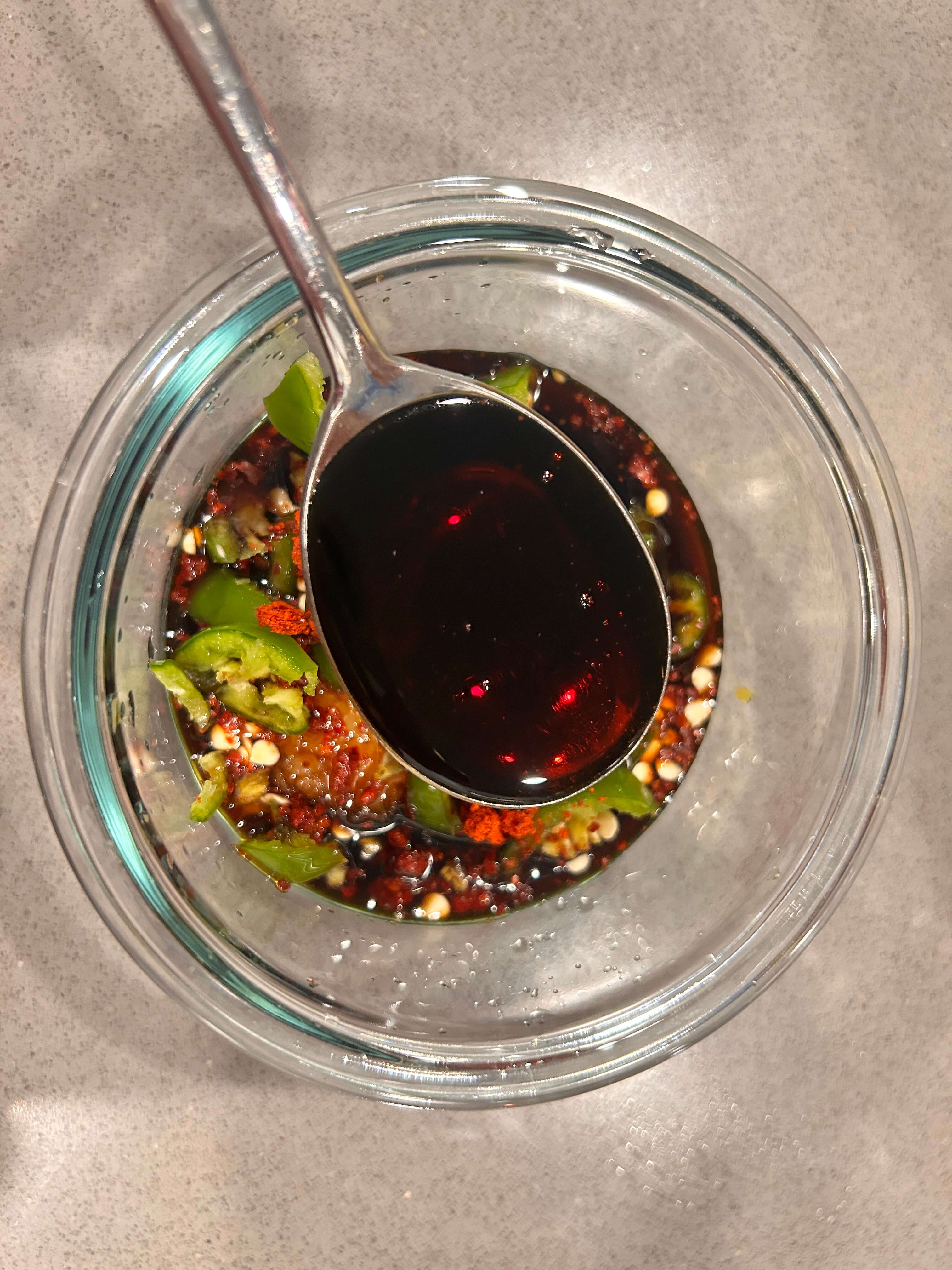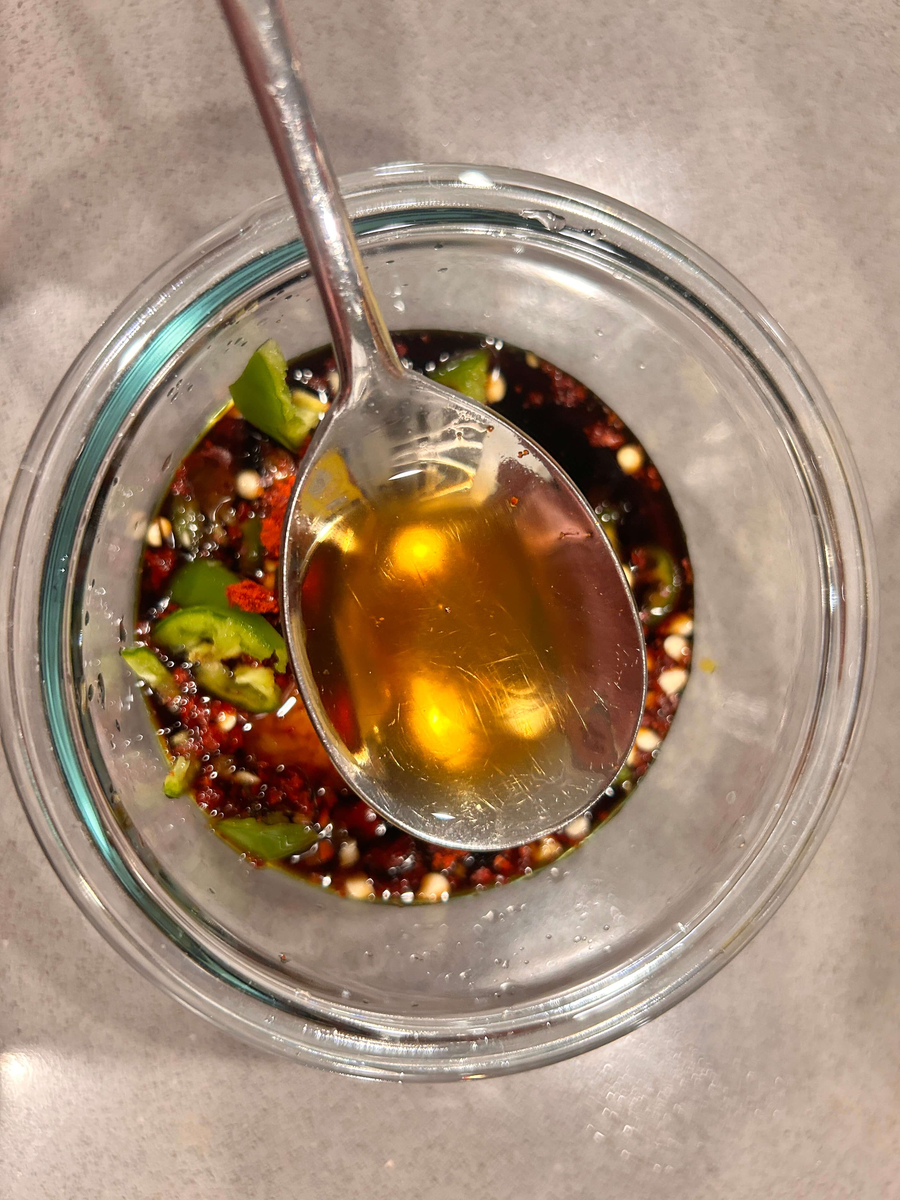 11. 다진 마늘 1 숟갈, 고추 1~2개, 고춧가루 1, 간장 7, 참기름 1 숟갈을 넣고 잘 섞어줍니다.