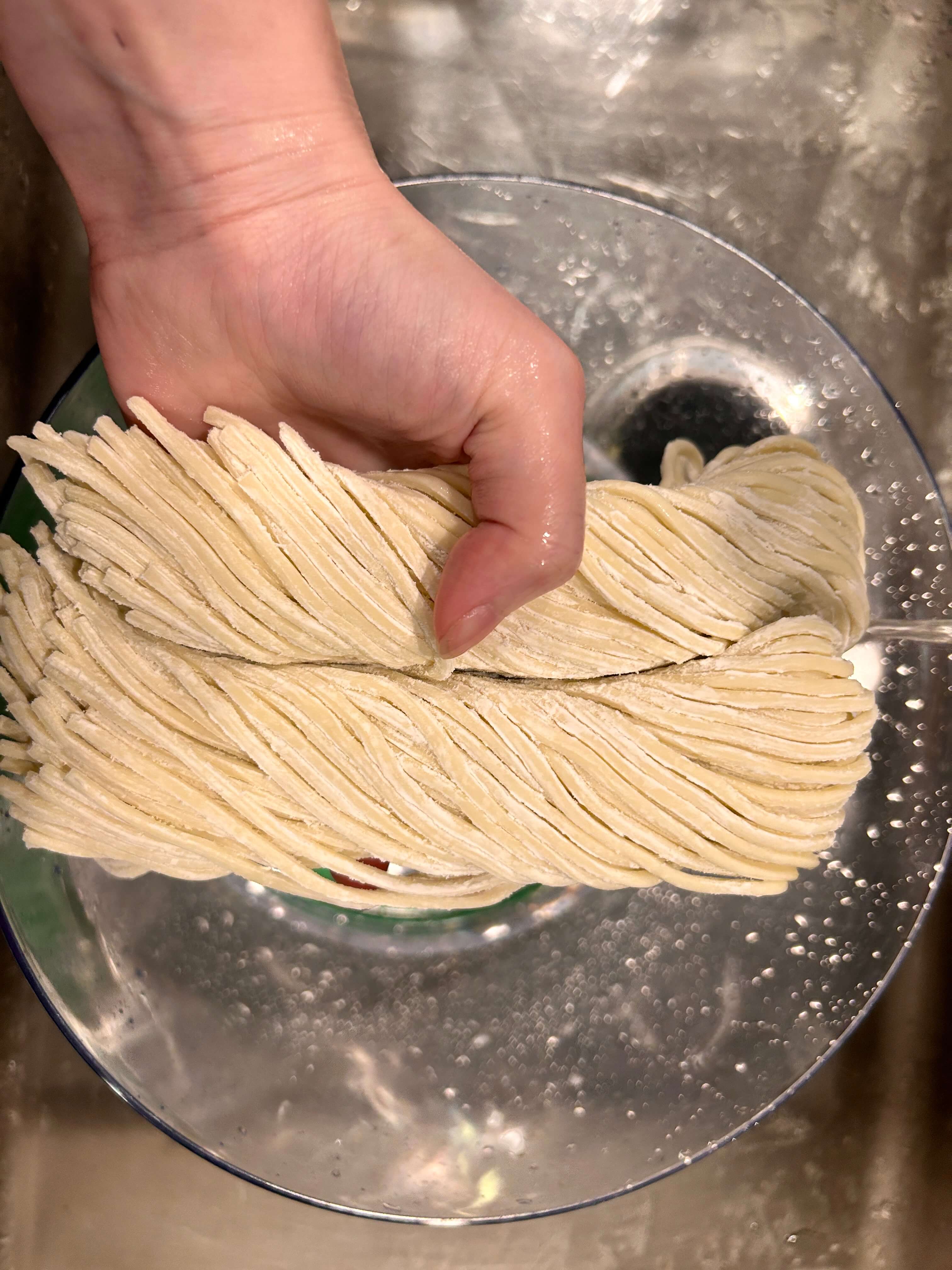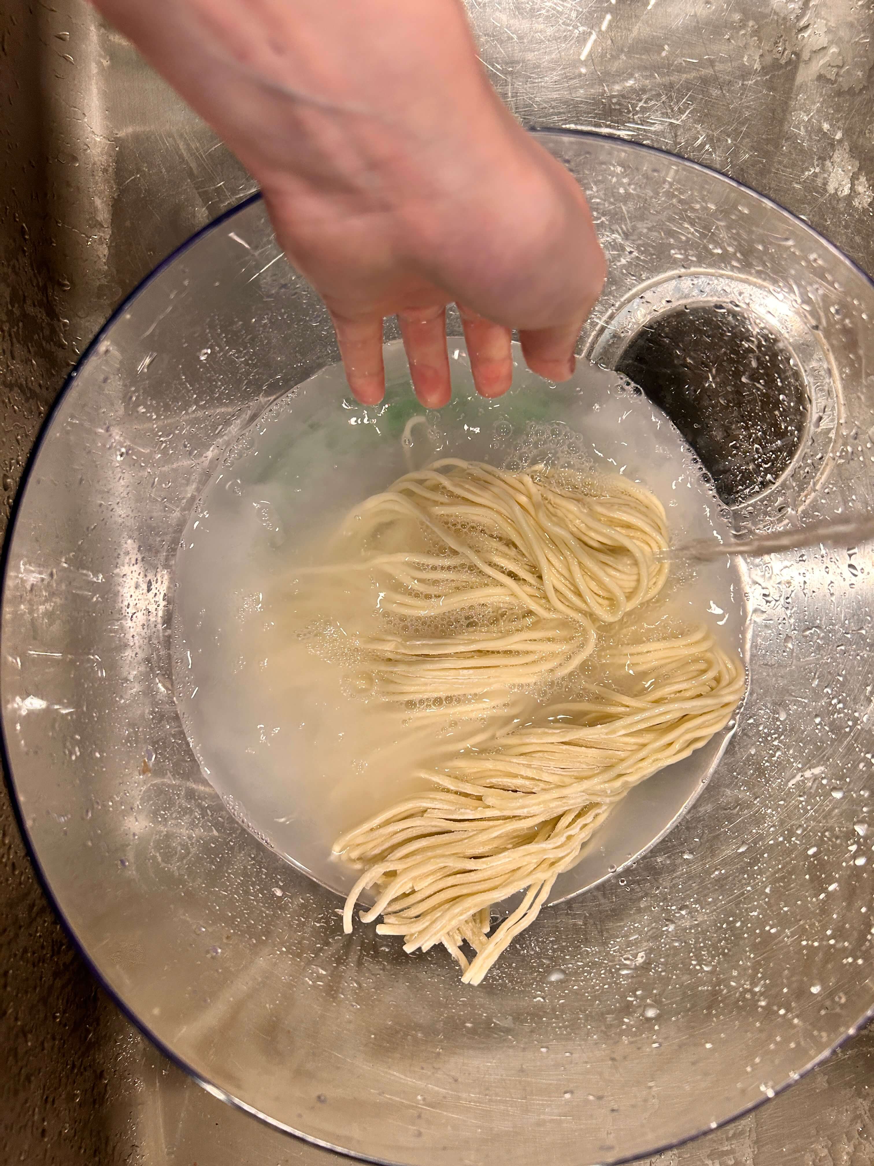 7. 면은 물에 한 번 씻어 묻어있는 밀가루를 털어내줍니다.