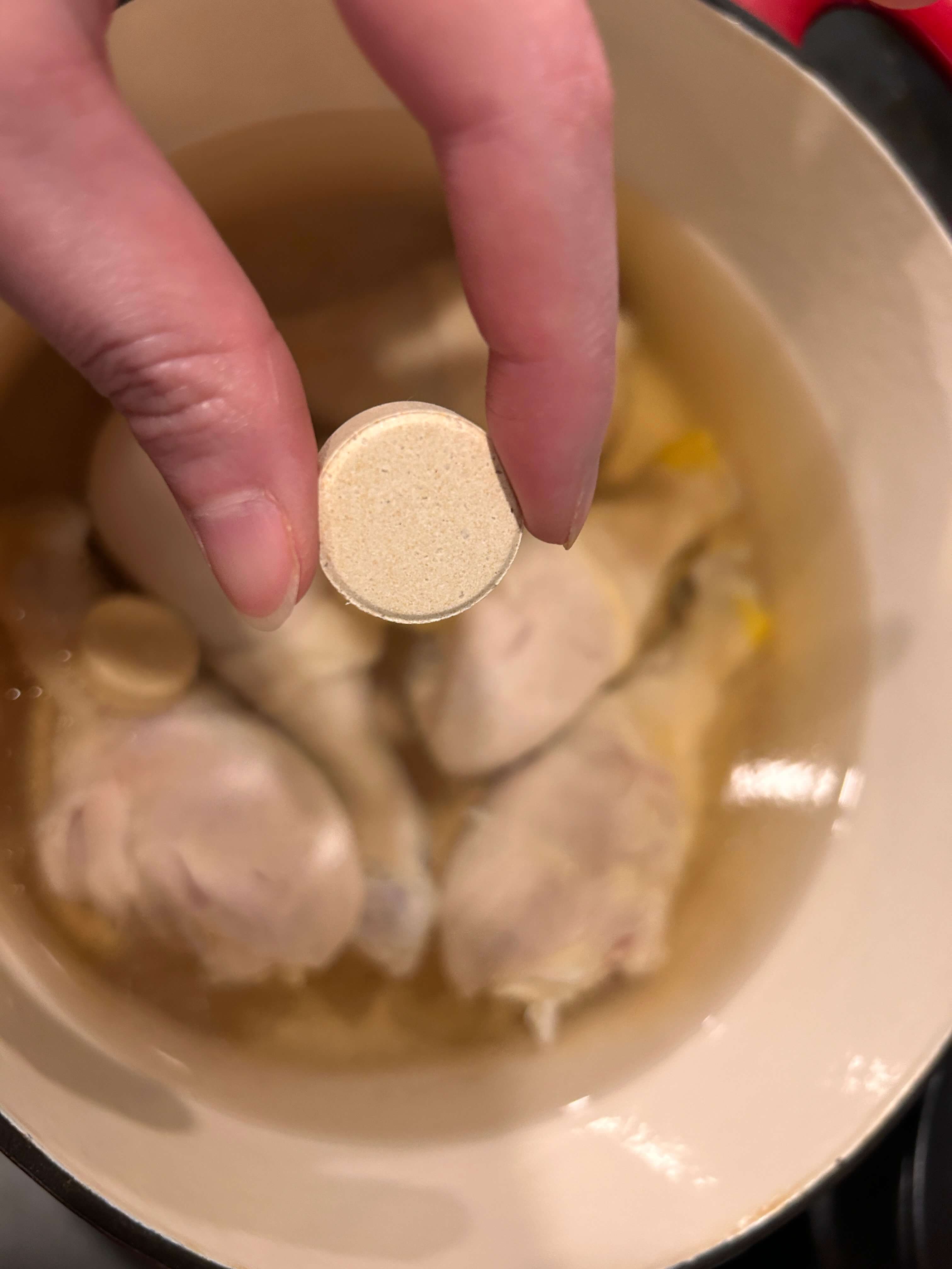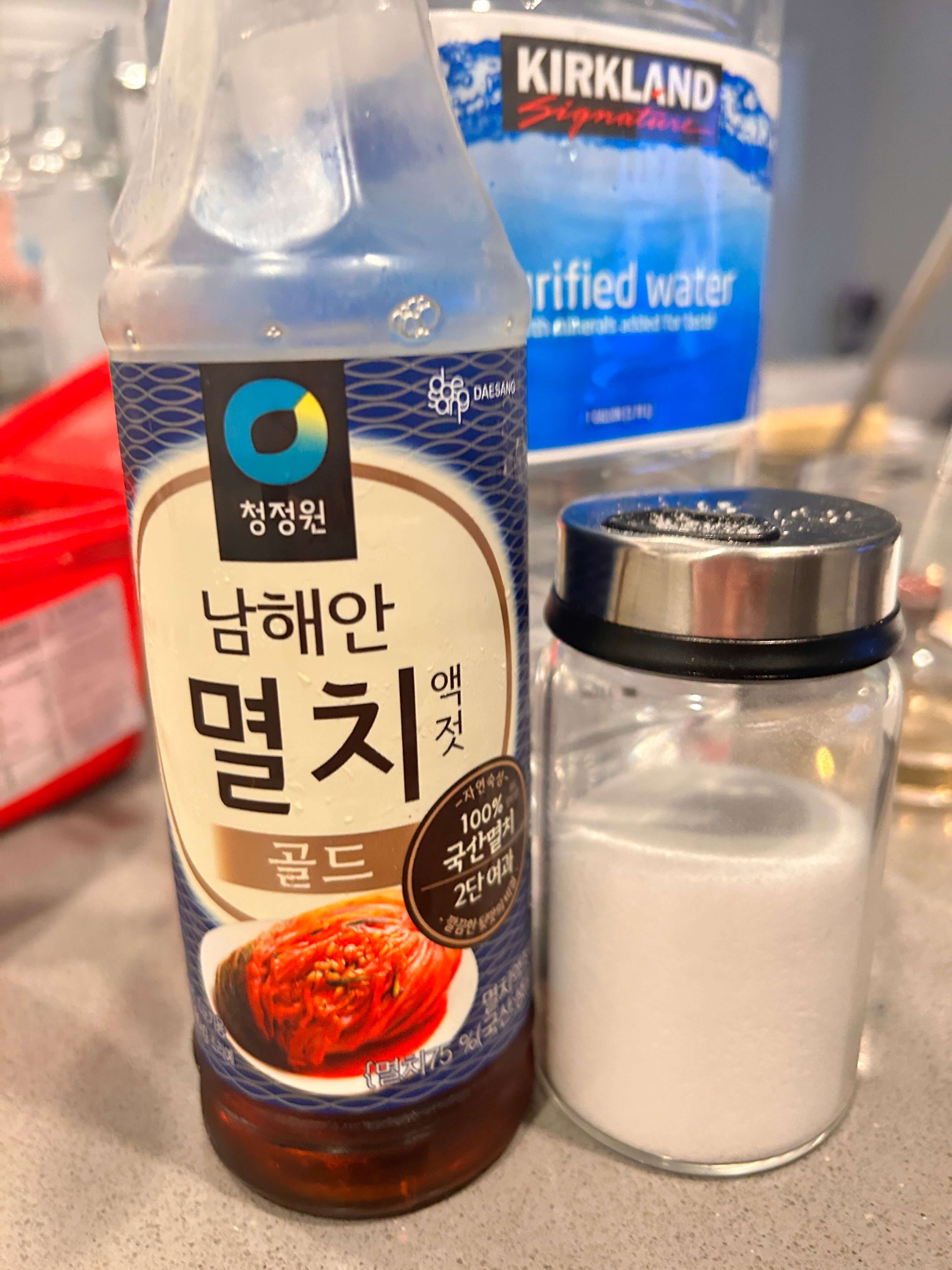 4. 물을 넣고, 멸치액젓 3 숟갈, 다진 마늘 1 숟갈, 육수 한 알을 넣어줍니다.