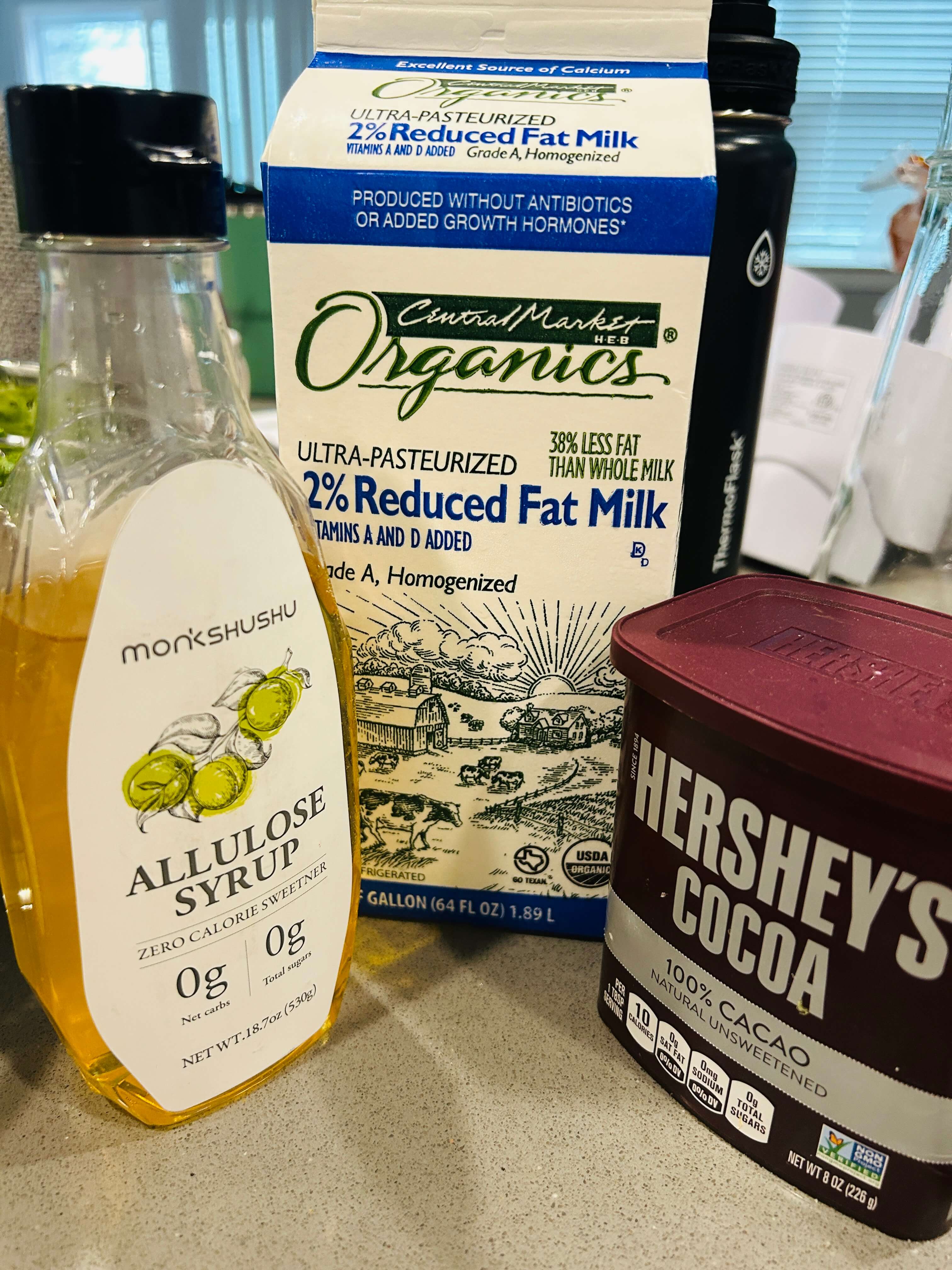 13. 초코 크림소스로 알룰로스, 코코아가루, 우유를 준비해 줍니다.