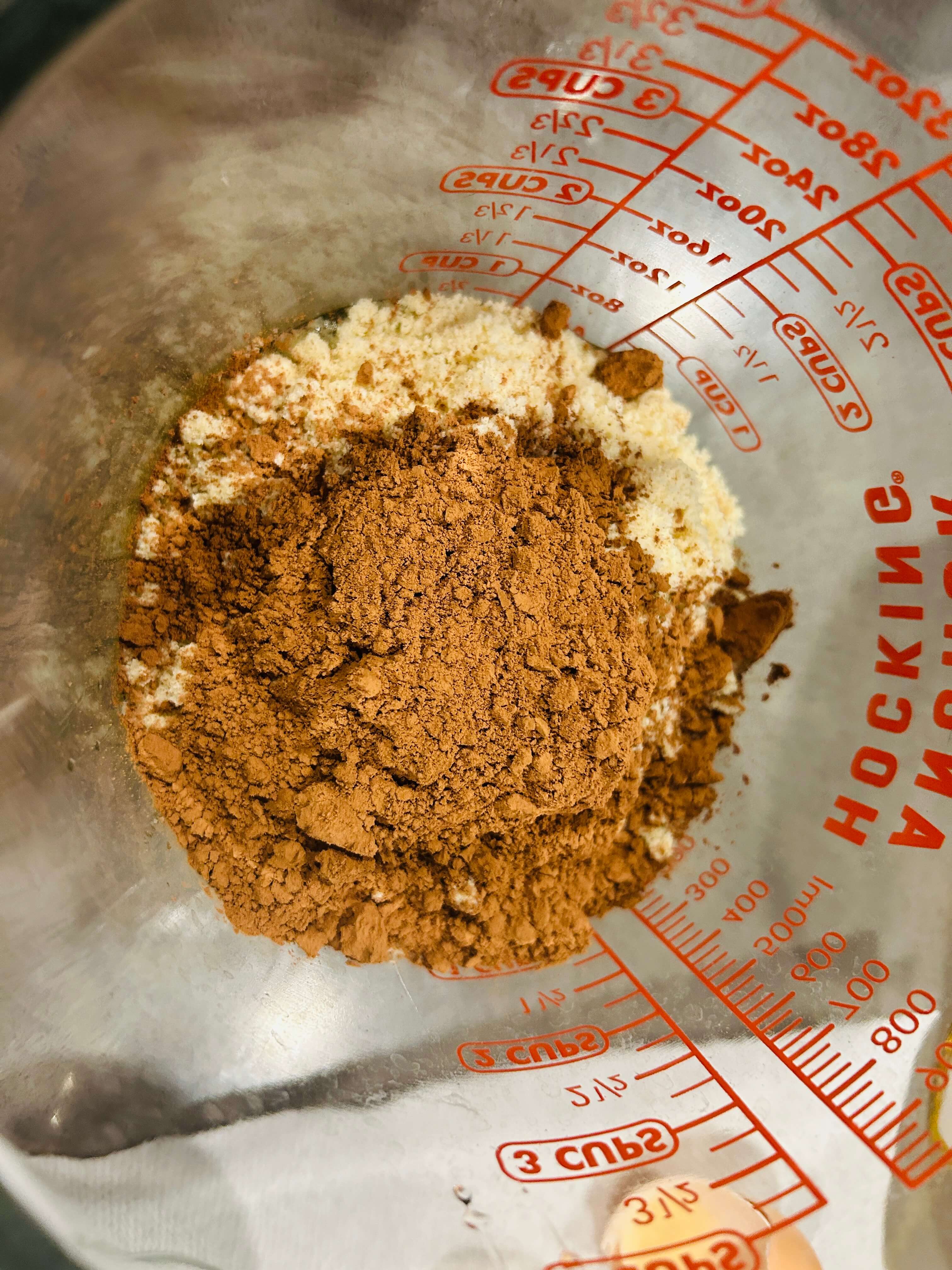 1. 계란 3개, 우유, 아몬드가루, 코코아가루, 알룰로스, 베이킹파우더, 소금을 준비해 줍니다.