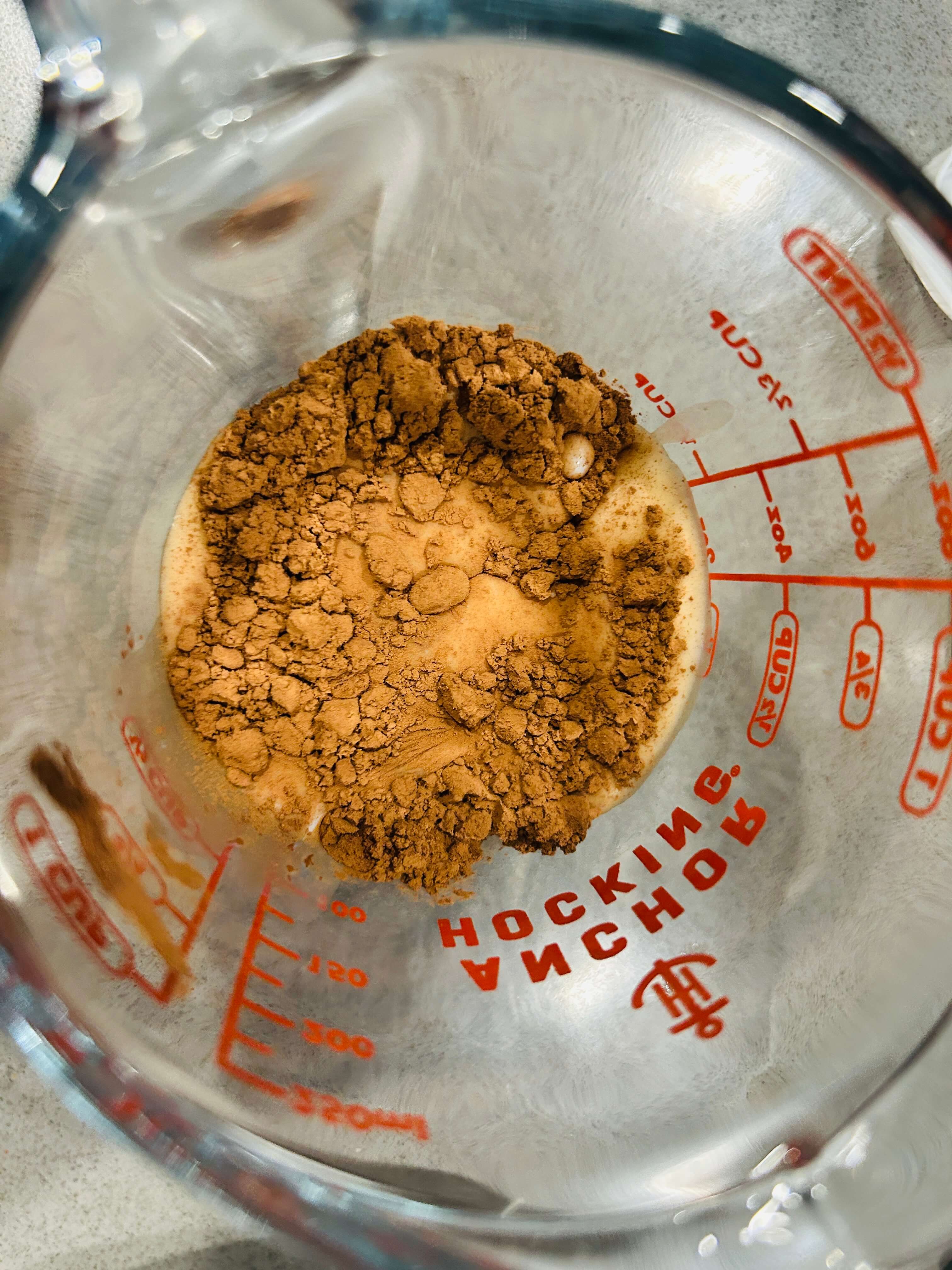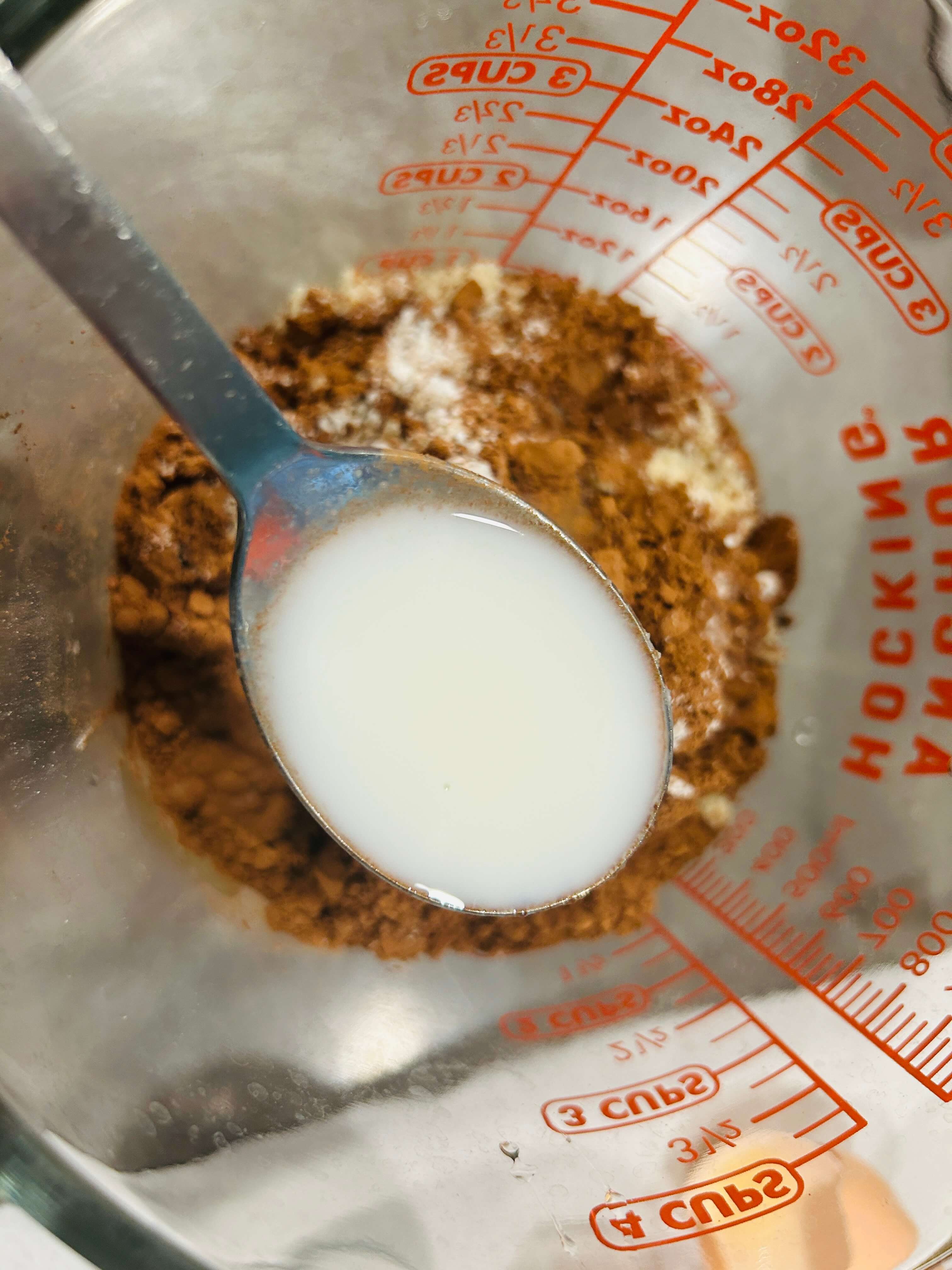 14. 코코아가루 3 숟갈, 우유 3숟갈, 알룰로스 3 숟갈을 넣어 잘 섞어줍니다.