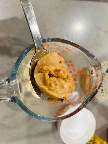 2. 땅콩버터 5, 아몬드가루 4, 알룰로스 3, 우유 2 숟갈을 넣고 반죽을 잘 섞어줍니다.