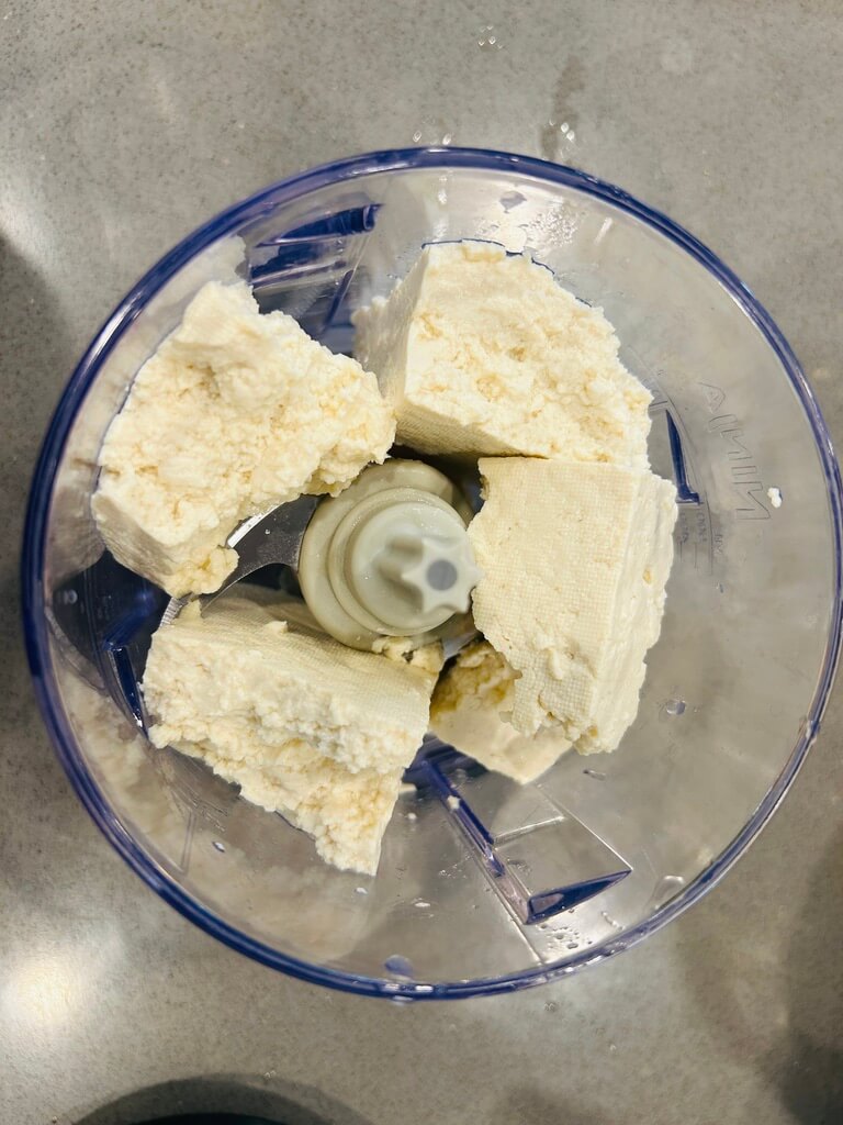2. 두부반모를 반토막 내서 믹서기에 넣어줍니다.