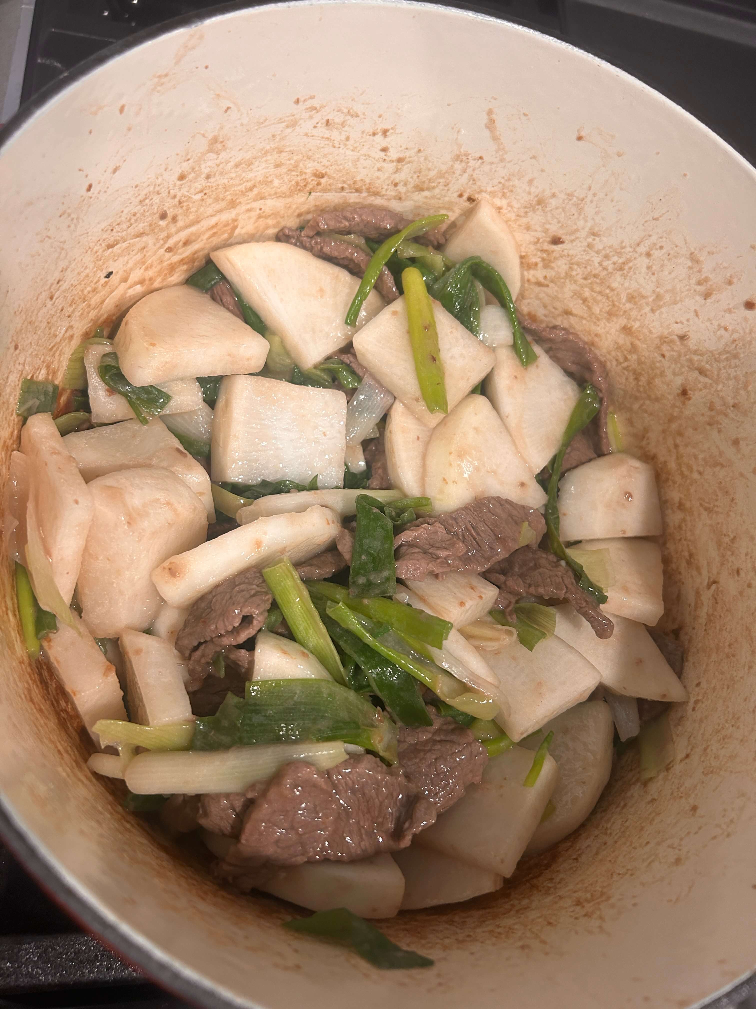 5. 밀가루 코팅된 고기를 넣어 잘 볶아줍니다.