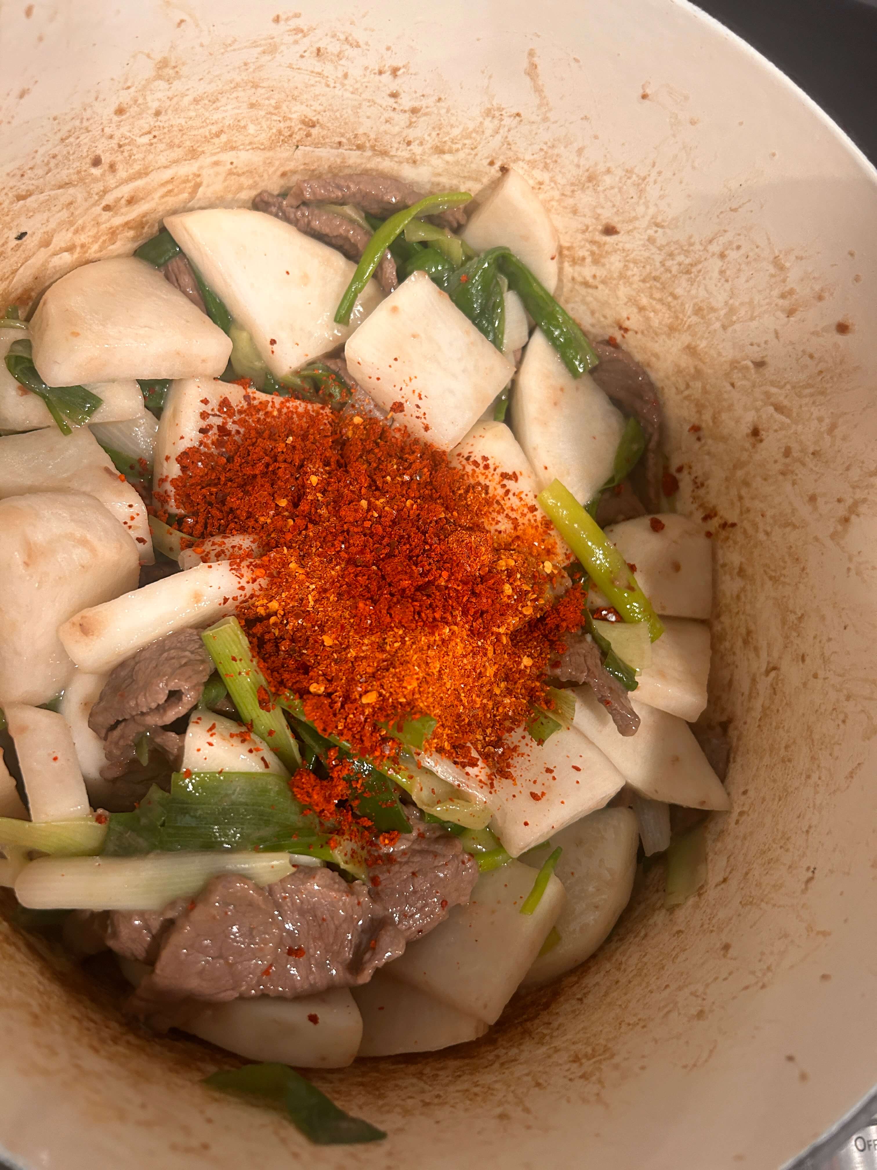 8. 약불로 낮추어 고춧가루 5 숟갈을 넣고 고춧기름이 나오게 볶아줍니다.