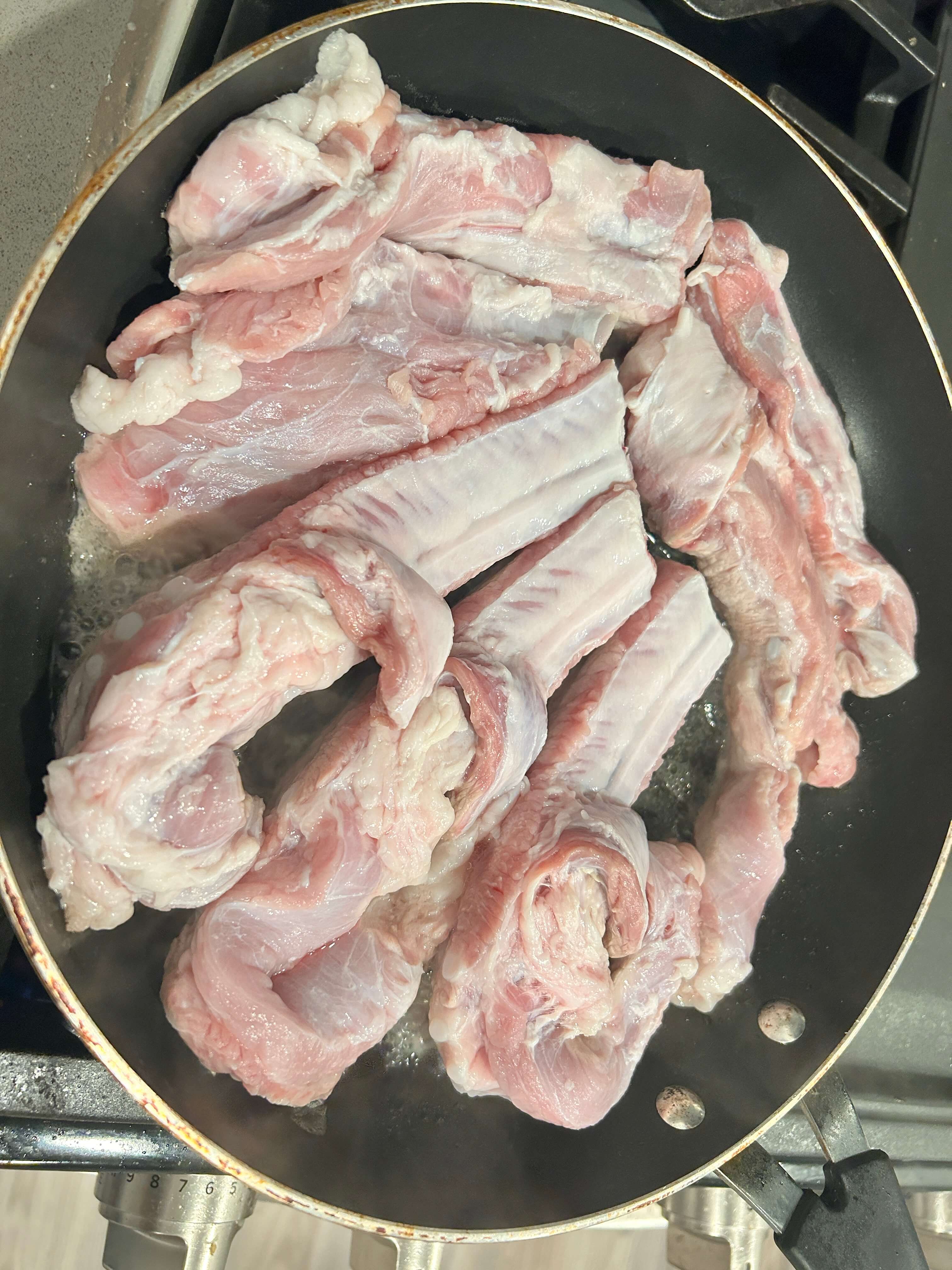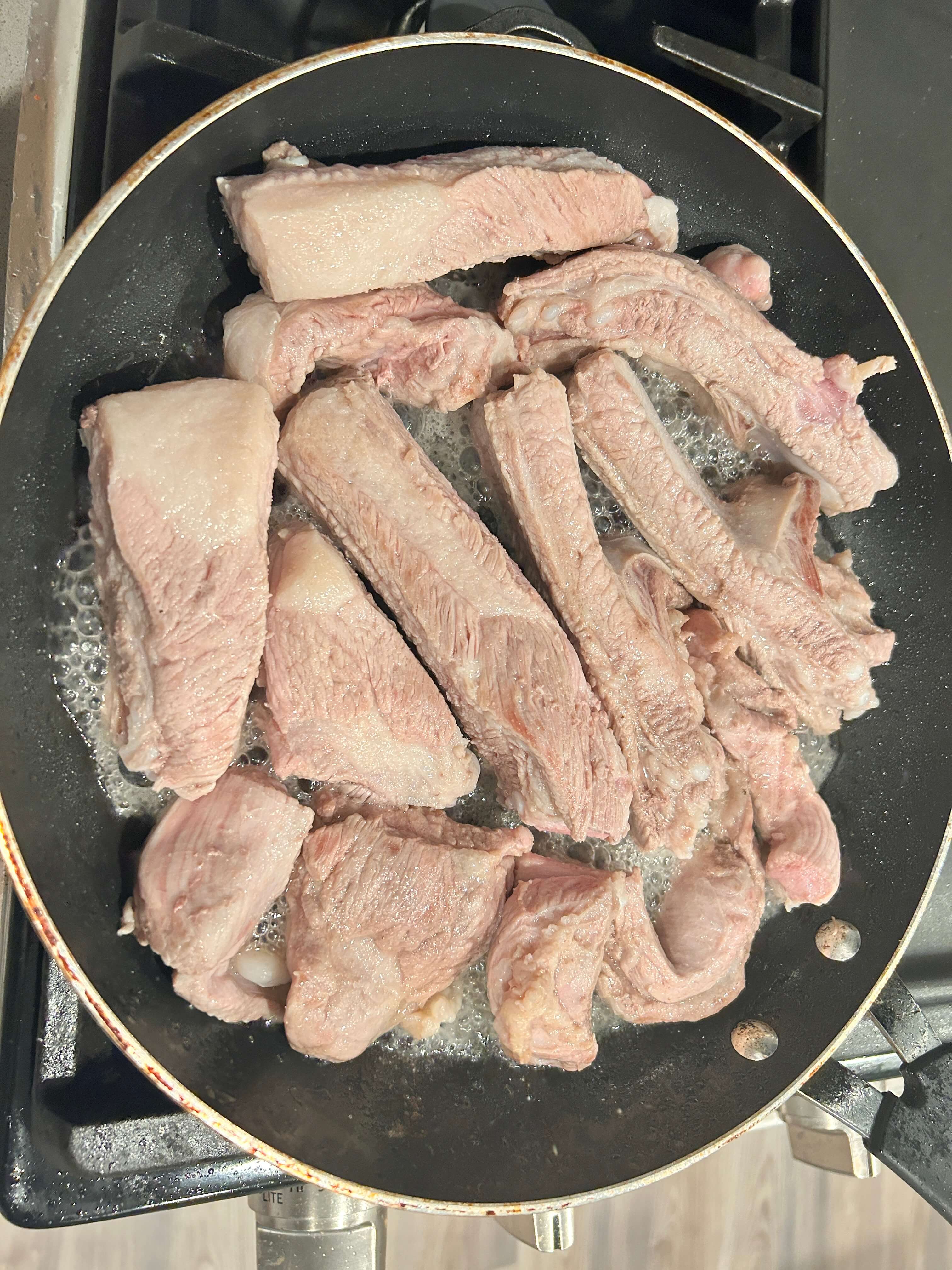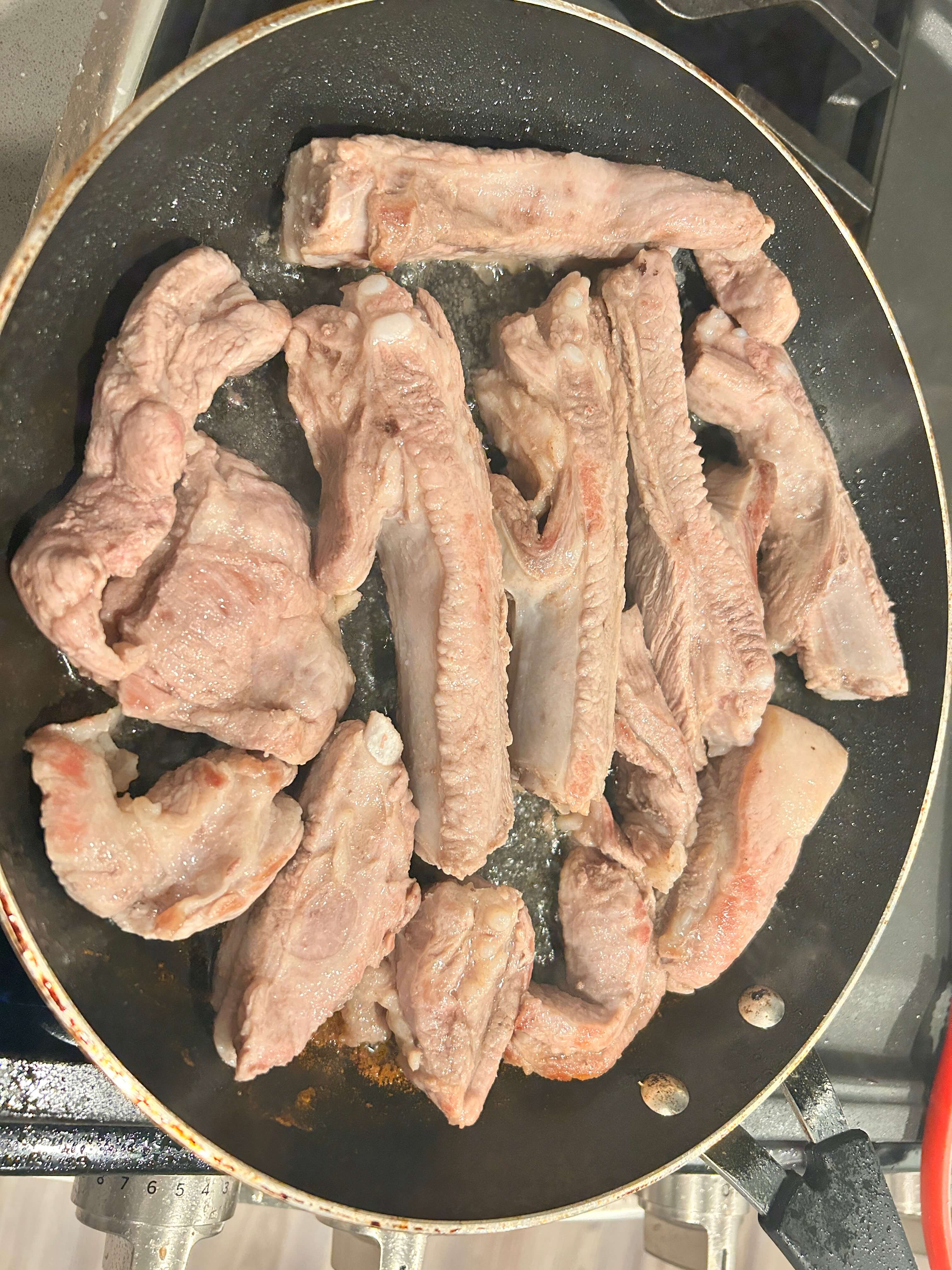 6. 등갈비를 넣고 소금 3꼬집을 넣어 줍니다.