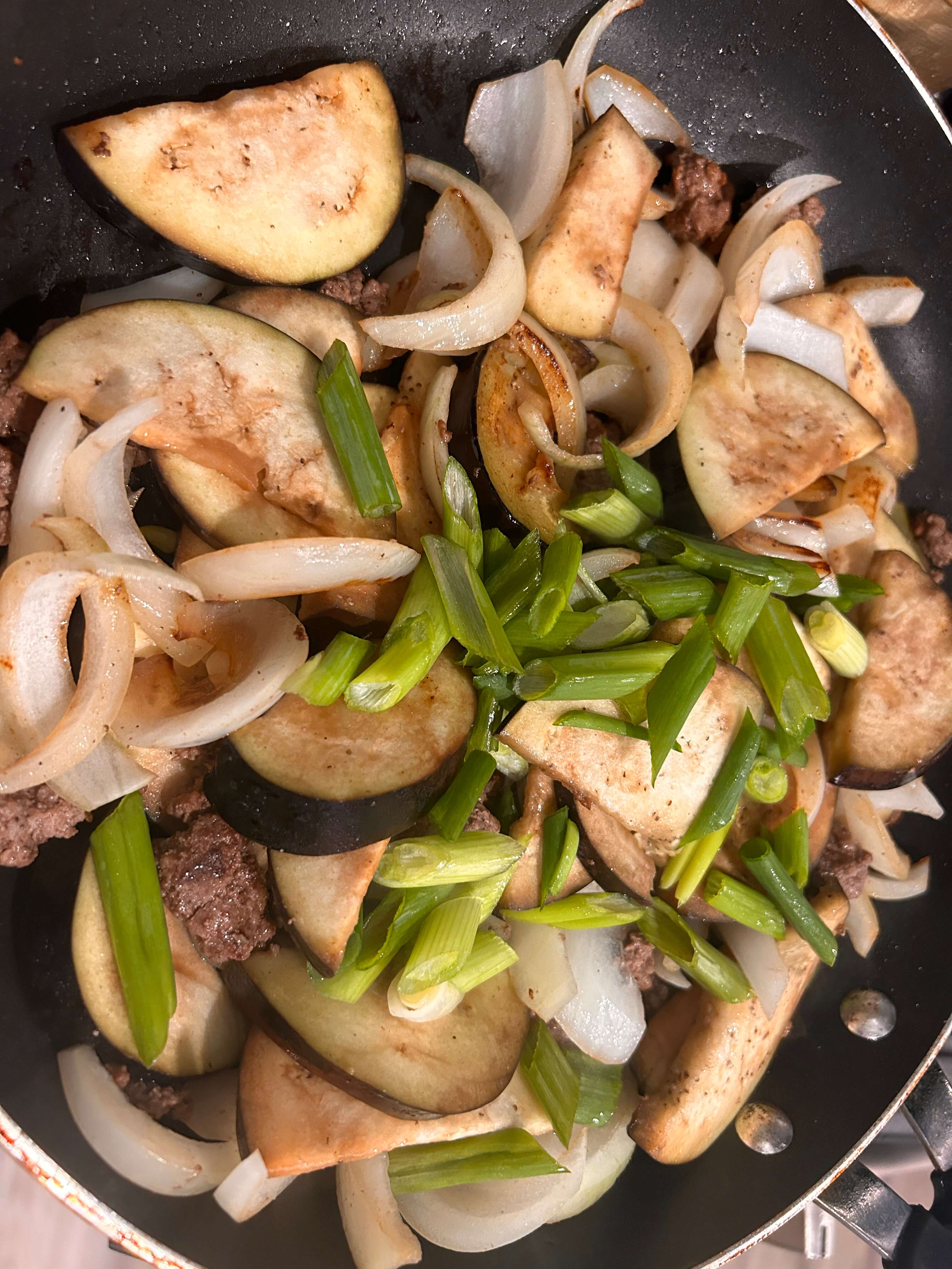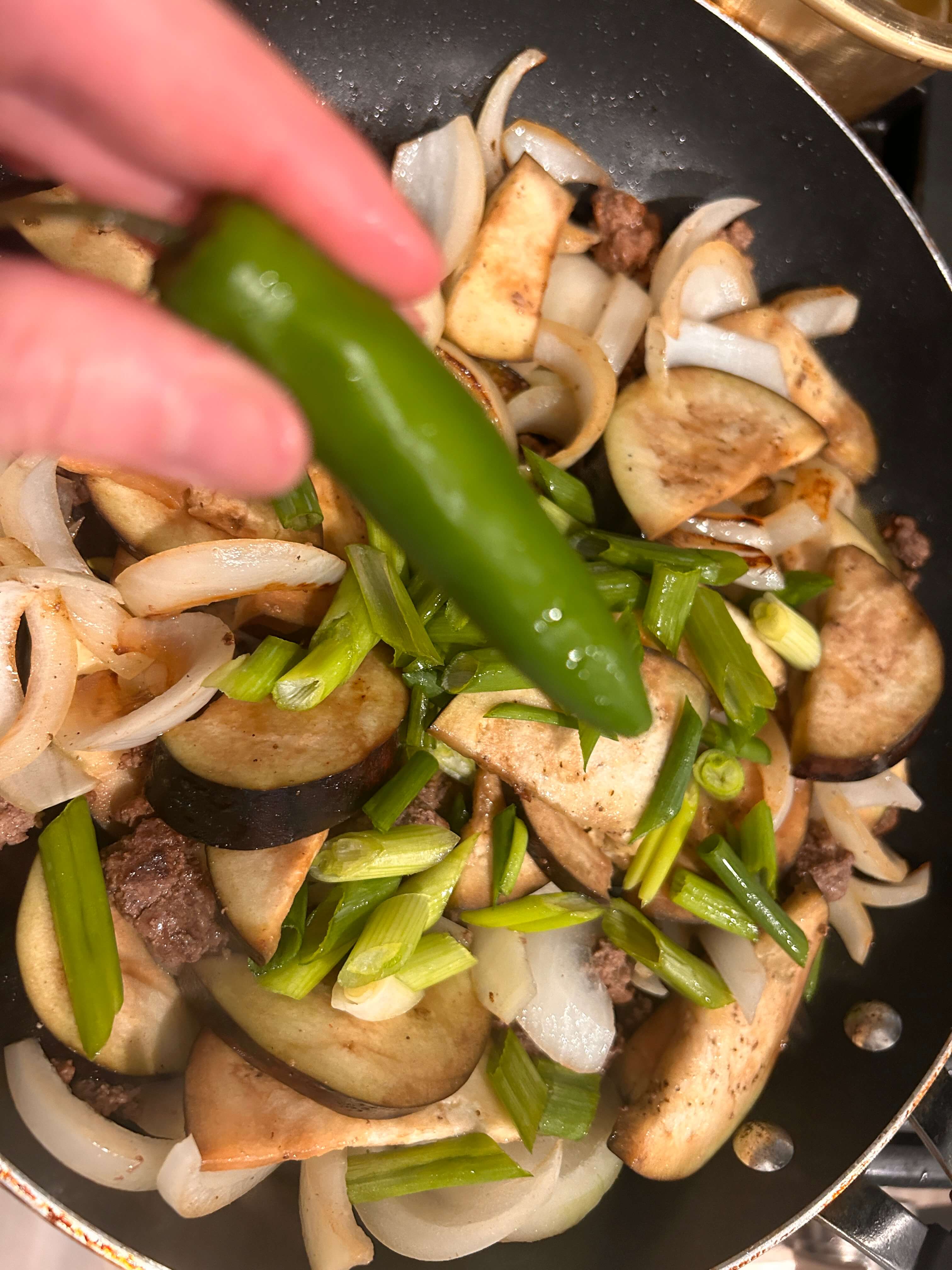 6. 가지 숨이 좀 죽으면 파와 고추를 썰어 넣어줍니다.