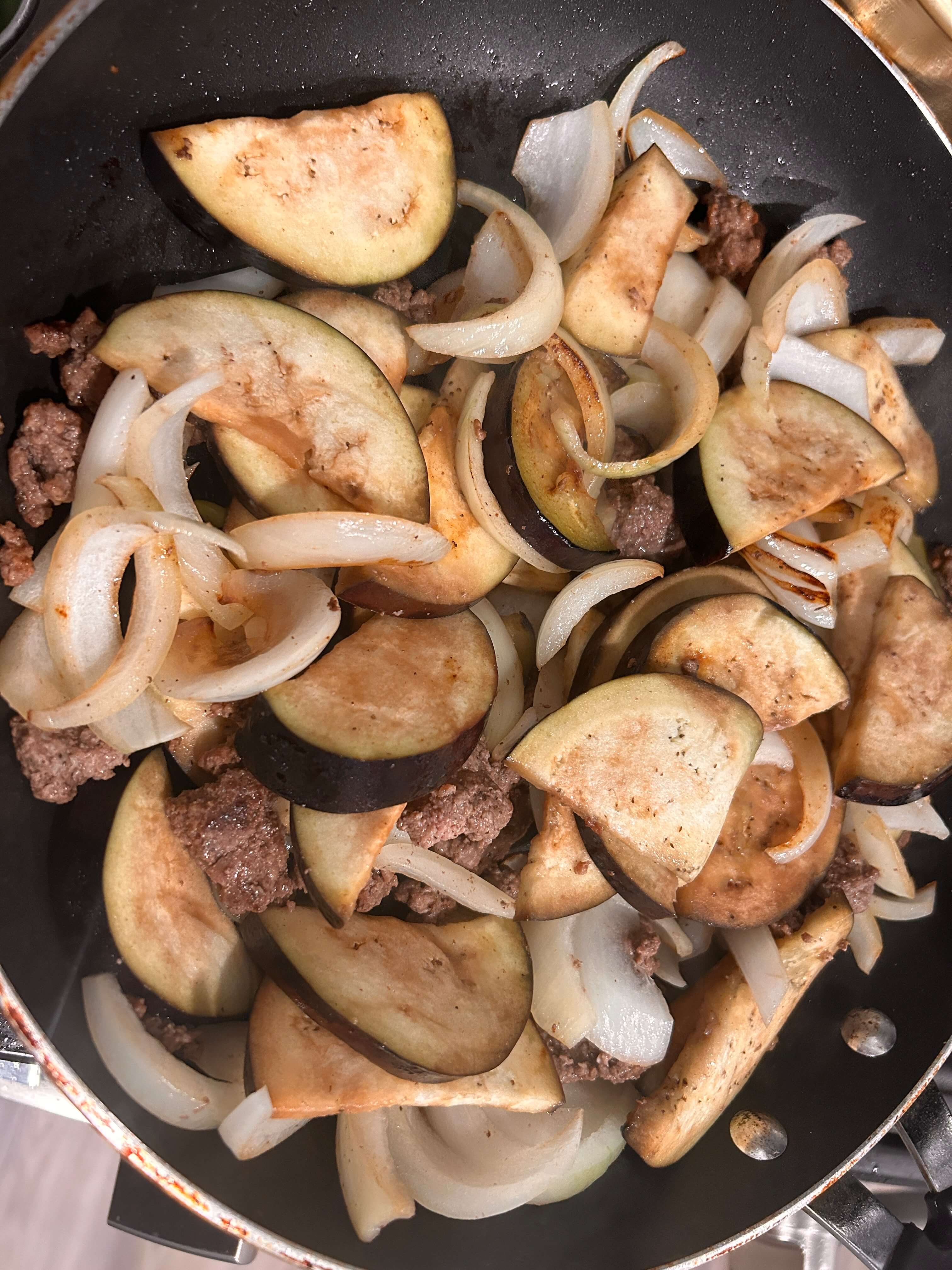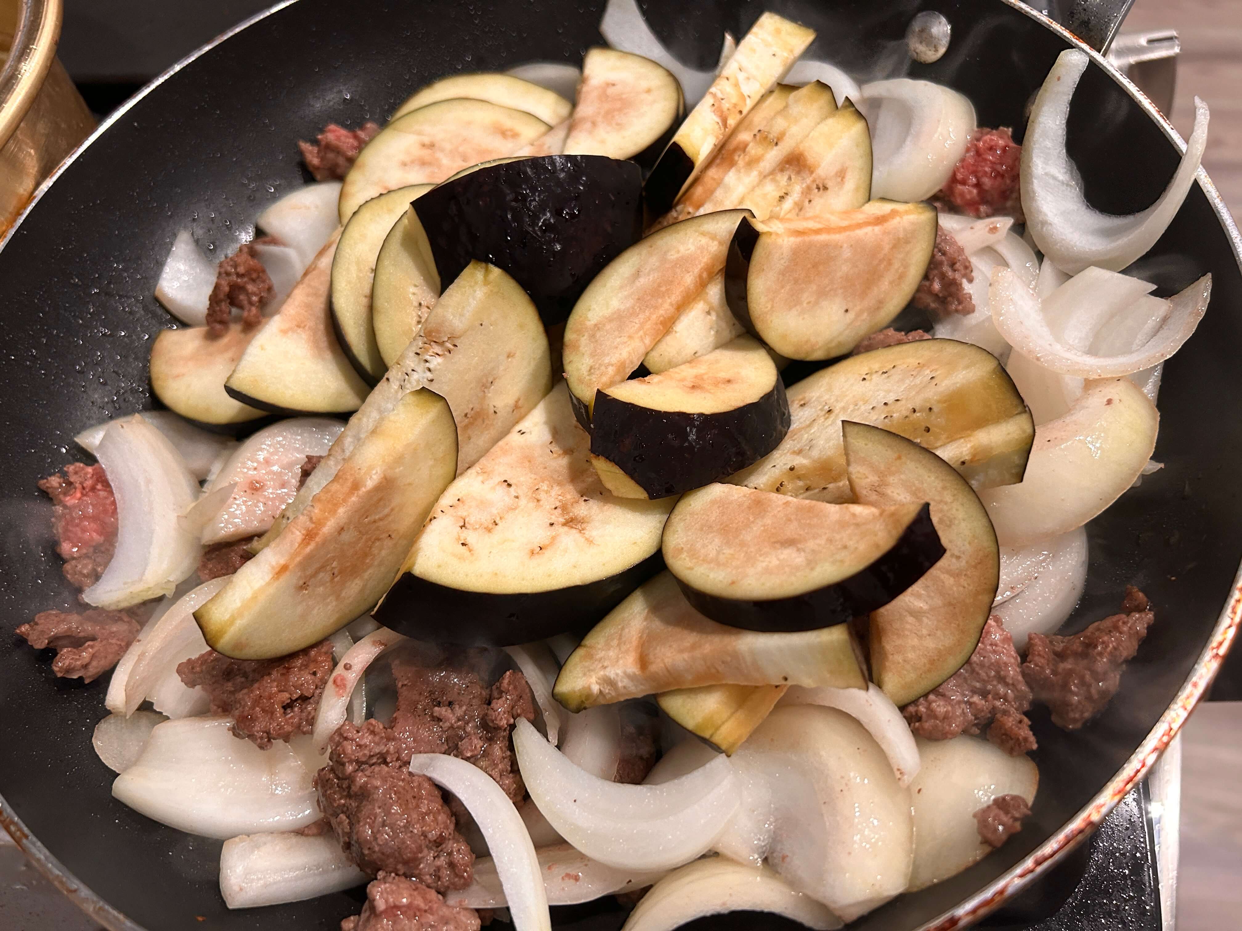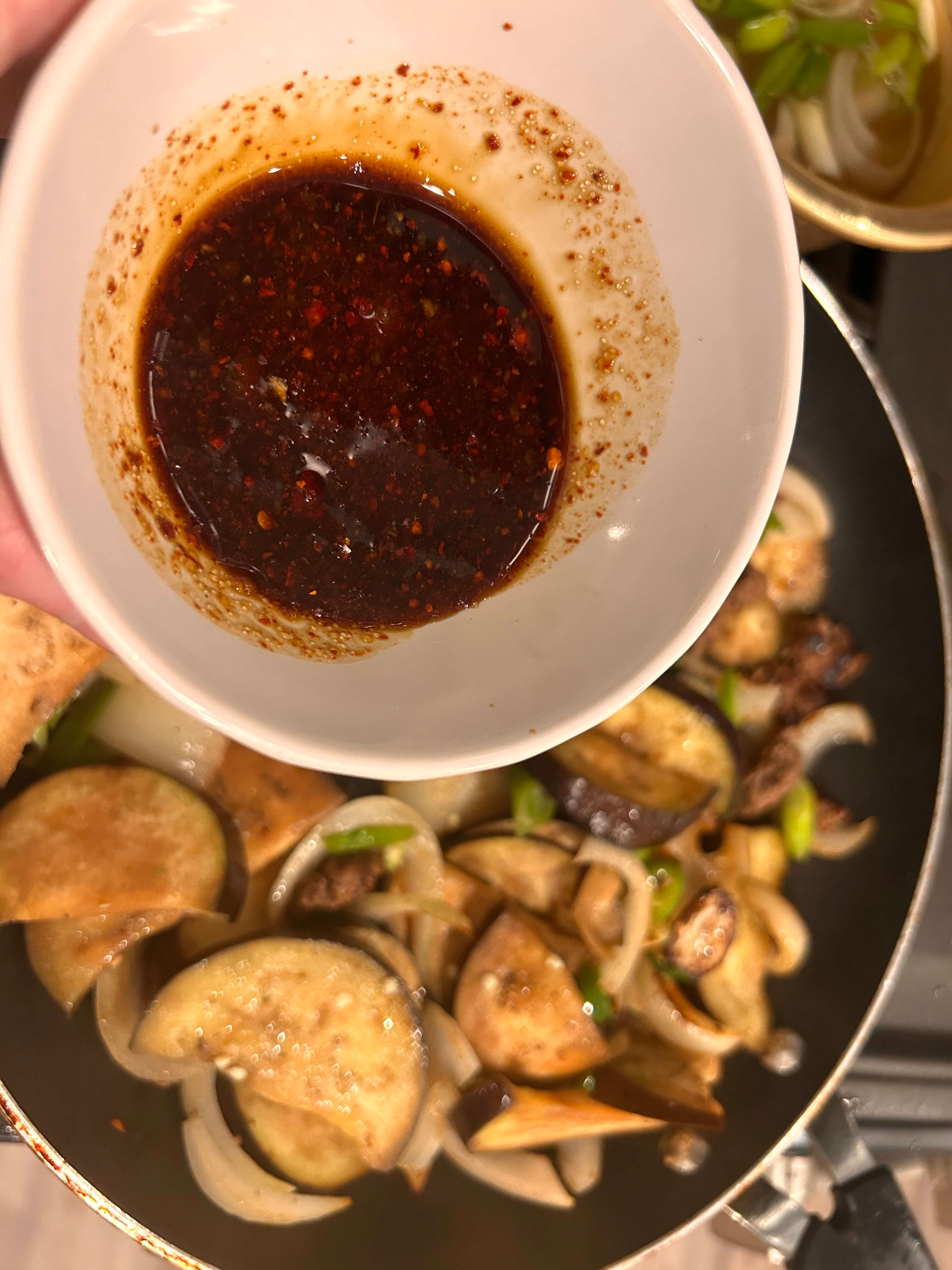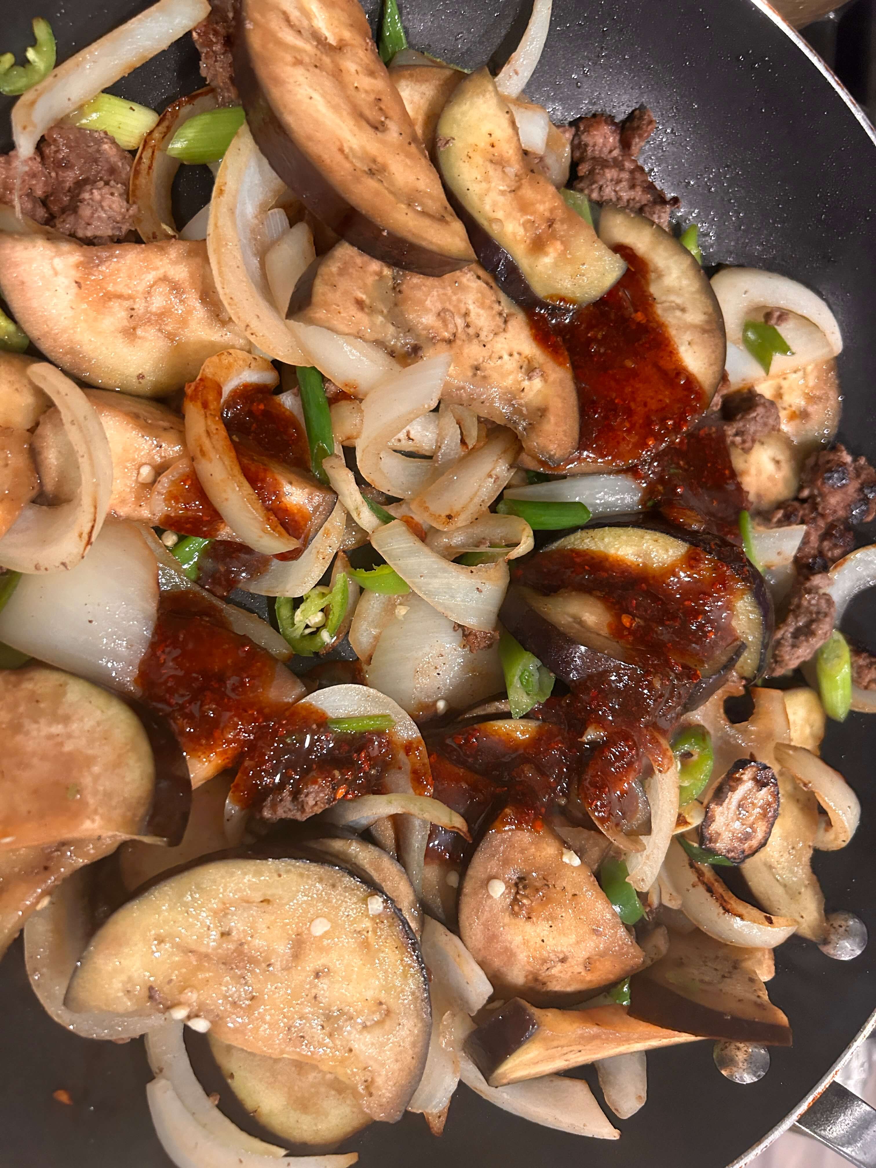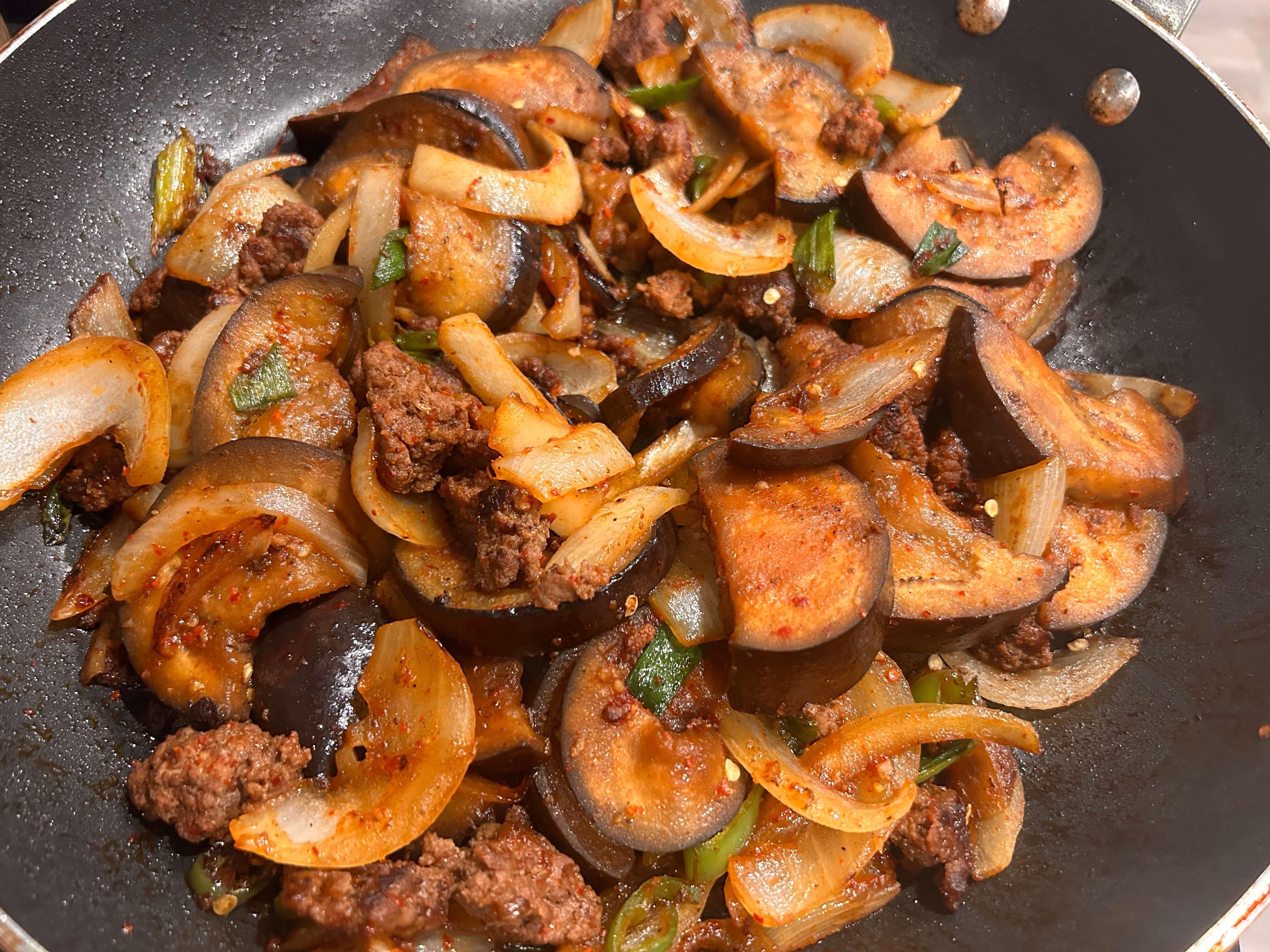 7. 가지가 말캉해질 때쯤, 준비된 양념소스를 넣고 골고루 볶아줍니다.