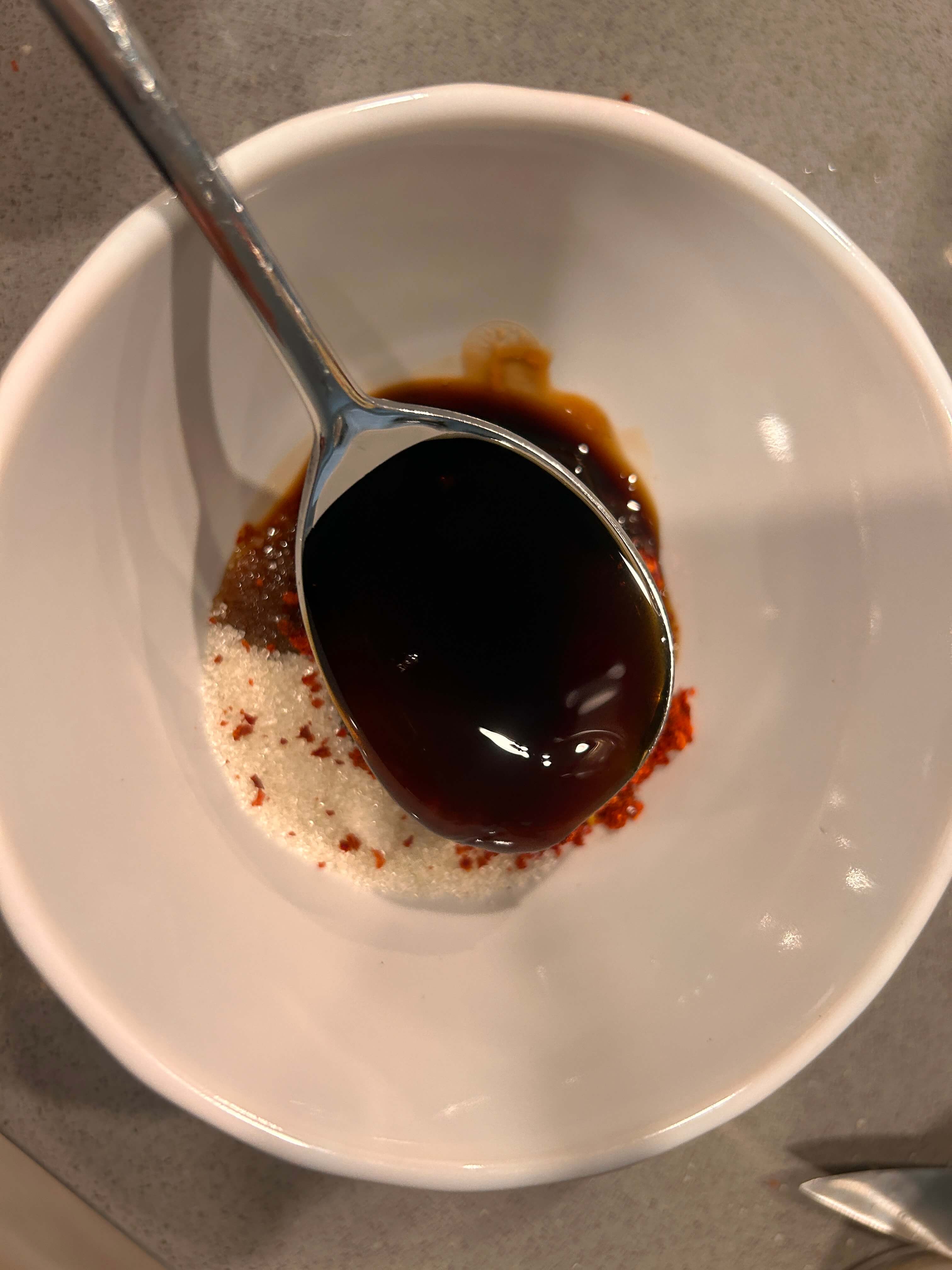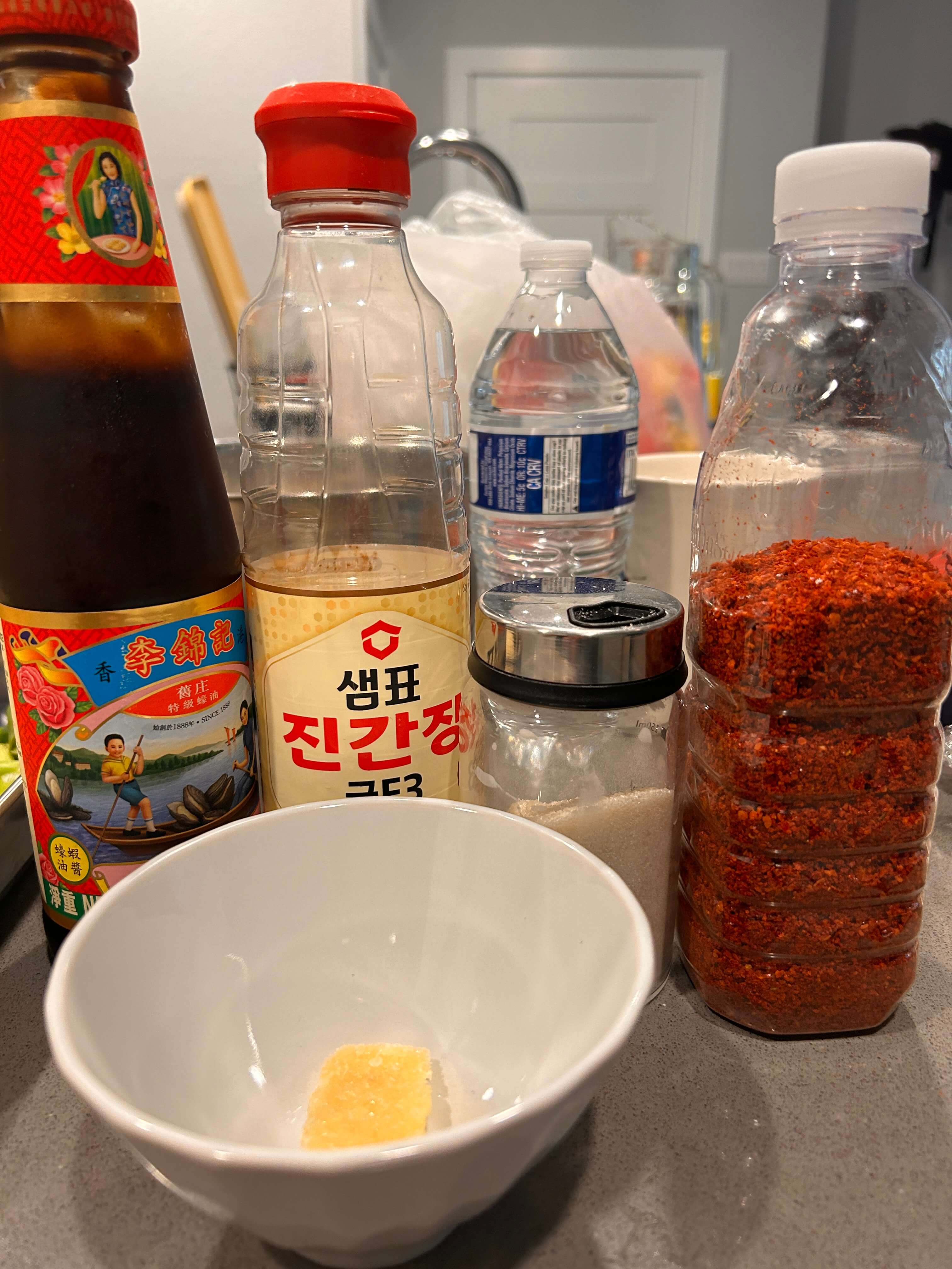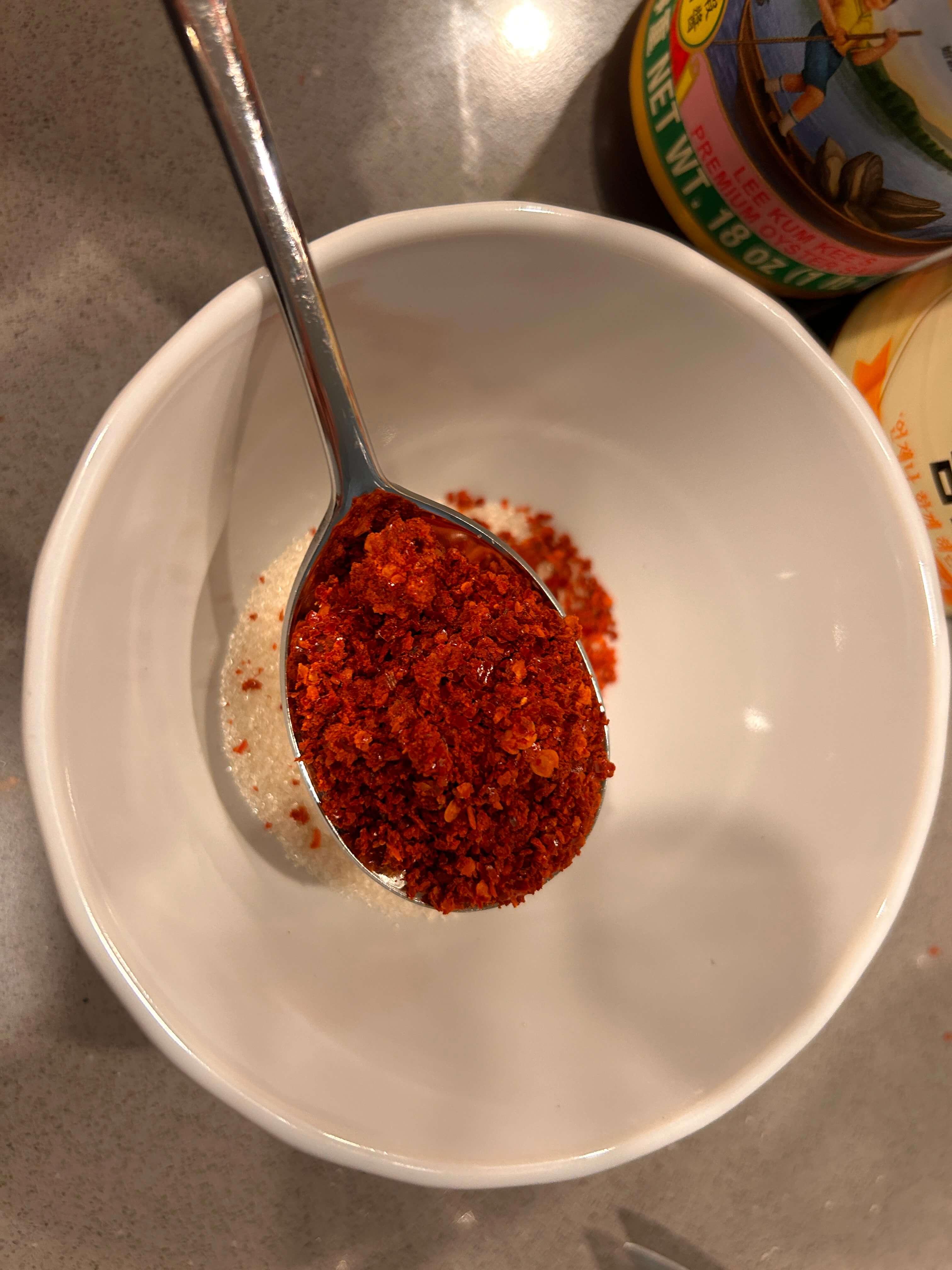 2. 양념으로 다진 마늘 1, 설탕 1, 고춧가루 1, 굴소스 1, 간장 2 숟갈을 넣고 잘 섞어줍니다.