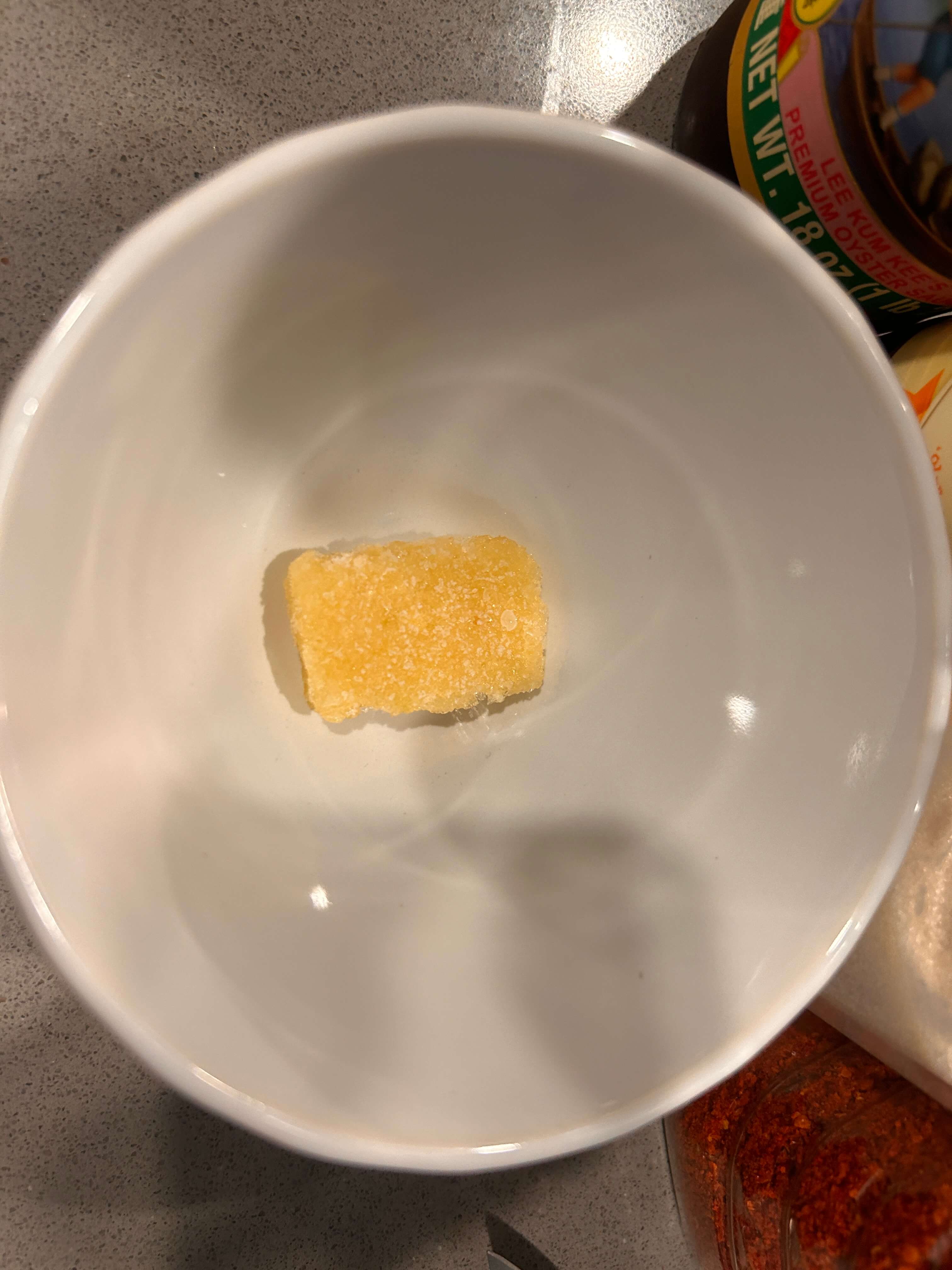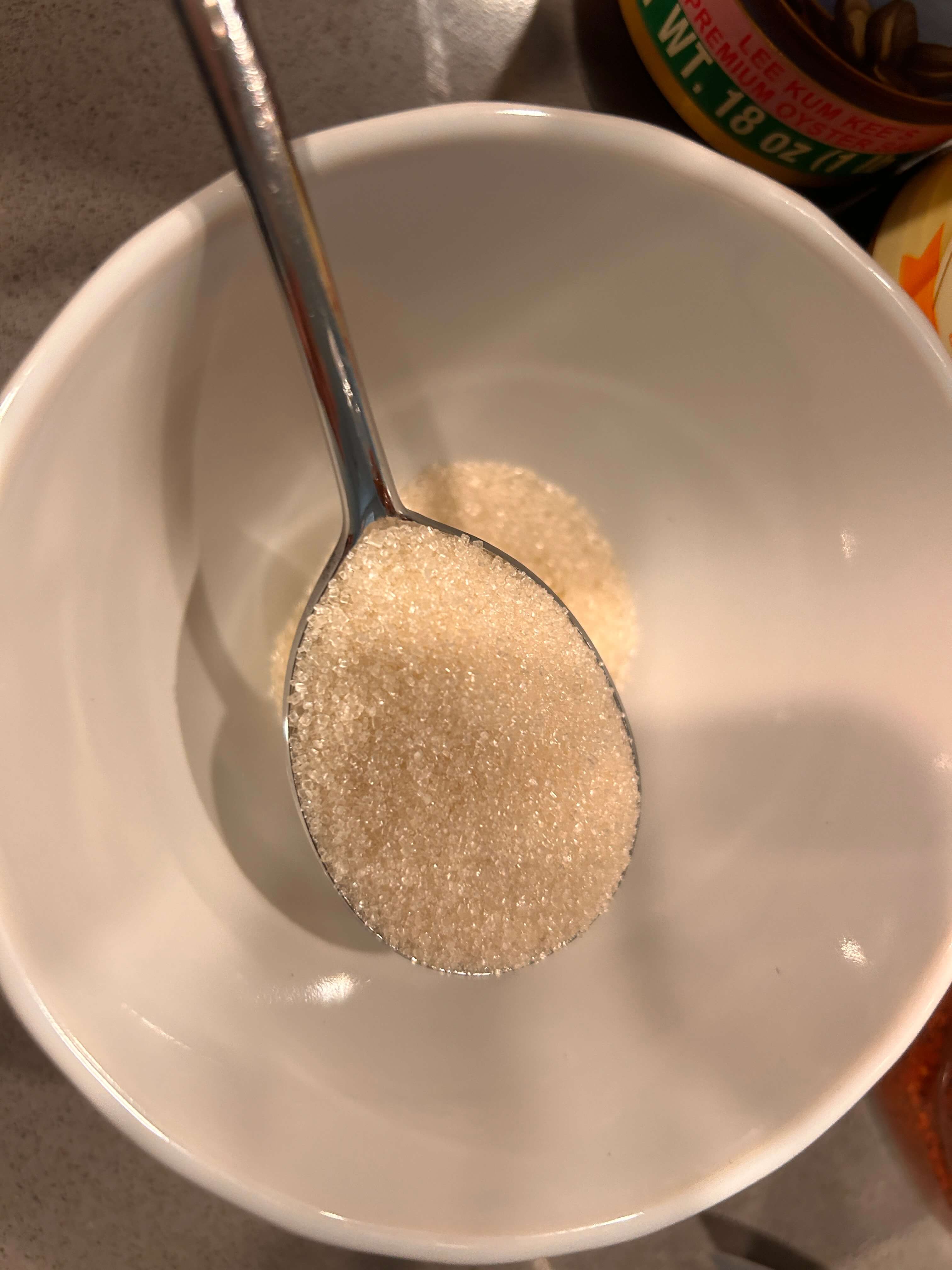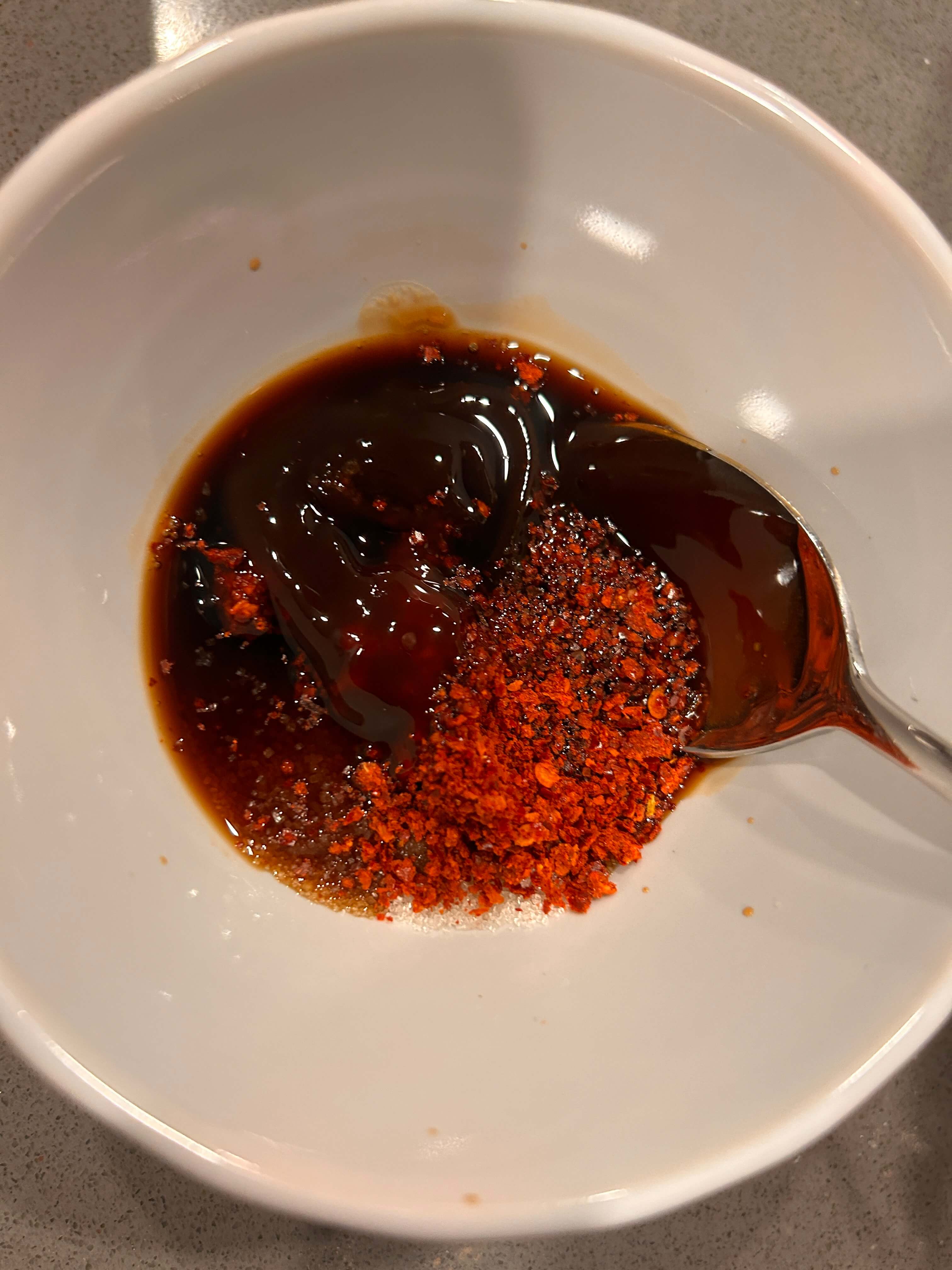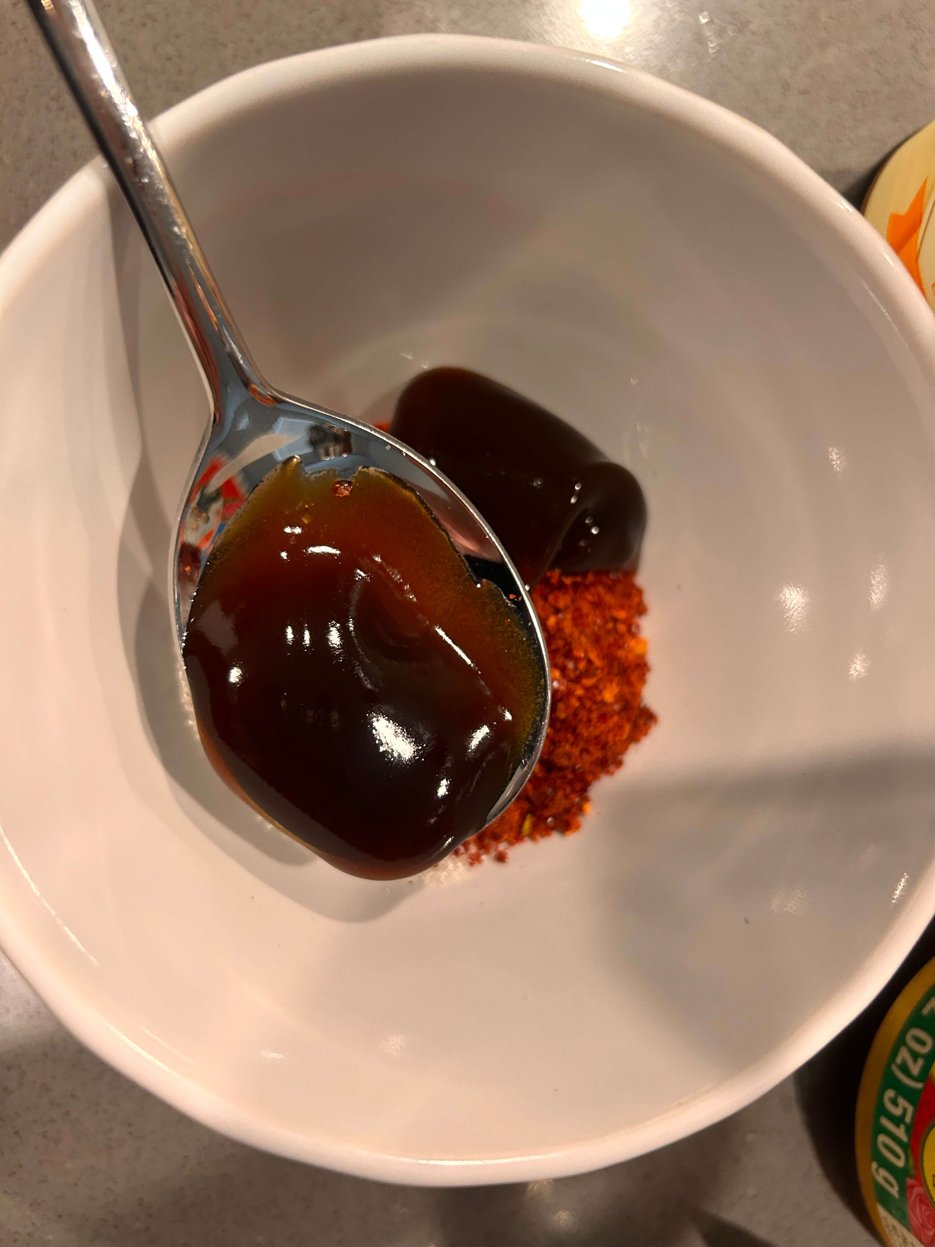 2. 양념으로 다진 마늘 1, 설탕 1, 고춧가루 1, 굴소스 1, 간장 2 숟갈을 넣고 잘 섞어줍니다.