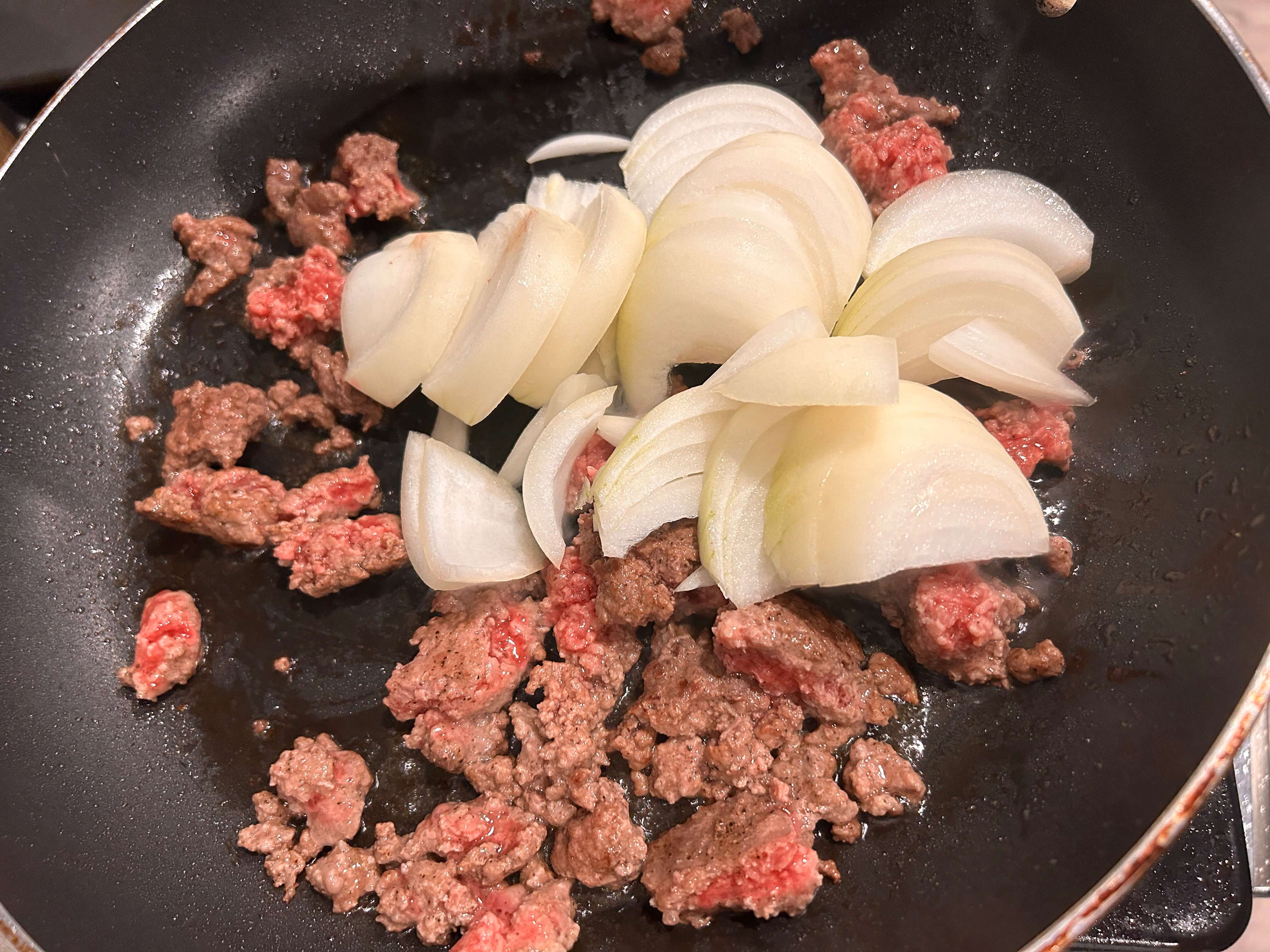 4. 고기를 볶다가 양파를 넣고 볶아줍니다.