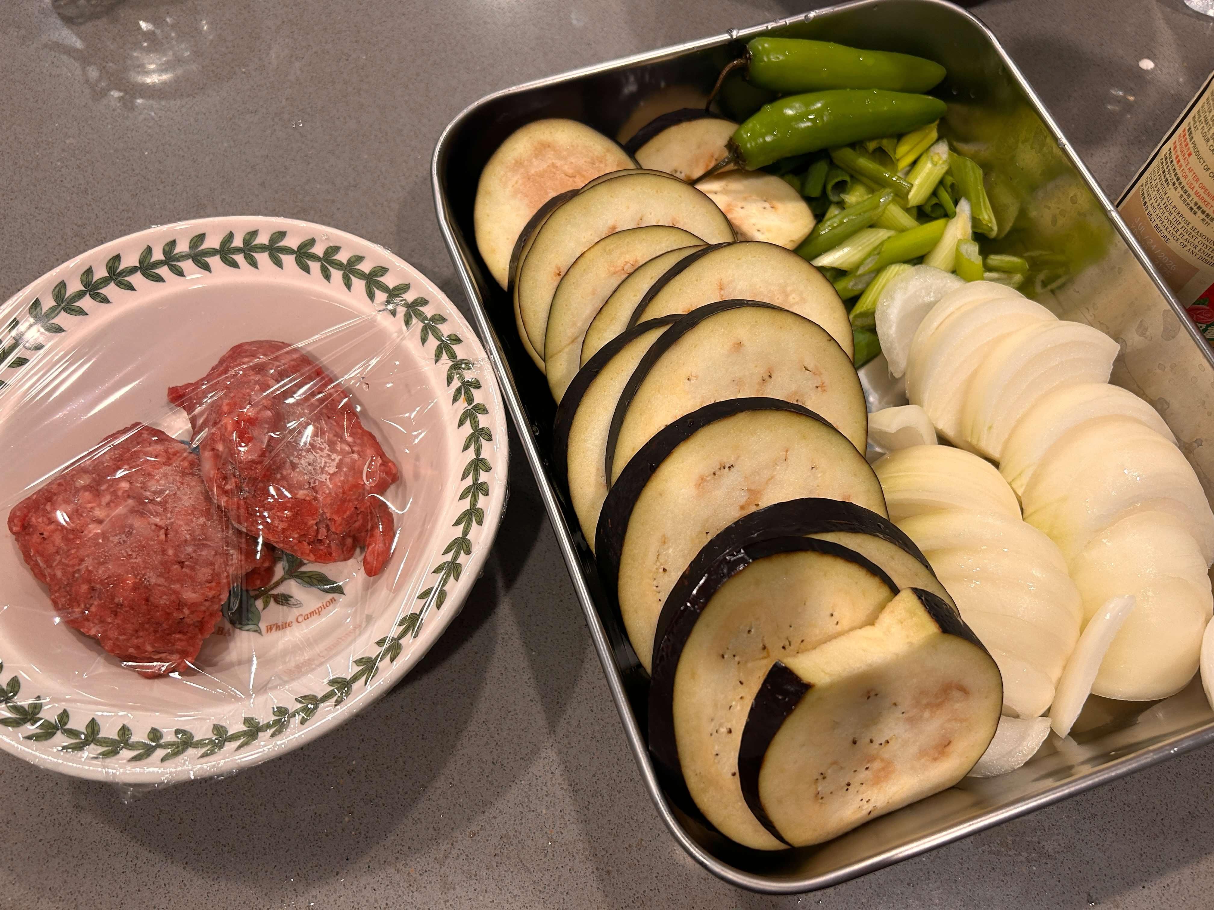1. 다진 고기, 가지, 각종야채 (양파, 대파, 청양고추)를 손질해 준비해 줍니다.