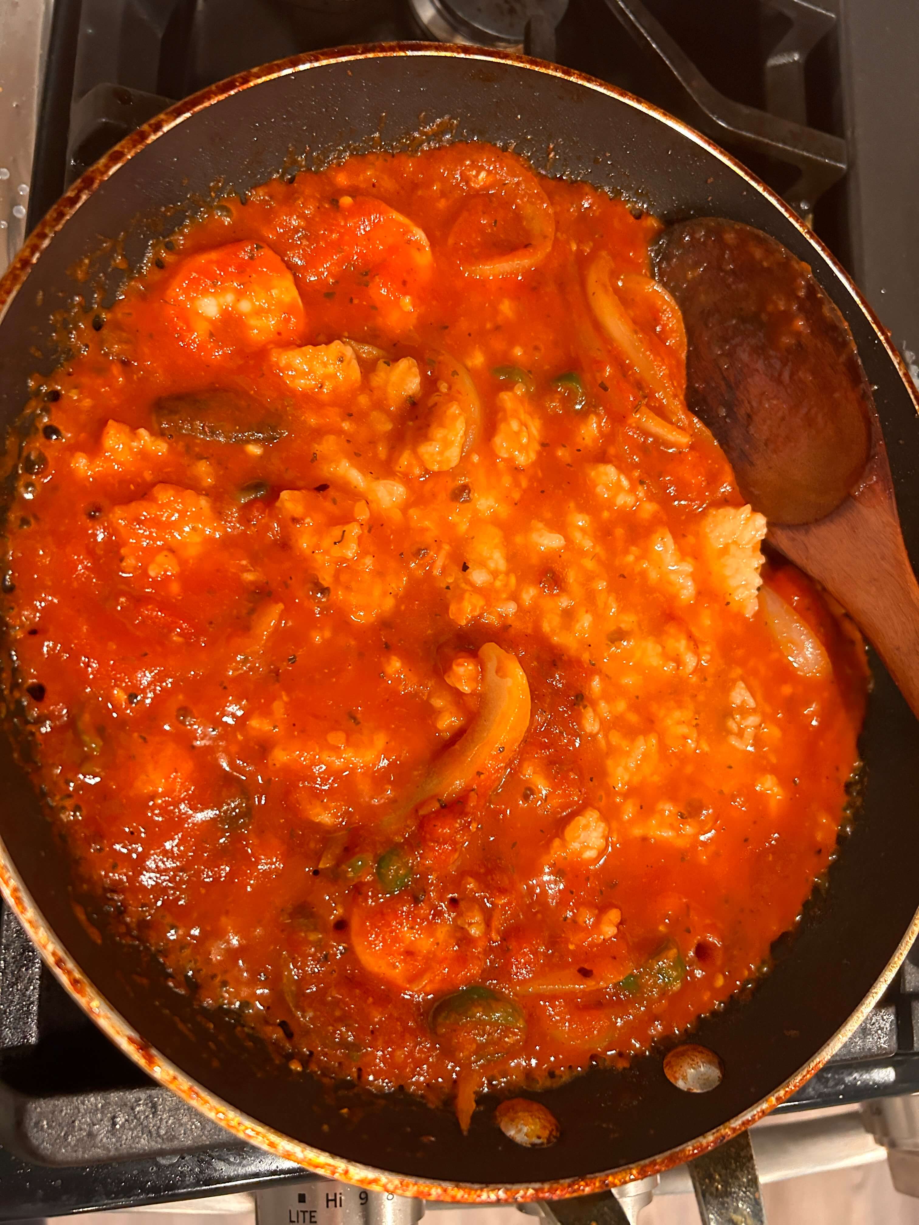 4. 잘 볶은 재료에 토마토소스를 넣어 잘 볶아줍니다.