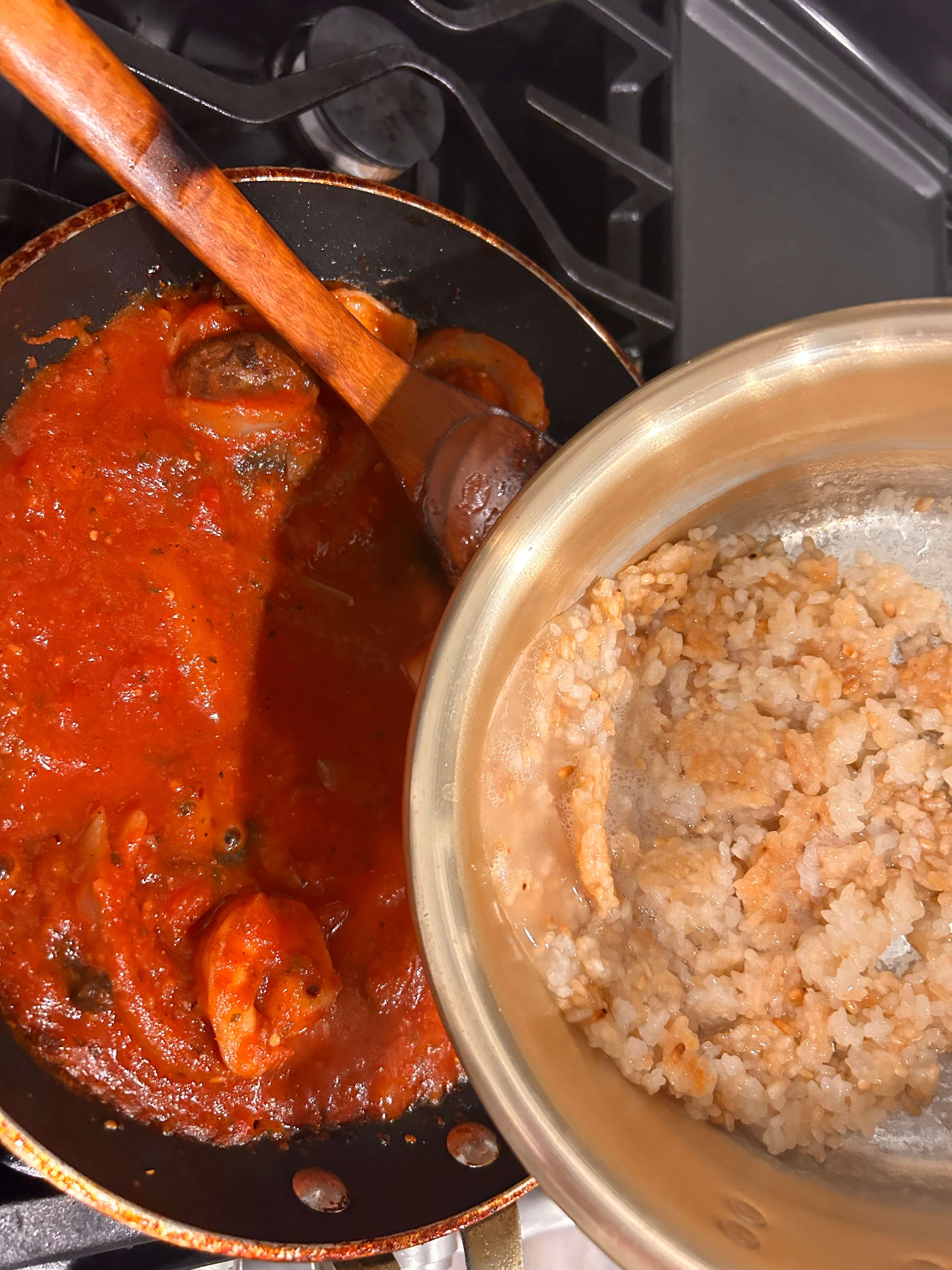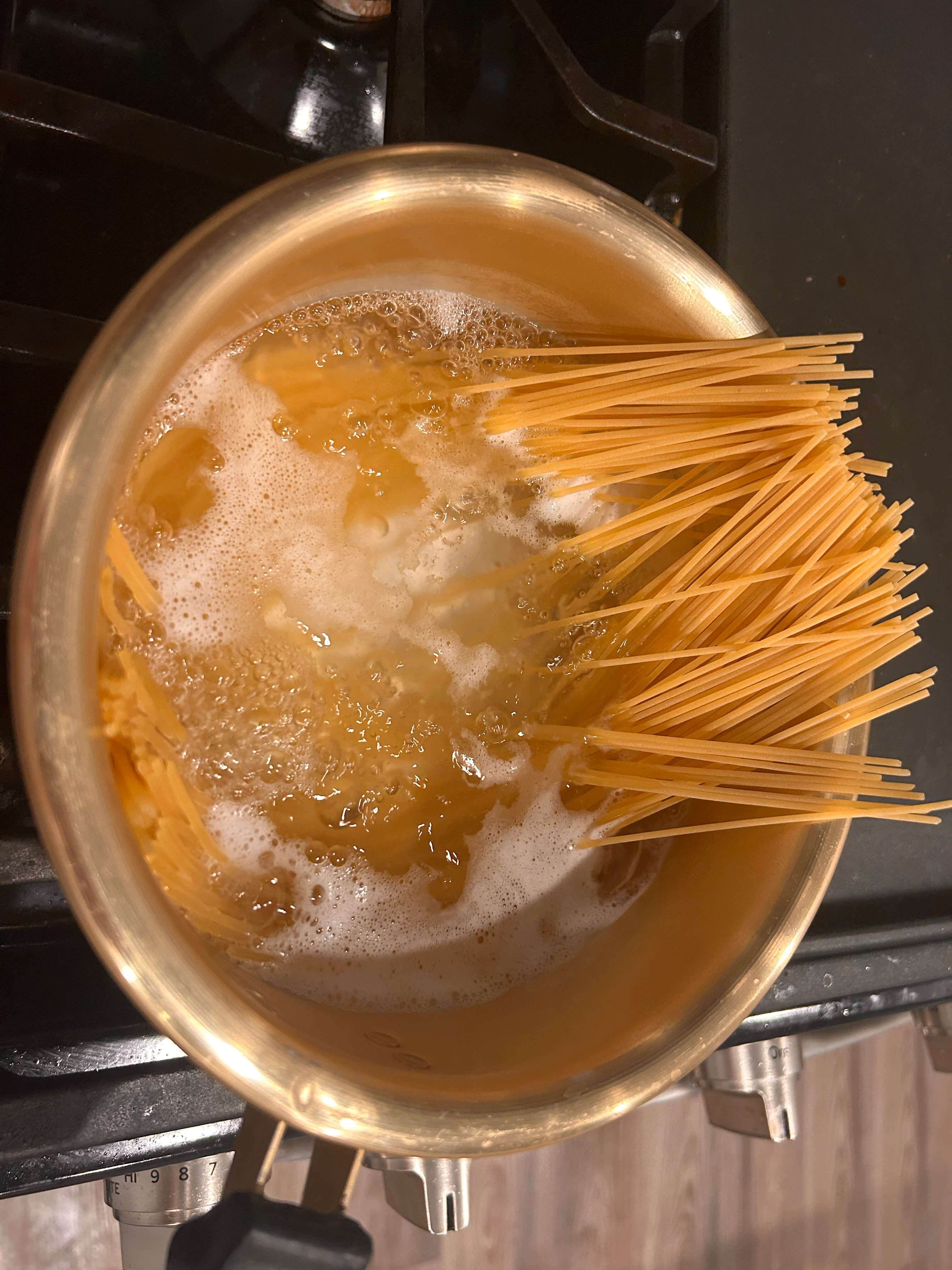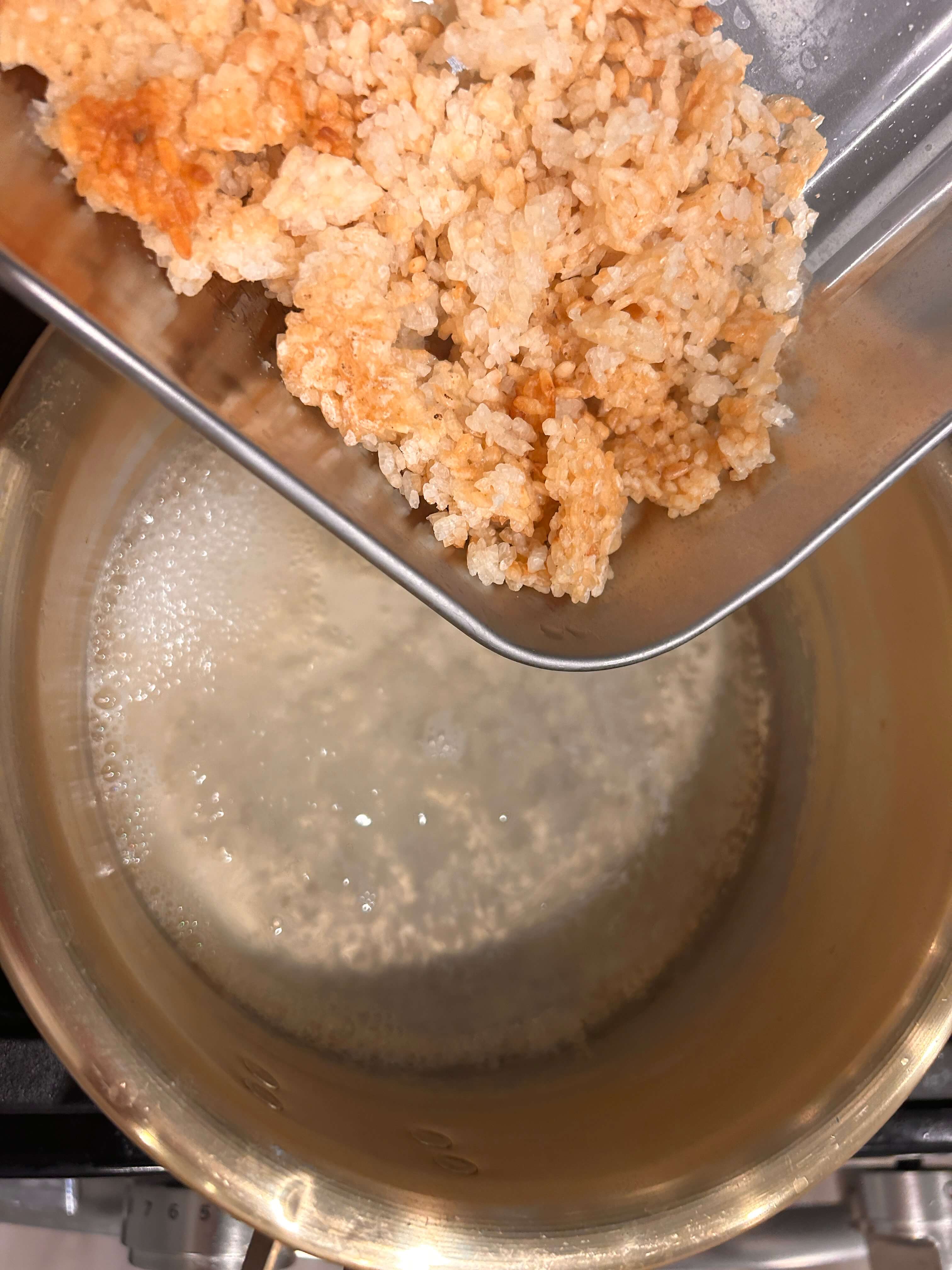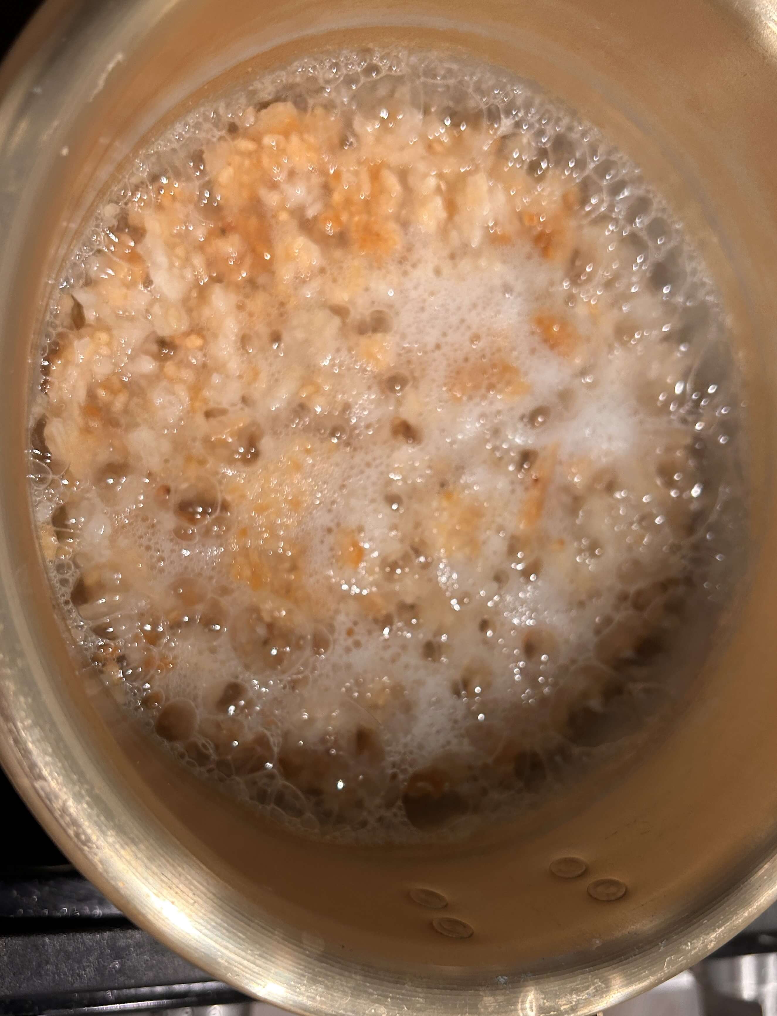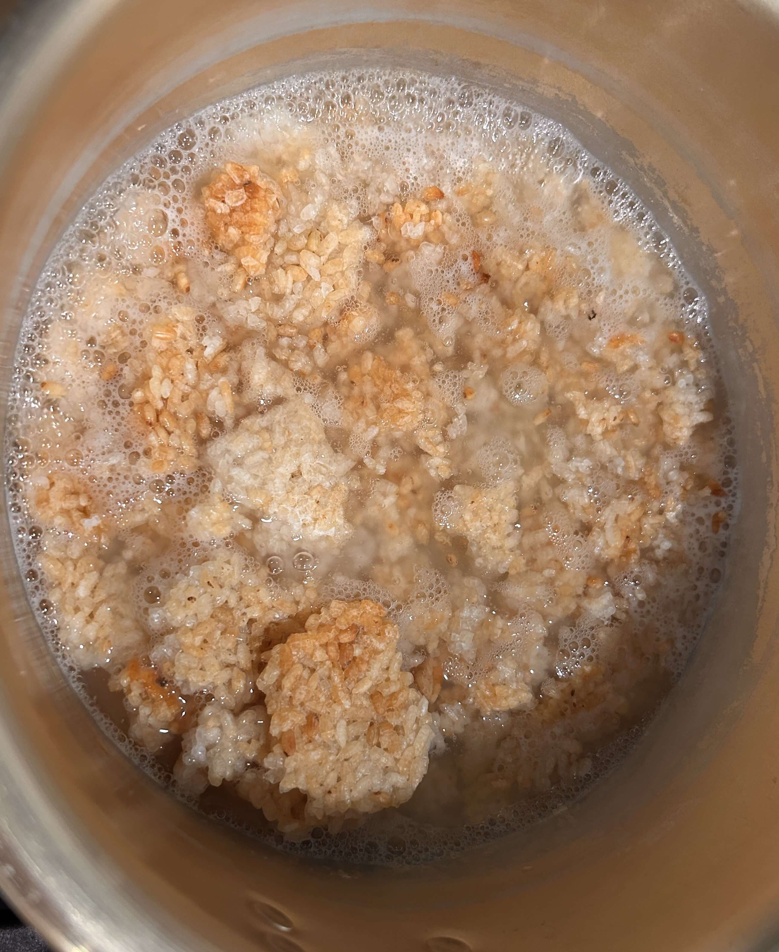 6. 파스타면수에 누룽지를 넣어 잘 불려줍니다.
